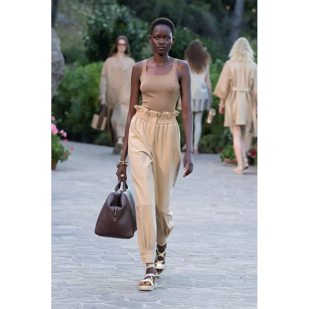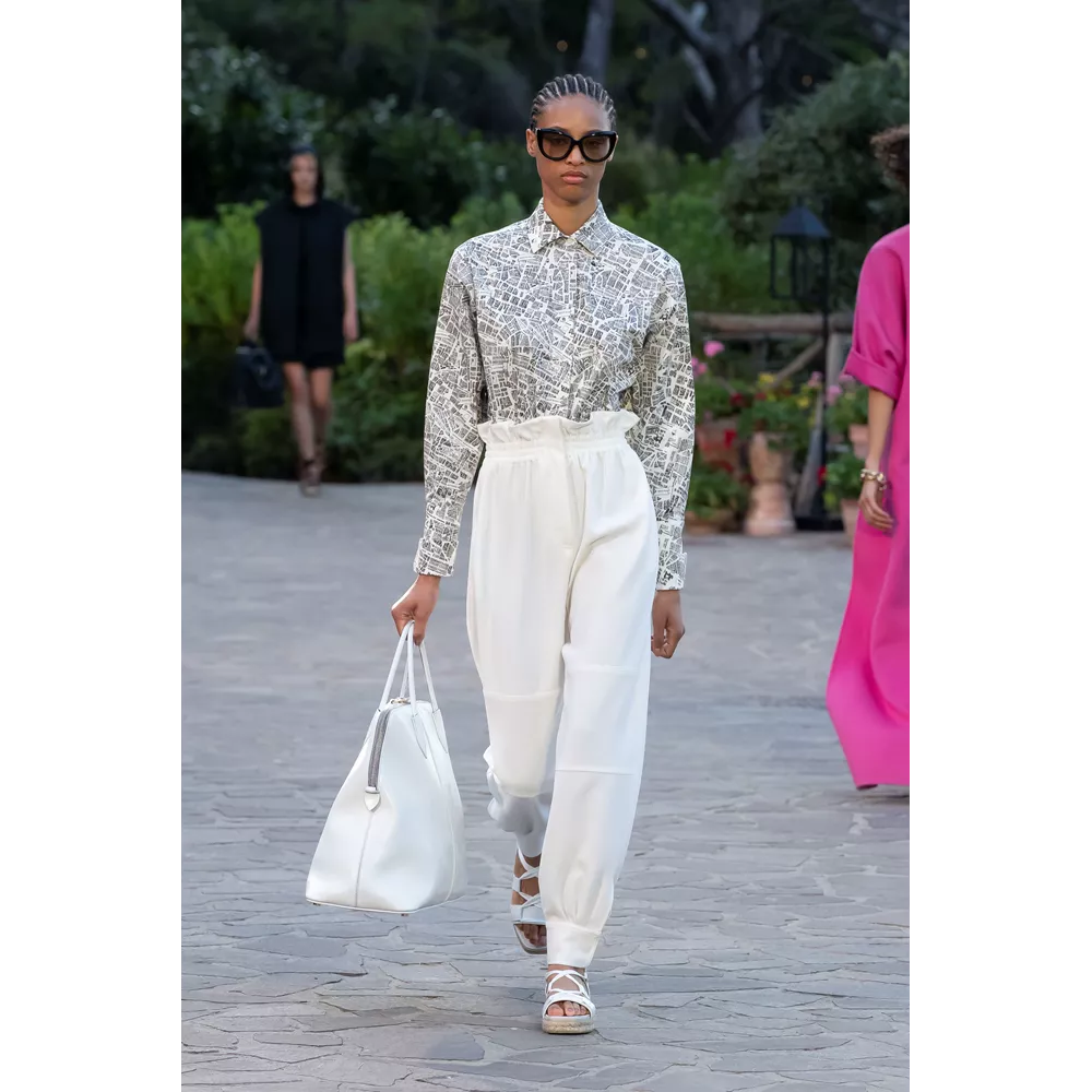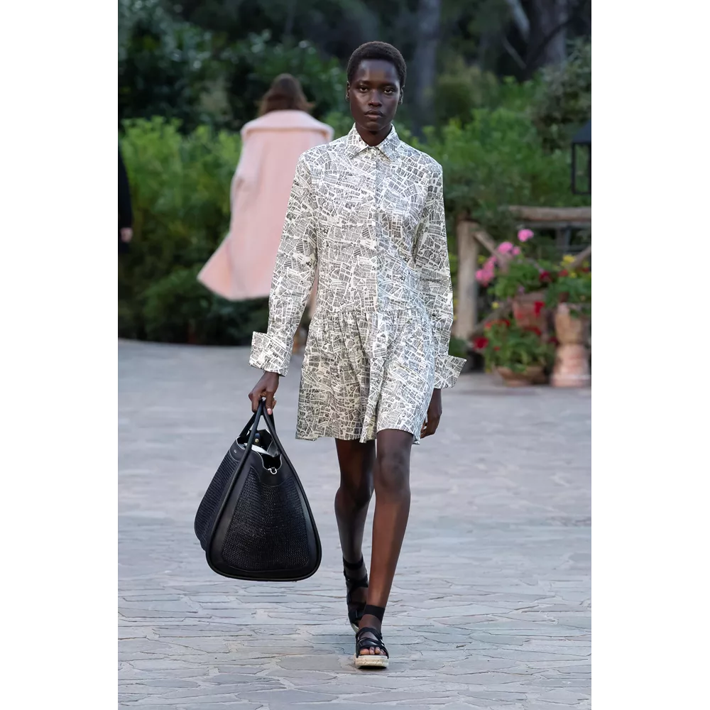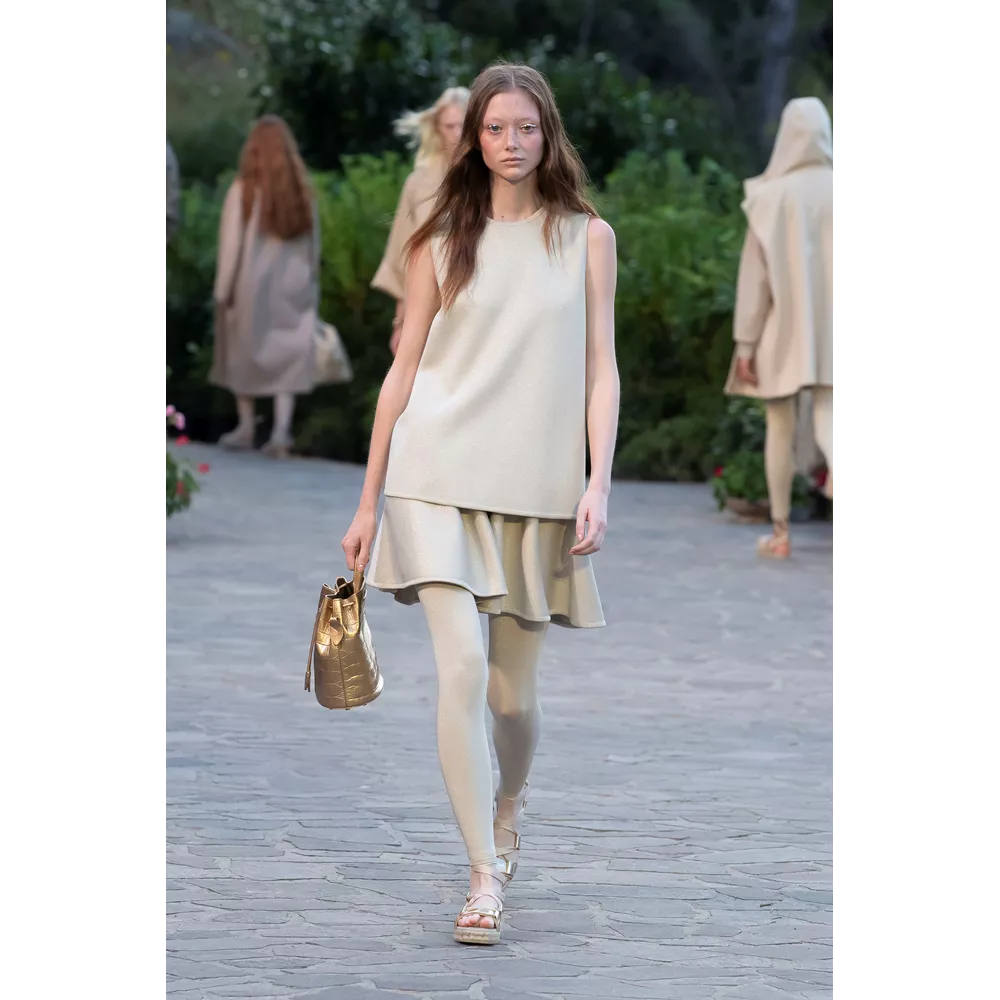 Οι mid-century σιλουέτες έχουν δουλευτεί με ξεκάθαρες επιρροές από το sportwear προσφέροντας στη συλλογή μία σύγχρονη, go-anywhere κομψότητα, ενώ η νέα σιλουέτα περιστρέφεται γύρω από μία φούστα που μαζεύει ακριβώς κάτω από τη μέση και μπορεί να φορεθεί με ή χωρίς κολάν. To μοτίβο του "μαζέματος" (σούρες) επαναλαμβάνεται και σε άλλα κομμάτια της συλλογής όπως σ' ένα κοστούμι, σε ένα αέρινο φόρεμα κι ένα τζάκετ. Η υβριδική εσπαντρίγια - σανδάλι γίνεται το ζευγάρι που συνοδεύει κάθε look της collection, ενώ από τα αξεσουάρ δεν απουσιάζουν οι large δερμάτινες ή ράφια travel bags που μάς υπενθυμίζουν και την αρχική έμπνευση της συλλογής: τα ταξίδια.