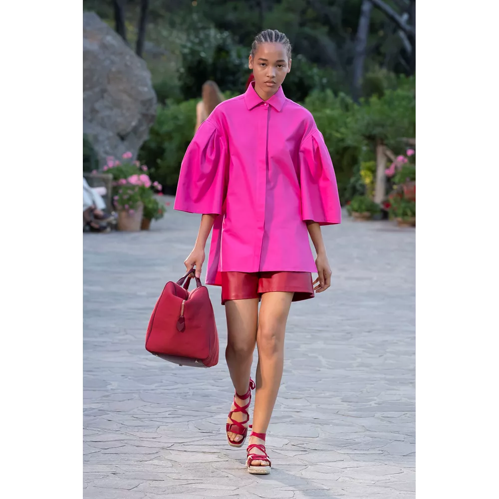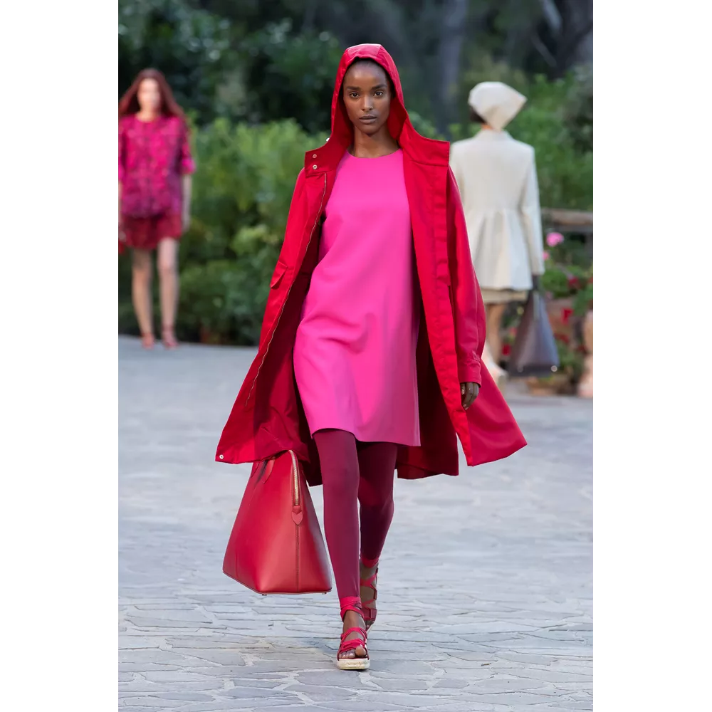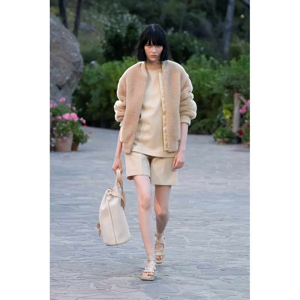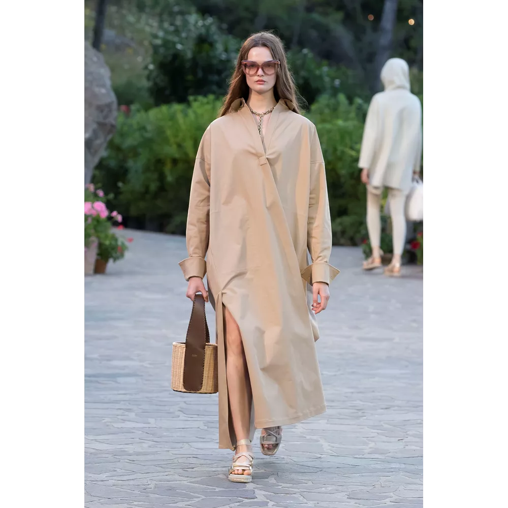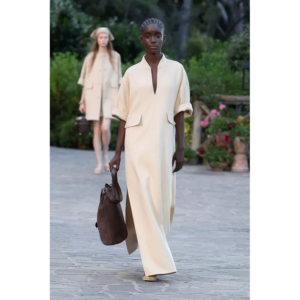 Οι mid-century σιλουέτες έχουν δουλευτεί με ξεκάθαρες επιρροές από το sportwear προσφέροντας στη συλλογή μία σύγχρονη, go-anywhere κομψότητα, ενώ η νέα σιλουέτα περιστρέφεται γύρω από μία φούστα που μαζεύει ακριβώς κάτω από τη μέση και μπορεί να φορεθεί με ή χωρίς κολάν. To μοτίβο του "μαζέματος" (σούρες) επαναλαμβάνεται και σε άλλα κομμάτια της συλλογής όπως σ' ένα κοστούμι, σε ένα αέρινο φόρεμα κι ένα τζάκετ. Η υβριδική εσπαντρίγια - σανδάλι γίνεται το ζευγάρι που συνοδεύει κάθε look της collection, ενώ από τα αξεσουάρ δεν απουσιάζουν οι large δερμάτινες ή ράφια travel bags που μάς υπενθυμίζουν και την αρχική έμπνευση της συλλογής: τα ταξίδια.