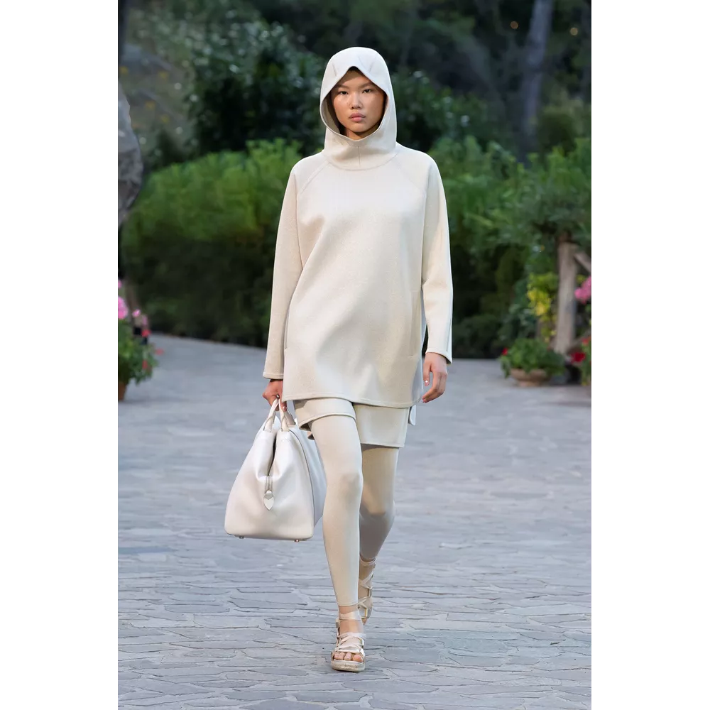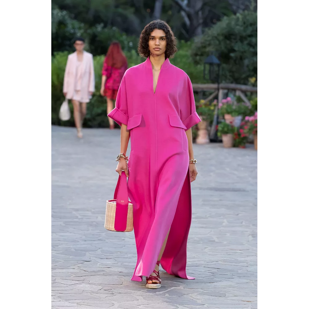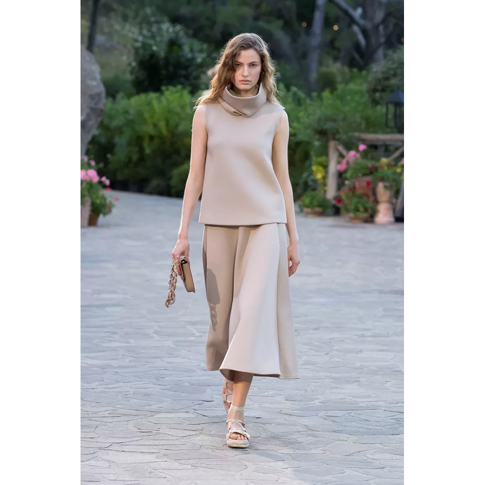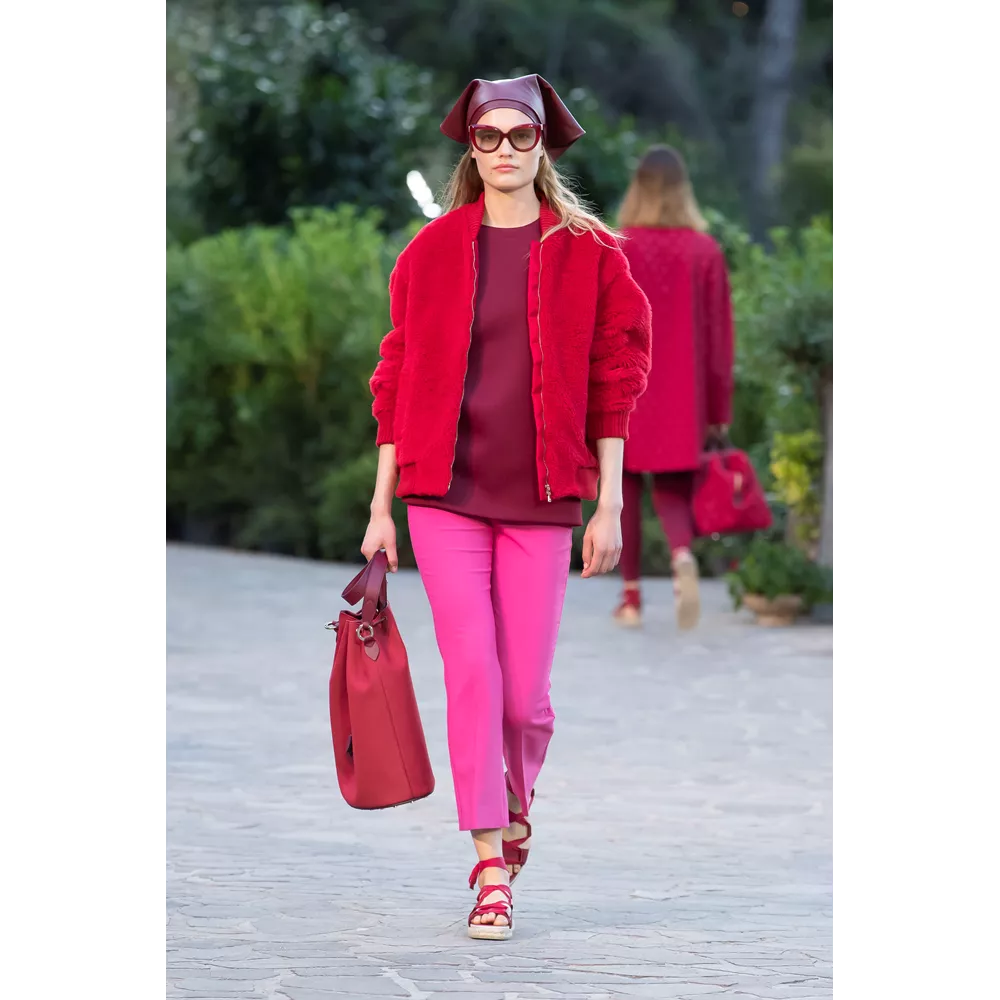 Οι mid-century σιλουέτες έχουν δουλευτεί με ξεκάθαρες επιρροές από το sportwear προσφέροντας στη συλλογή μία σύγχρονη, go-anywhere κομψότητα, ενώ η νέα σιλουέτα περιστρέφεται γύρω από μία φούστα που μαζεύει ακριβώς κάτω από τη μέση και μπορεί να φορεθεί με ή χωρίς κολάν. To μοτίβο του "μαζέματος" (σούρες) επαναλαμβάνεται και σε άλλα κομμάτια της συλλογής όπως σ' ένα κοστούμι, σε ένα αέρινο φόρεμα κι ένα τζάκετ. Η υβριδική εσπαντρίγια - σανδάλι γίνεται το ζευγάρι που συνοδεύει κάθε look της collection, ενώ από τα αξεσουάρ δεν απουσιάζουν οι large δερμάτινες ή ράφια travel bags που μάς υπενθυμίζουν και την αρχική έμπνευση της συλλογής: τα ταξίδια.