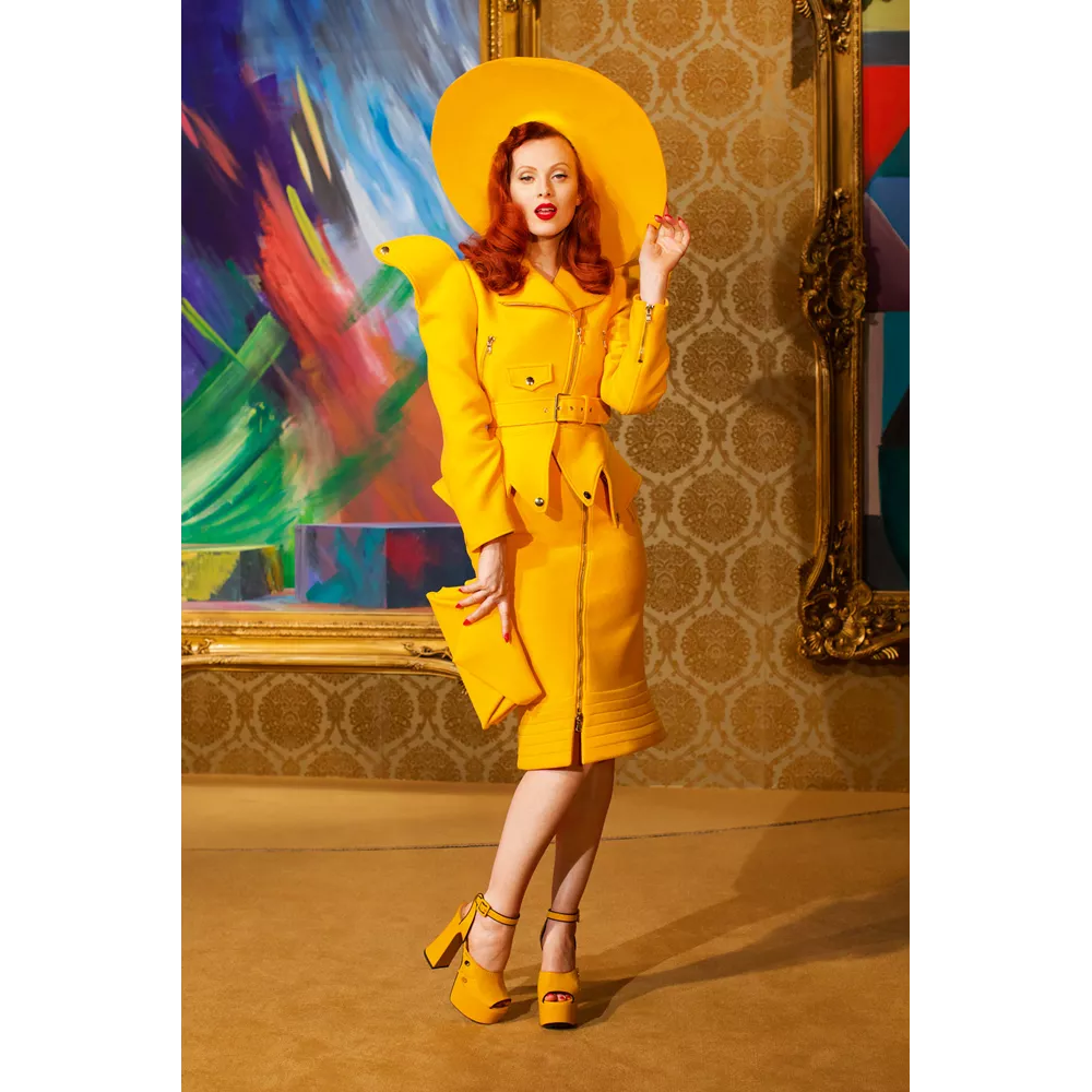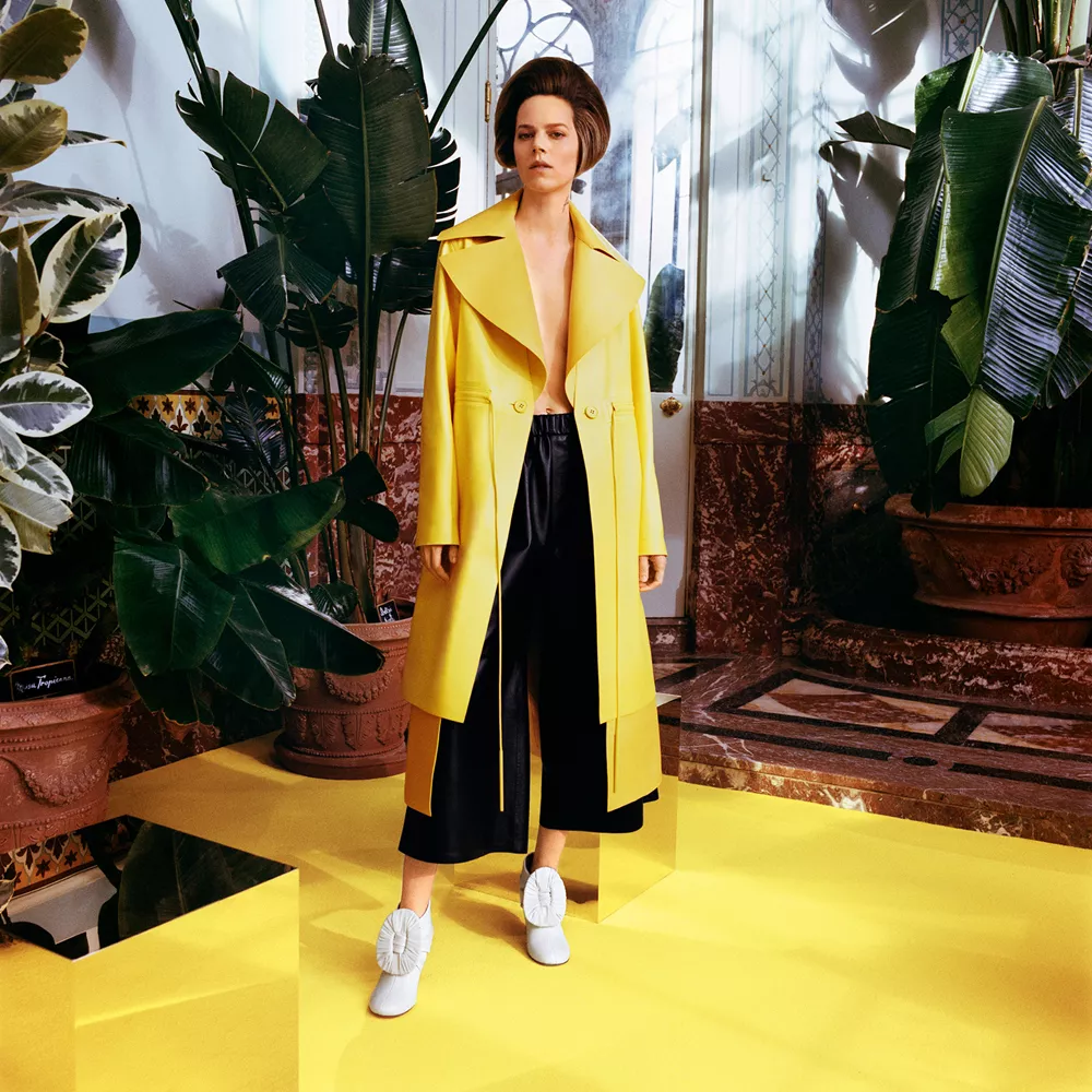 Άλλες συλλογές αναβίωσαν τη γοητεία του παλιού Χόλιγουντ. "Ήθελα φαντασία σε τεχνικολόρ, με χρώματα έντονα που να επιβάλλονται με τον δυναμισμό της κινηματογραφικής εικόνας" λέει ο creative director της Moschino, Jeremy Scott, ο οποίος γύρισε μια ταινία μικρού μήκους με τίτλο "Jungle Red" εμπνευσμένη από τη δραματική κομεντί του Τζορτζ Κιούκορ "Γυναίκες" του 1939. Στην ταινία του Scott στο ριμέικ της σκηνής από την επίδειξη μόδας (η μοναδική σκηνή που ο Κιούκορ είχε γυρίσει έγχρωμη) η Karen Elson είναι μια οπτασία σε κίτρινο-πορτοκαλί, ενώ το σύνολο ολοκληρώνεται με ένα πλατύγυρο καπέλο για τον ήλιο. Μαζί της εμφανίζονται σταρ όπως οι Hailey Bieber, Precious Lee και Shalom Harlow, ενώ η ίδια λάμπει μέσα στο μίνι σατέν φόρεμά της, με κεντημένο ένα φλαμίνγκο από πούπουλα. Στο ίδιο μήκος κύματος, ο σχεδιαστής Aaron Potts για την A. Potts διοχέτευσε χαρούμενες παιδικές αναμνήσεις με τα αδιάβροχά του, βγαλμένα από το "Τραγουδώντας στη βροχή". "Όταν ξεκίνησα να σκέφτομαι τη συλλογή, ήξερα ότι το κίτρινο θα ήταν το κυρίαρχο χρώμα" λέει για την απόχρωση που επέλεξε, την οποία ο ίδιος αποκαλεί "έκρηξη ήλιου". "Είπα στον εαυτό μου: "OK, Aaron, μπορείς να επιλέξεις να μείνεις σε αυτή τη σκοτεινή διάθεση ή να αφεθείς στην ευτυχία και την αισιοδοξία”". Αν θέλουμε γι’ αυτό το φθινόπωρο αχτίδες χαράς στη ζωή μας, τότε πρέπει να κάνουμε ό,τι πρόσταζε η fashion editor στο "Funny Face": "Απαγορέψτε το μαύρο, κάψτε το μπλε, θάψτε το μπεζ"
