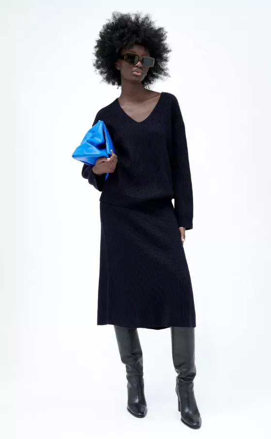 Πλεκτή μπλούζα και μίντι φούστα σε μπλε, Zara.