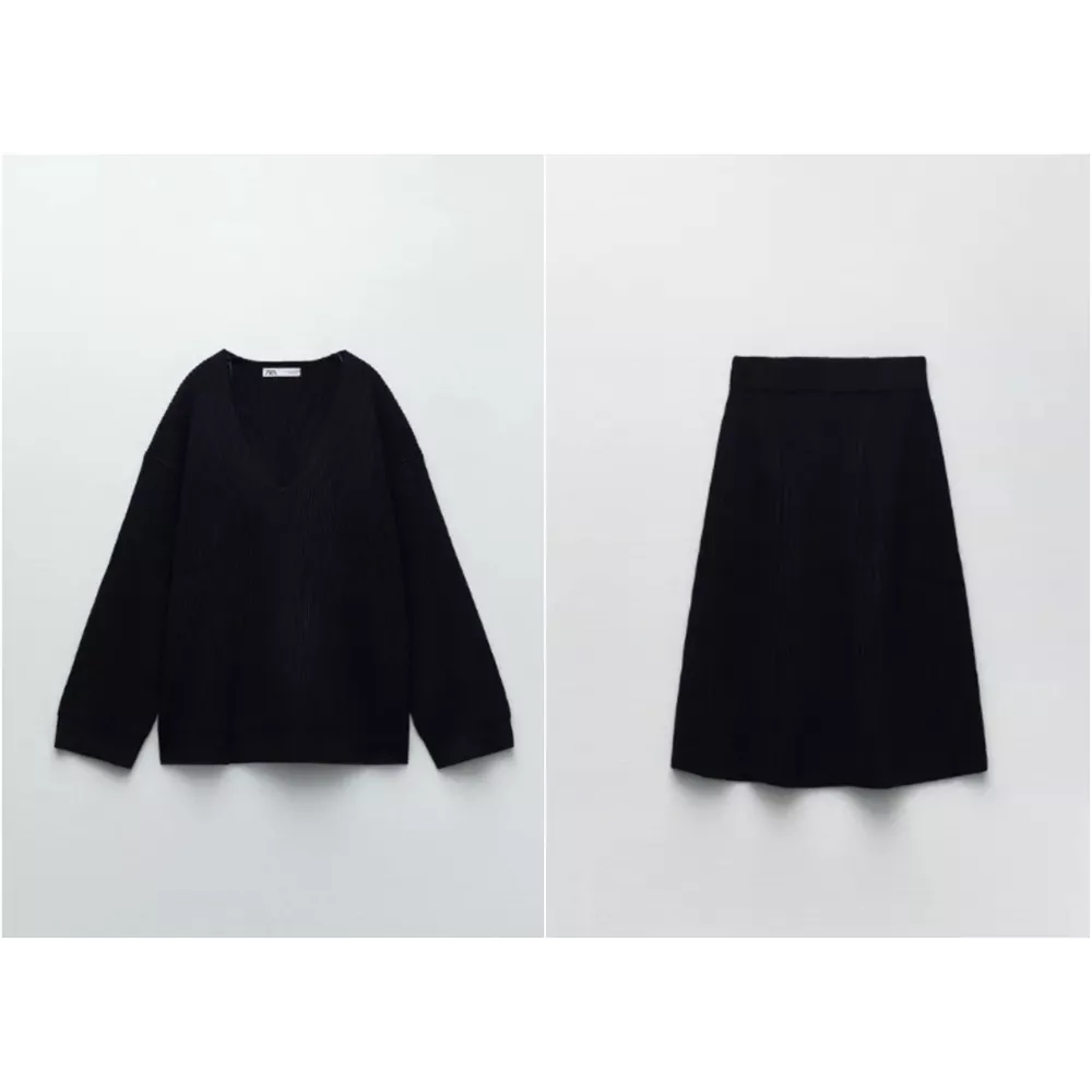 Πλεκτή μπλούζα και πλεκτή μίντι φούστα, Zara.