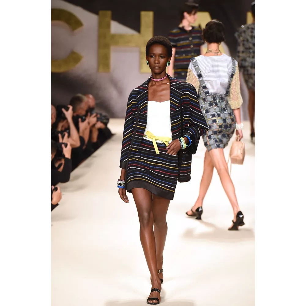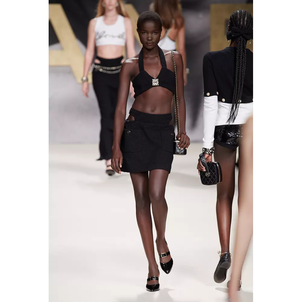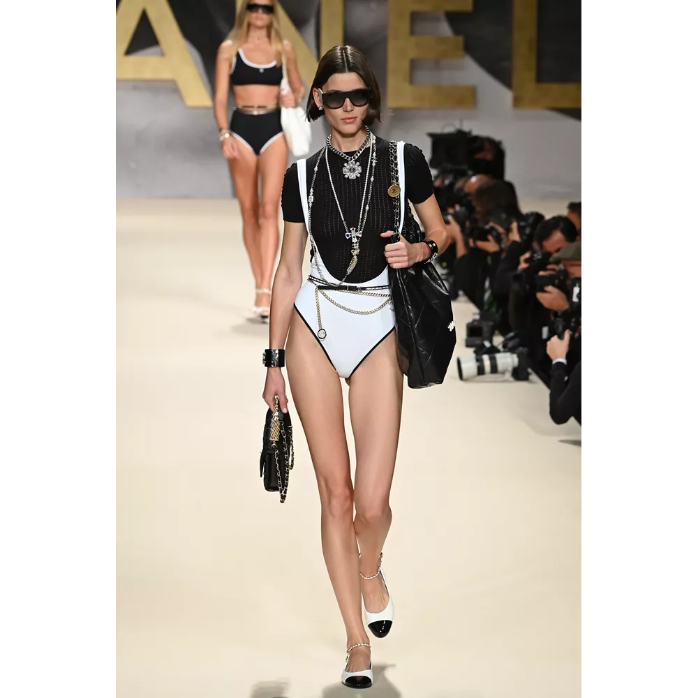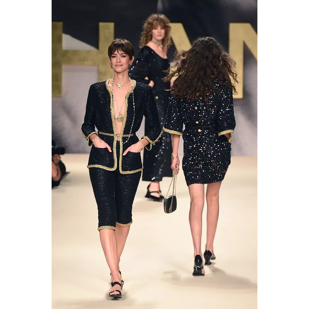 Μονοχρωματικά μαγιό (σε άσπρο - μαύρο), fishnet φούστες, biker shorts, μίνι sporty φούστες, bra tops με sequin γράμματα, ευρύχωρα blazer dresses, χρυσά κορμάκια, tweed σετ με παγιέτες, μαρινιέρες, ριγέ ταγέρ και μίνι φορέματα, σαλοπέτες, πλεκτά σετ σε ροζ και λευκό, στιβαρές ζακέτες, μίνι φορέματα σε ροζ και μοβ tweed, είναι μερικά από τα σικ κομμάτια που συναντά κανείς στο (άτυπα) πρώτο μέρος της συλλογής το οποίο χαρακτηρίζει έντονα το στοιχείο της λάμψης (παγιέτες, μεταλλικά νήματα, σατέν τελειώματα, πέρλες, χρυσό, faux κοσμήματα συνδράμουν σ' αυτό με ευλαβική συνέπεια), καταθέτει τη δική του άποψη στη συζήτηση που έχει ανοίξει η μόδα για το "νέο σέξι" (μίνι φούστες, hot pants, bikini tops, midriff-baring φορέματα αναλαμβάνουν για τη Chanel να τη μεταφέρουν στη νέα σεζόν) και δίνει μορφή στη νοσταλγία για τη ανυπέρβλητη κληρονομία του οίκου - και τις δημιουργίες του Karl Lagerfeld- από τα '80s, όπως όταν η Linda Evangelista περπατούσε στο ντεφιλέ του οίκου με μονοχρωματικό ολόσωμο και χρυσές αλυσίδες ή η Naomi Campbell στις αρχές των '90s με μίνι tweed φόρεμα και σακάκι σε μοβ απόχρωση.