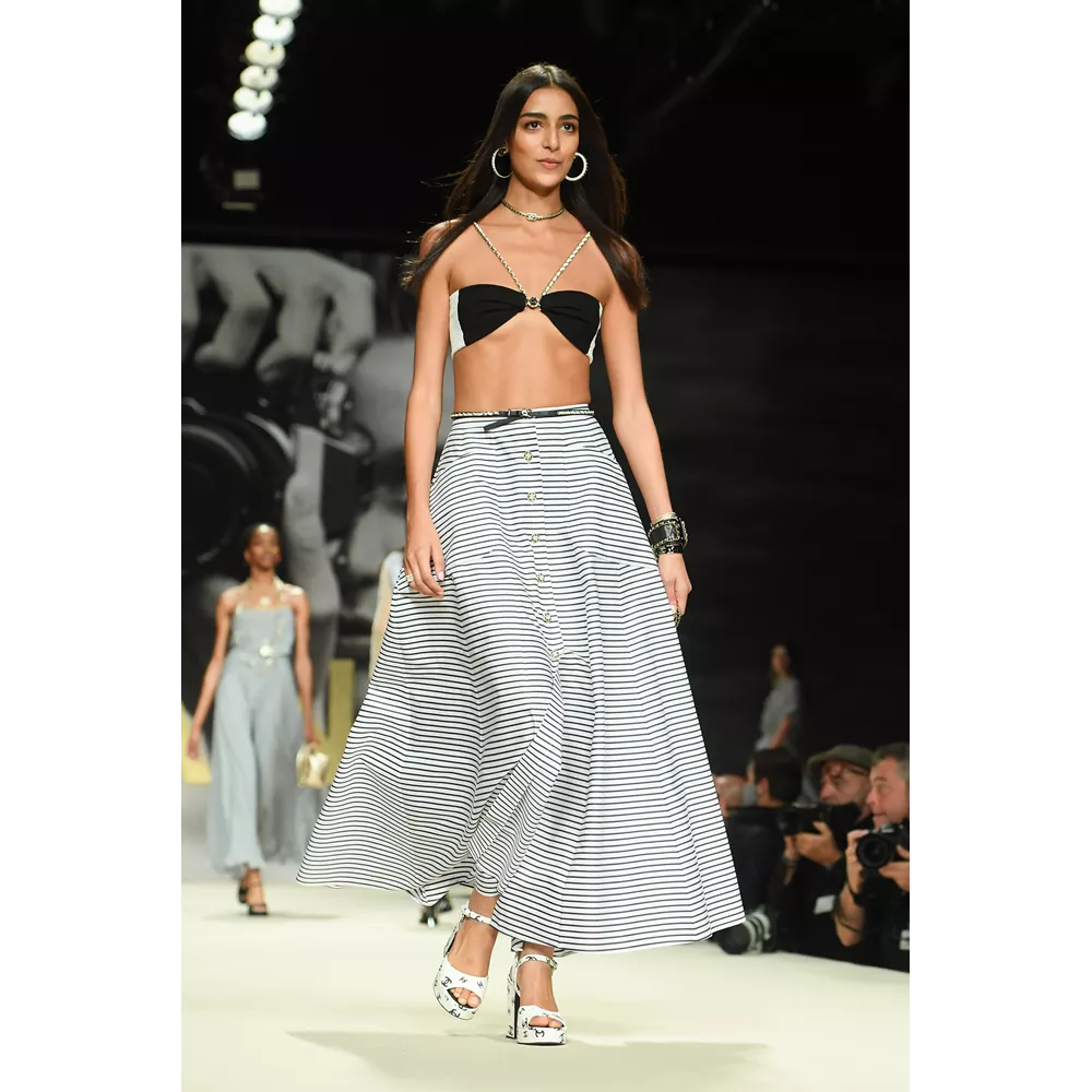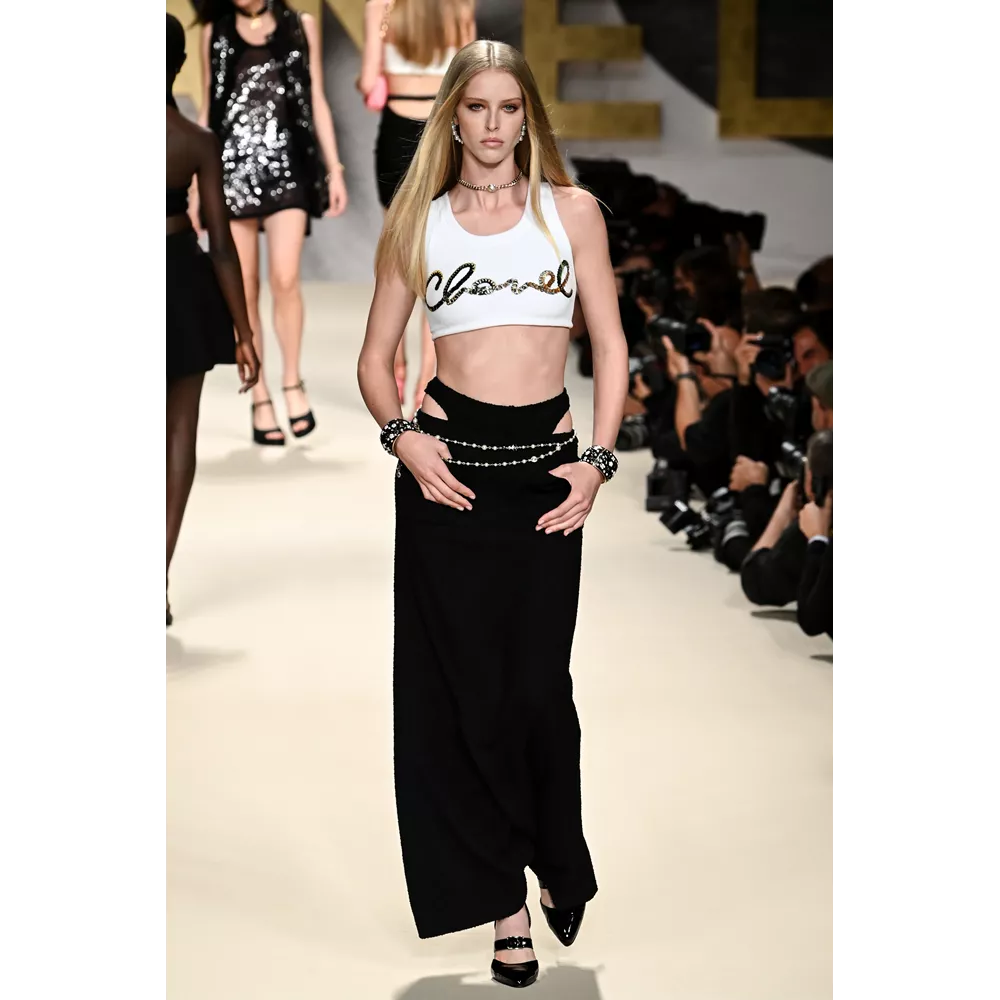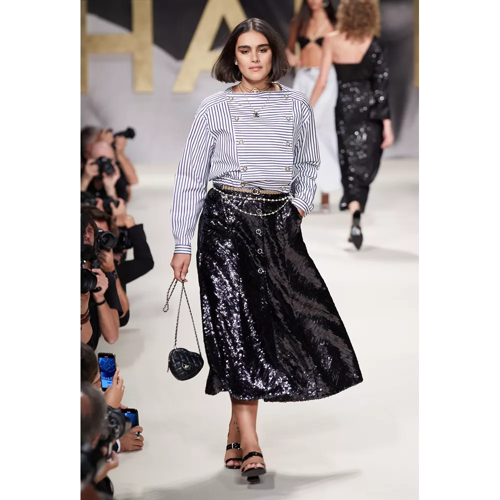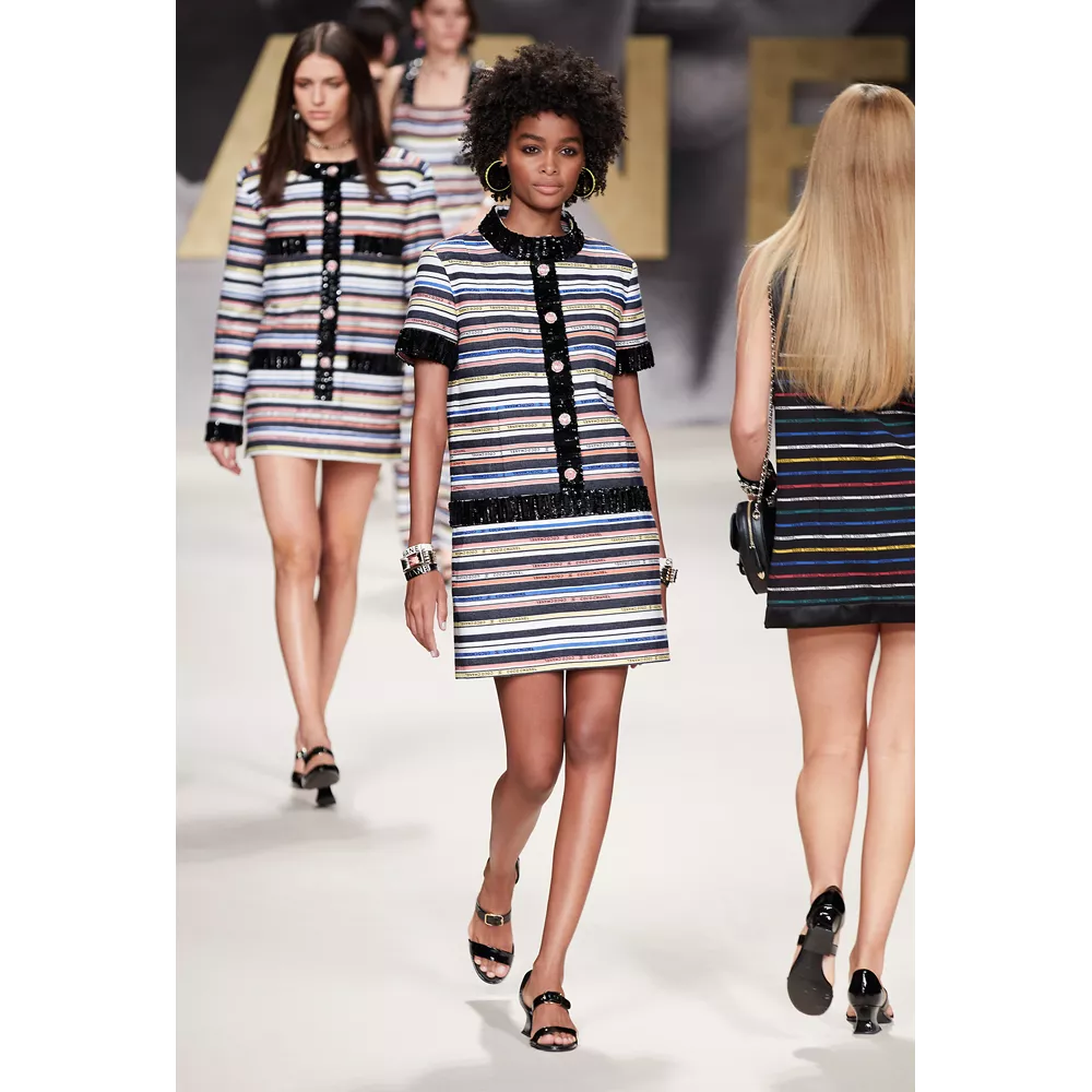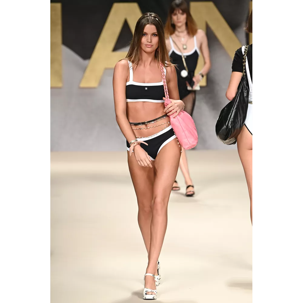 Μονοχρωματικά μαγιό (σε άσπρο - μαύρο), fishnet φούστες, biker shorts, μίνι sporty φούστες, bra tops με sequin γράμματα, ευρύχωρα blazer dresses, χρυσά κορμάκια, tweed σετ με παγιέτες, μαρινιέρες, ριγέ ταγέρ και μίνι φορέματα, σαλοπέτες, πλεκτά σετ σε ροζ και λευκό, στιβαρές ζακέτες, μίνι φορέματα σε ροζ και μοβ tweed, είναι μερικά από τα σικ κομμάτια που συναντά κανείς στο (άτυπα) πρώτο μέρος της συλλογής το οποίο χαρακτηρίζει έντονα το στοιχείο της λάμψης (παγιέτες, μεταλλικά νήματα, σατέν τελειώματα, πέρλες, χρυσό, faux κοσμήματα συνδράμουν σ' αυτό με ευλαβική συνέπεια), καταθέτει τη δική του άποψη στη συζήτηση που έχει ανοίξει η μόδα για το "νέο σέξι" (μίνι φούστες, hot pants, bikini tops, midriff-baring φορέματα αναλαμβάνουν για τη Chanel να τη μεταφέρουν στη νέα σεζόν) και δίνει μορφή στη νοσταλγία για τη ανυπέρβλητη κληρονομία του οίκου - και τις δημιουργίες του Karl Lagerfeld- από τα '80s, όπως όταν η Linda Evangelista περπατούσε στο ντεφιλέ του οίκου με μονοχρωματικό ολόσωμο και χρυσές αλυσίδες ή η Naomi Campbell στις αρχές των '90s με μίνι tweed φόρεμα και σακάκι σε μοβ απόχρωση.