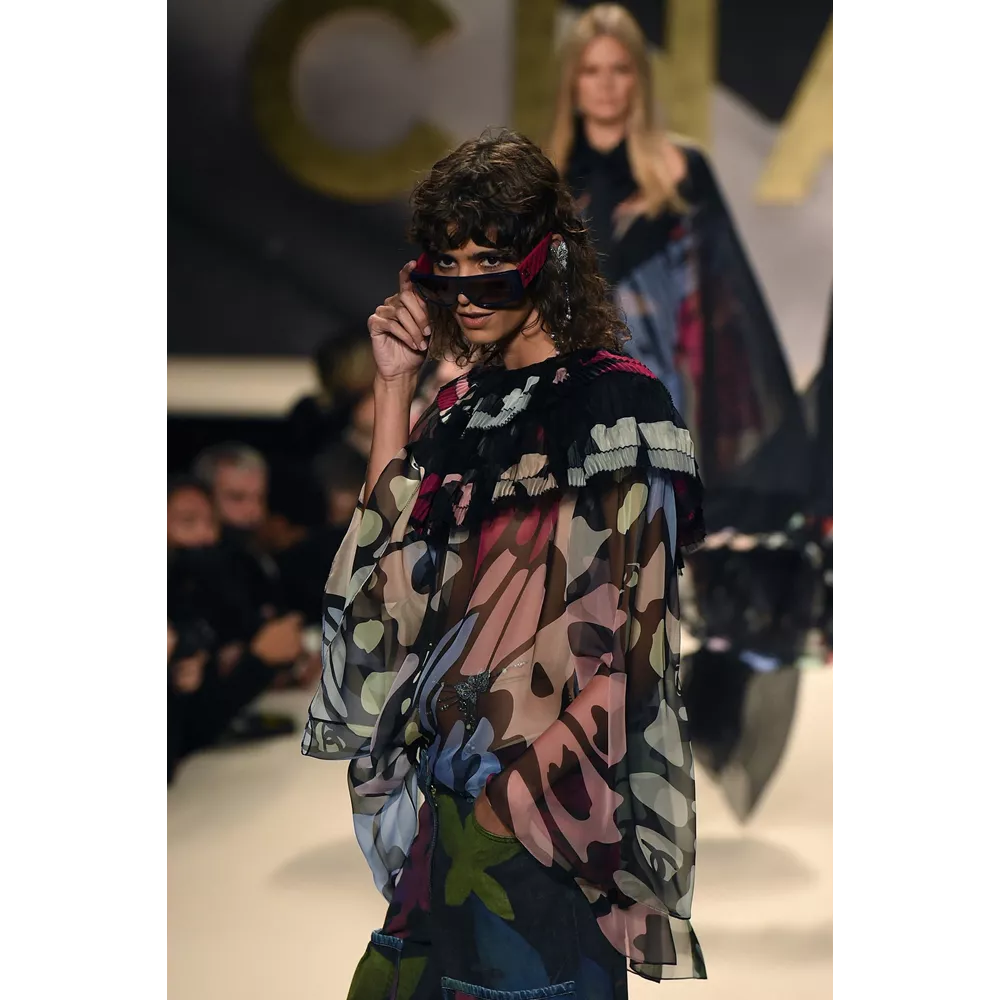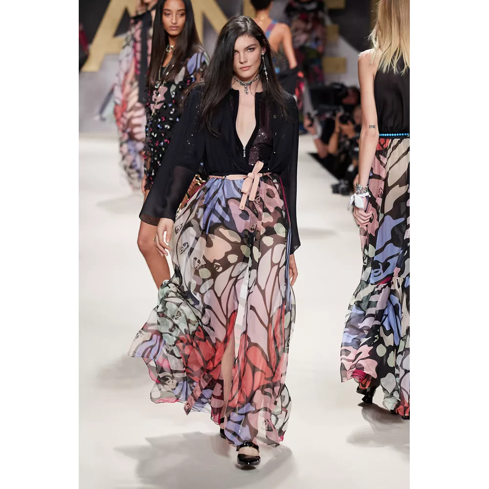 Η Viard κλείνει το show για την SS22 collection Chanel με μία σειρά από floaty φορέματα, φούστες, μπλούζες και πουκάμισα, αλλά και denim suits, που έχουν ως χαρακτηριστικό τους ένα oversized αφηρημένο μοτίβο πεταλούδας σε διάφορα χρώματα πάνω σε μαύρο σιφόν.