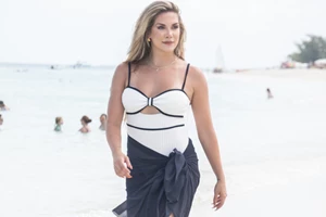 Ο κλασικός συνδυασμός black & white βρίσκει εφαρμογή σ' ένα casual look με λευκή βερμούδα, μαύρο T-shirt, μαύρα slides και ψάθινη τσάντα.