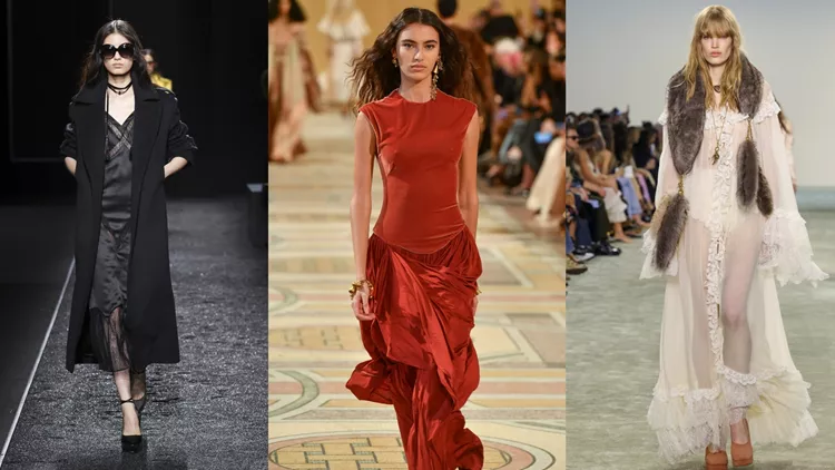 Σε άλλες τάσεις, σημειώστε τα φορέματα με βολάν. Μάλιστα, πολλά απ' αυτά υιοθετούν τη δαντέλα ή λεπτομέρειες από δαντέλα, στην οποία αναφερθήκαμε προηγουμένως. Στη συλλογή της Chloé για τη σεζόν Φ/Χ 2025-26 τα φορέματα έχουν αέρινες φόρμες και βολάν που απευθύνονται στο σύγχρονο boho στιλ, όμως παράλληλα μοιάζουν τόσο νεραϊδένια και αιθέρια που θα μπορούσαν να ταιριάξουν και σε πολλά άλλα στιλ. Βολάν χρησιμοποιεί και ο οίκος McQueen, που παίζει με το ύφος της αναγέννησης, ενώ ο οίκος Louis Vuitton καταθέτει τη δική του πρόταση σε slip dress που το έχει ενισχύσει με επίπεδα και βολάν από δαντέλα.