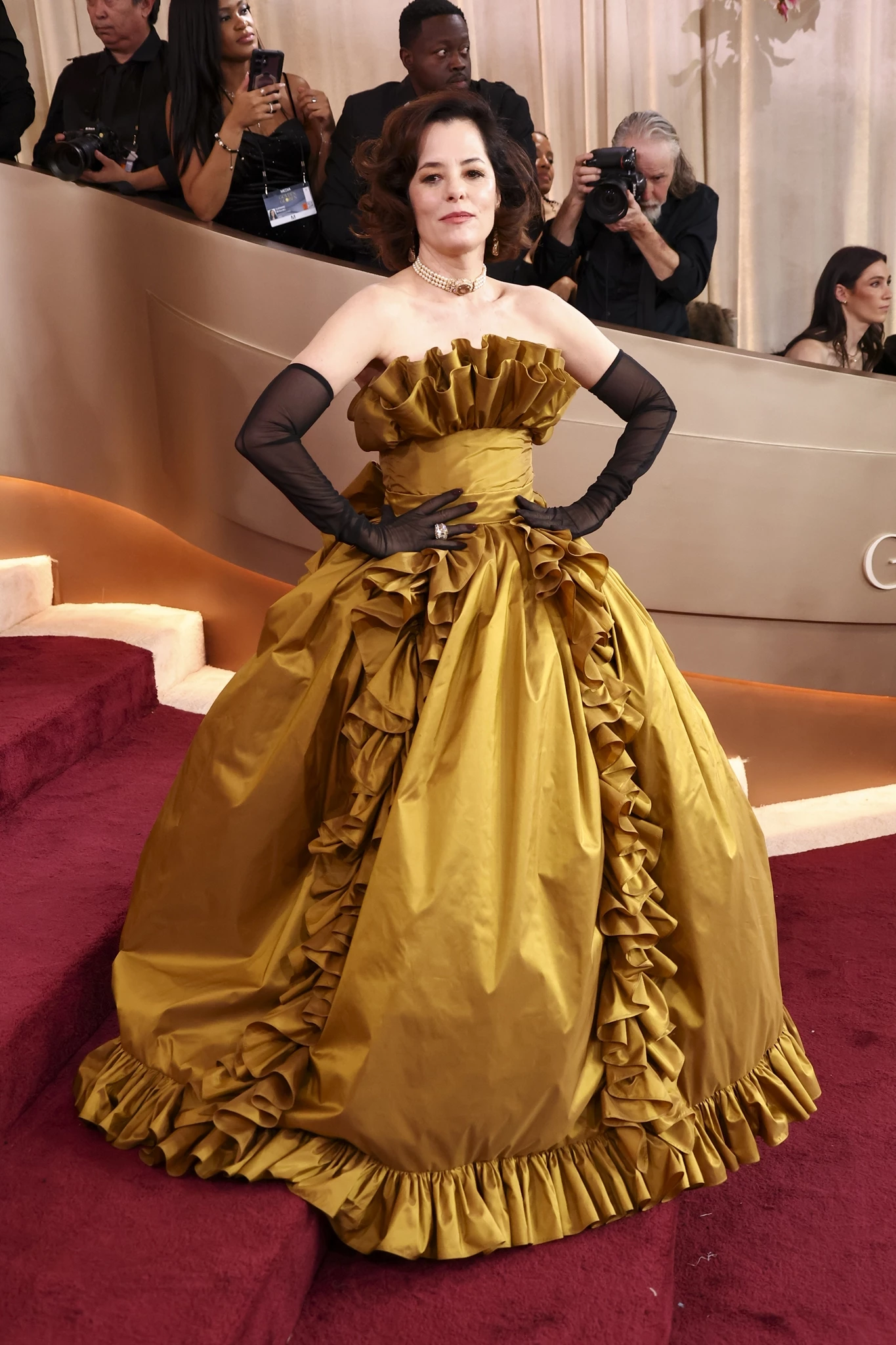 Ενδεικτικά, αυτής της τάσης είναι τα looks της Selena Gomez και της Ayo Edebiri που και οι δυο φόρεσαν δημιουργίες Chanel από τον Matthieu Blazy: η Gomez επέλεξε ένα μαύρο βελούδινο σύνολο διακοσμημένο με φτερά στρουθοκαμήλου, ενώ η Edebiri ένα έξωμο φόρεμα με πάνελ από μαύρο βελούδο και σατέν. Ολοκλήρωσαν με ογκώδη κουάφ καρέ χτενίσματα. Εντυπωσιακή ήταν και η Amanda Seyfried, με ένα ντραπέ λευκό column dress και ασορτί λευκή εσάρπα από το Atelier Versace