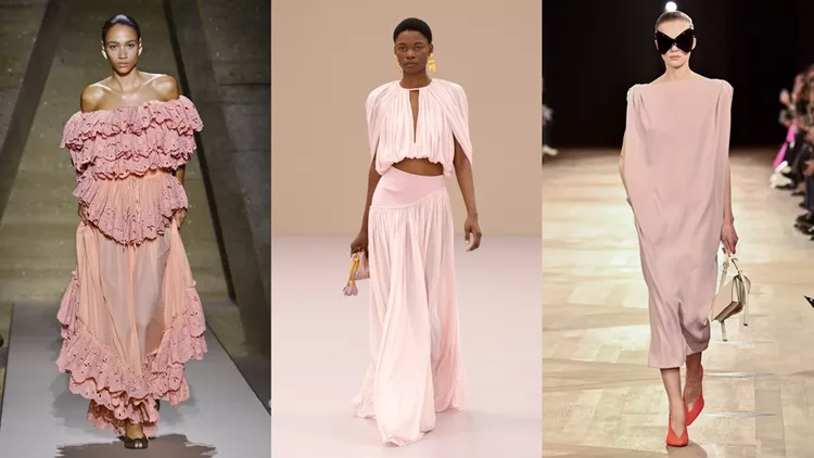 Ένα ντραπέ αέρινο σύνολο σε dusty pink εμφανίστηκε στη συλλογή Zimmermann για να ορίσει την εικόνα του καλοκαιριού, ενώ η Stella McCartney κάνει περίπου το ίδιο μ' ένα σύνολο με περισσότερο όγκο αλλά την ίδια ανάλαφρη αίσθηση. Ο Alaia αξιοποιεί το χρώμα για φούστες με έντονο πλισέ και όγκο, στη Chanel έχουμε κλασικά σομόν πουκάμισα που φοριούνται με μακριές φούστες, ενώ στη συλλογή της Chloé συναντάμε την πιο ρομαντική εκδοχή σε φόρεμα με βολάν και broderie anglaise.