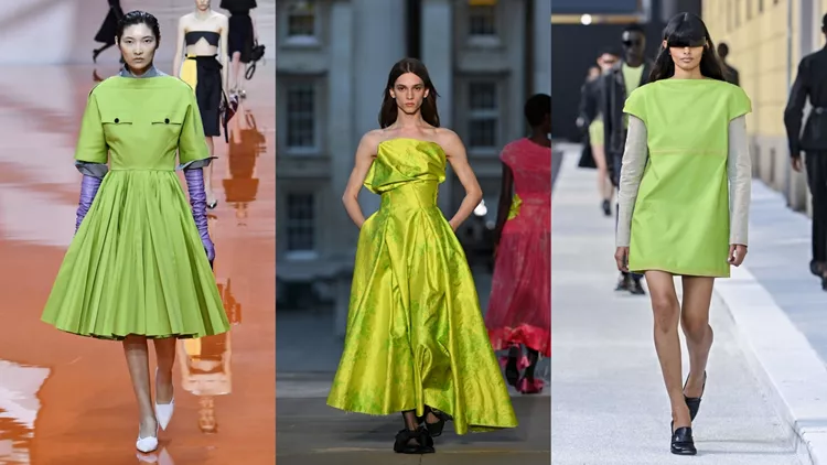 Στη συλλογή της Prada ένα φόρεμα με πιέτες φορεμένο με δερμάτινα opera gloves δηλώνει τον τρόπο με τον οποίο η λάιμ απόχρωση μπορεί να υπηρετήσει τη ladylike αισθητική, στον Valentino ένα δαντελένιο τοπ με βολάν υπογραμμίζει τη σχέση που μπορεί να αποκτήσει η απόχρωση με τον ρομαντισμό, ενώ στη συλλογή της Ulla Johnson έχουμε μια κατάθεση για boho αισθητική με επίκεντρο τη φθορίζουσα απόχρωση.