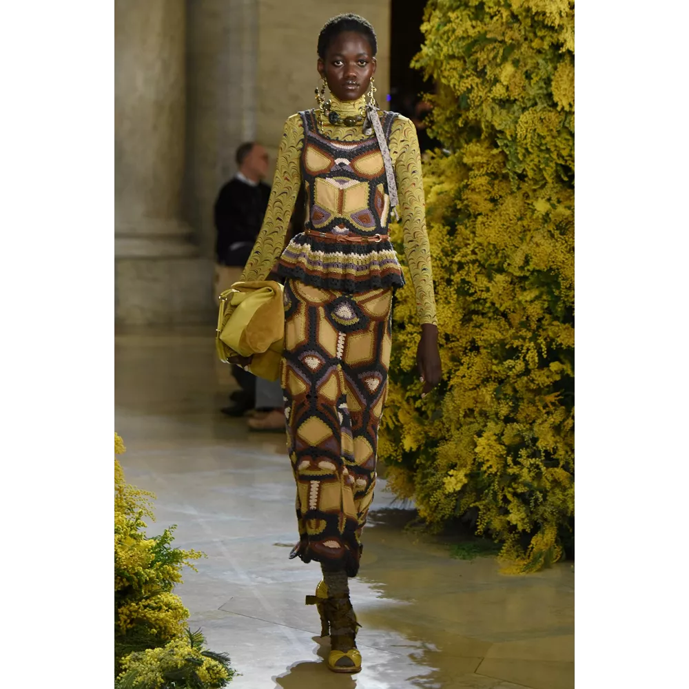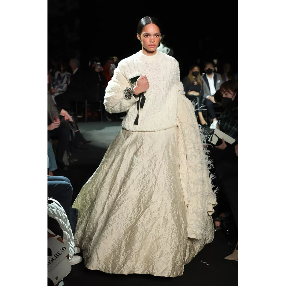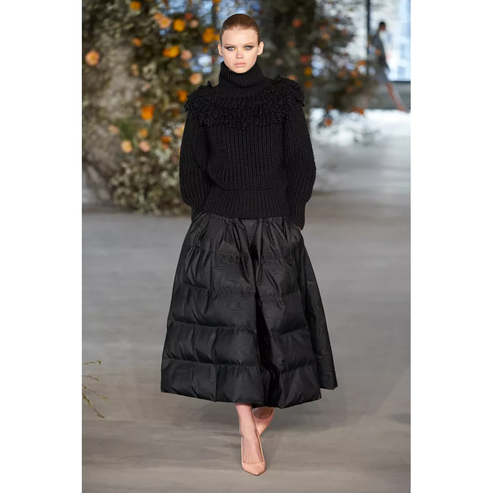 Από την άλλη, η νοσταλγική συλλογή του Brandon Maxwell αποτίνει φόρο τιμής στην αγαπημένη του (και πολύ στιλάτη!) γιαγιά – η οποία αποτέλεσε πηγή έμπνευσή του σε πολλές συλλογές- και περιλαμβάνει σ' αυτή ένα φλοράλ μοτίβο [σ.σ. αυτό στο φόρεμα με το οποίο περπάτησε στην πασαρέλα η Karlie Kloss] που είχε σχεδιάσει ο παππούς του για εκείνη. Η χρωματική παλέτα της κολεξιόν κινείται σε γήινους τόνους και βασικές αποχρώσεις (λευκό, μαύρο) και οι συνδυασμοί ανάμεσα σε casual και evening κομμάτια, πολυτελή και "καθημερινά" υφάσματα, όπως ας πούμε μια ball gown φούστα από "σπασμένο" σατέν μ' ένα cable knit πουλόβερ, φέρνουν το "παραμύθι" στα μέτρα της καθημερινότητας.