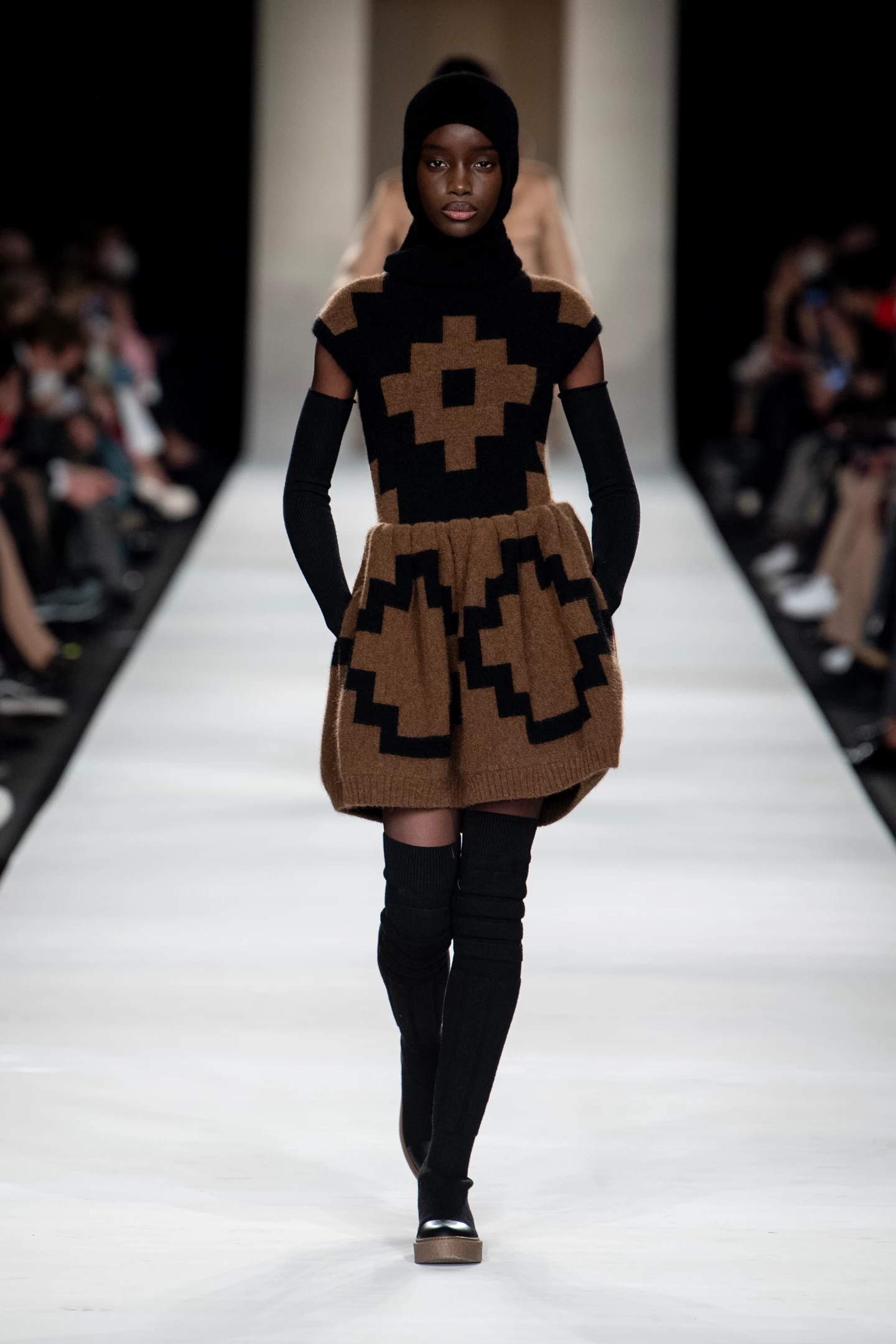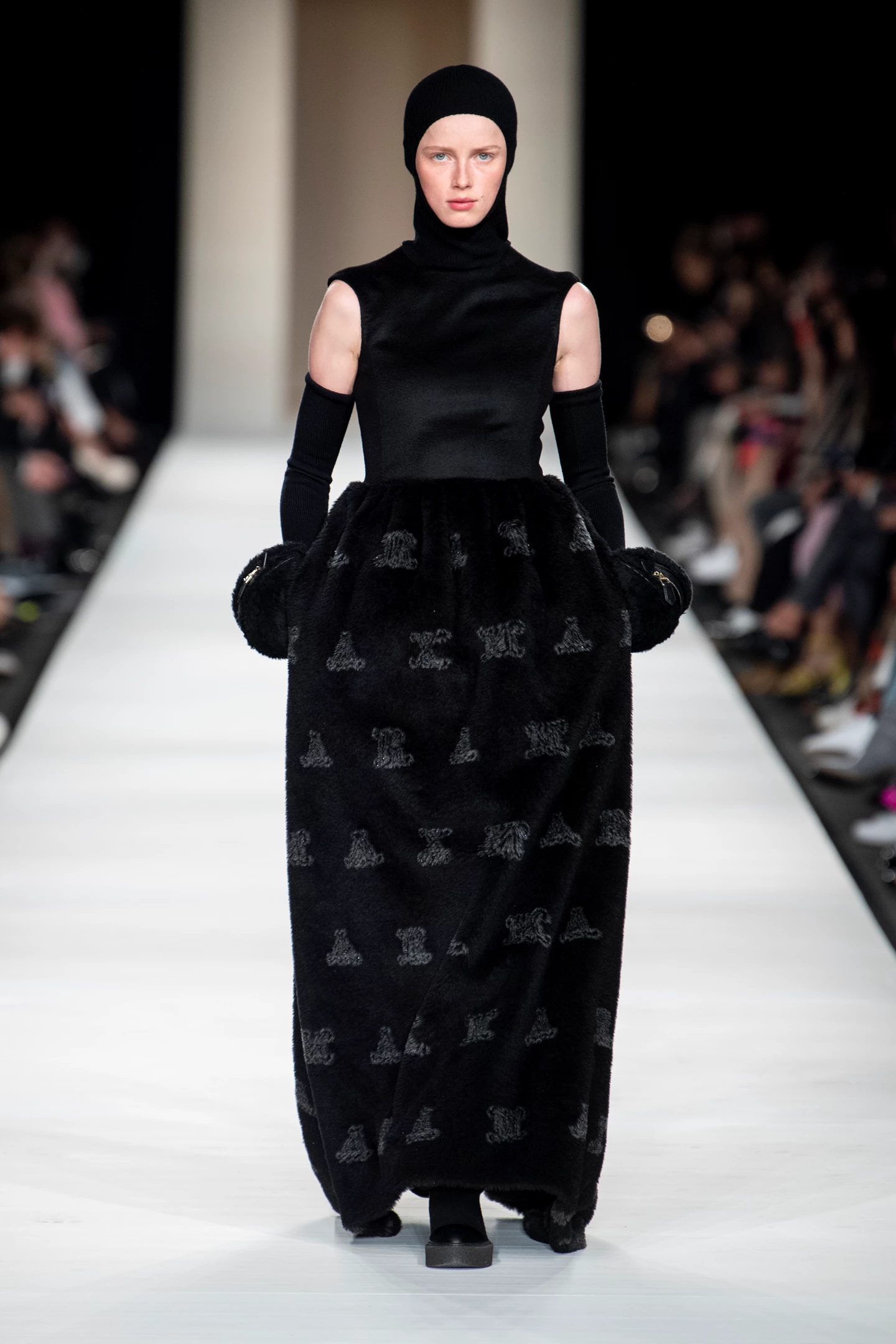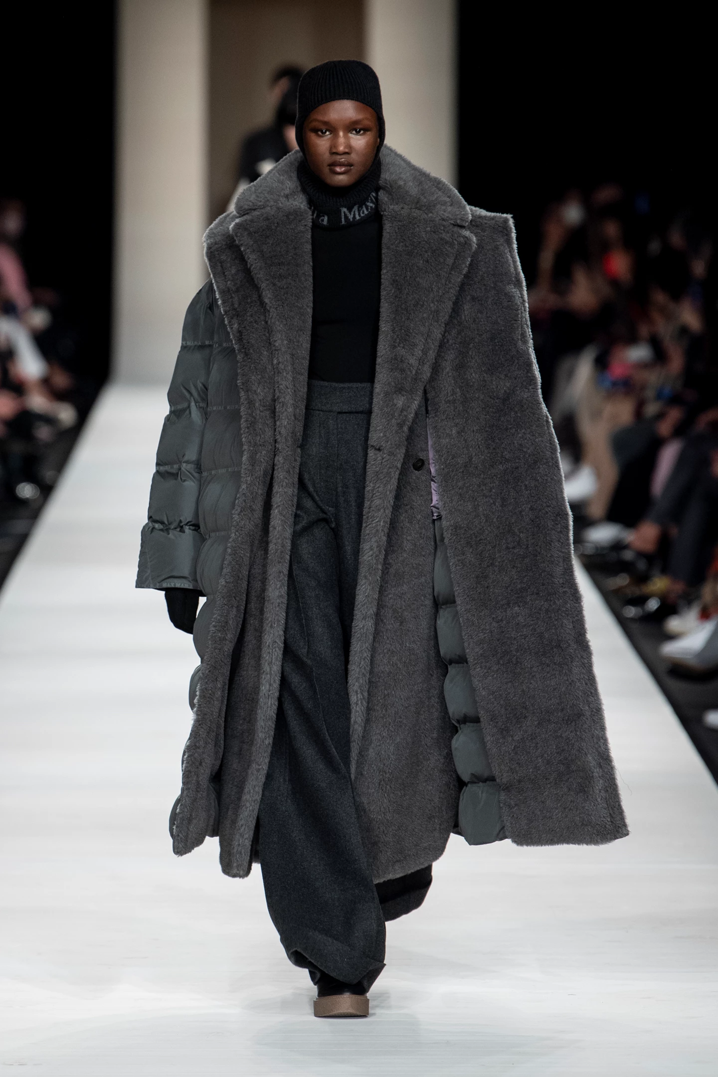 Στην FW'22 συλλογή Max Mara συναντάμε ανανεωμένες, γνώριμες σιλουέτες από προηγούμενες συλλογές- όπως τα μάξι ζέρσεϊ φορέματα με τη φούστα σε σχήμα καμπάνα, της Resort 2022 που αποκτούν εδώ γούνινη ή knit υφή και συνοδεύονται από μπαλακλάβα- και iconic κομμάτια όπως το Teddy Bear coat – και το αντίστοιχο γιλέκο- που συνδυάζονται με τη νέα πρόταση του οίκου: τα καπιτονέ φορέματα. Επιπλέον, το Teddy Bear αποκτά και ολοκαίνουργια must - have εκδοχή: με την προσθήκη layers μεταμορφώνεται σε oversized puffer.