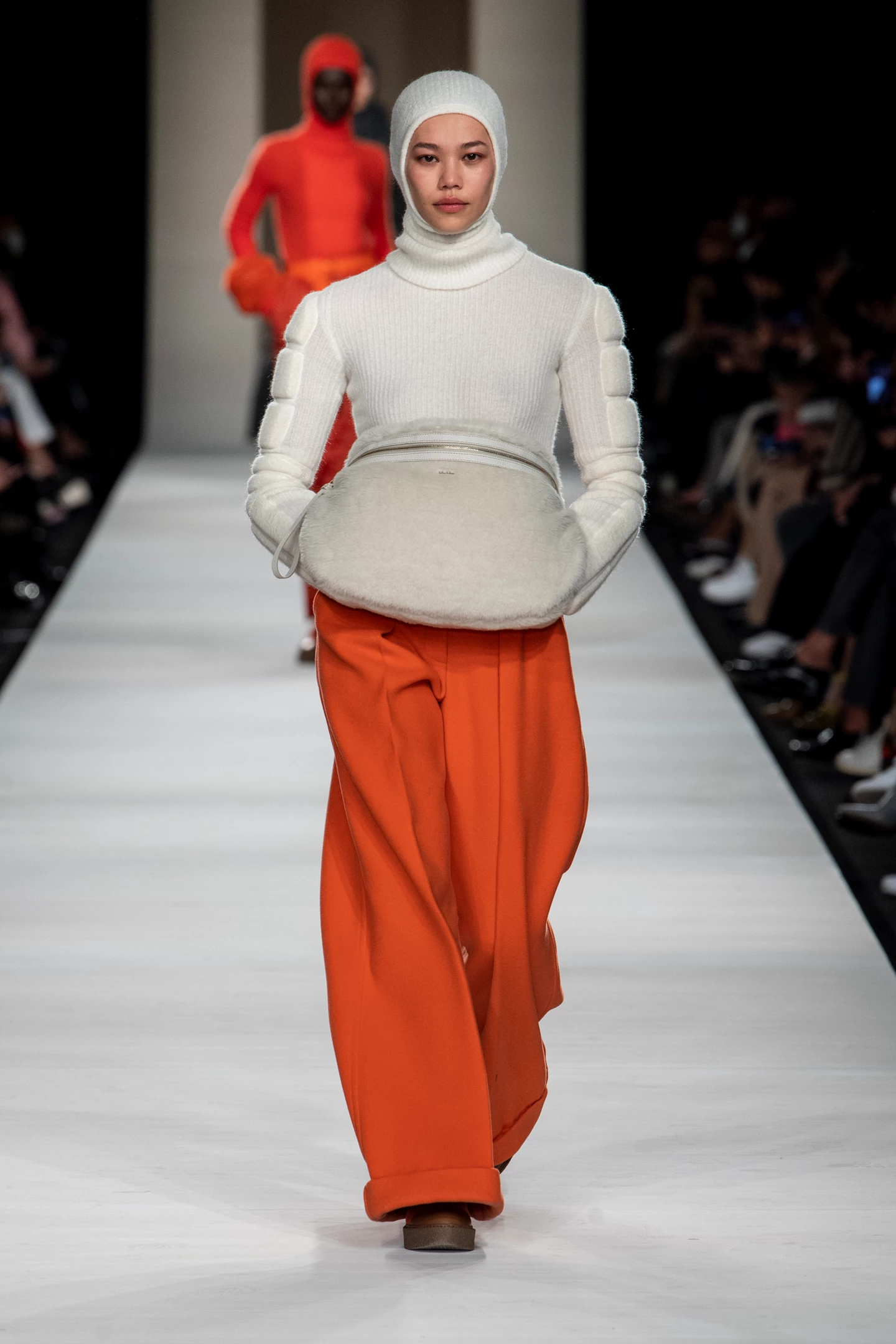 Από τη συλλογή δεν απουσιάζουν δημοφιλή κλασικά staples όπως τα ζιβάγκο και οι ψηλόμεσες παντελόνες, σε άριστo tailoring, που γίνονται εξαιρετικά φαρδιές, και ο πάντα σικ συνδυασμός ανάμεσα στα δυο. Γούνινα harem pants με paperbag μέση (όπως αυτό με το οποίο εμφανίστηκε η Bella Hadid) ή καπιτονέ παντελόνια σε έντονα χρώματα όπως το πορτοκαλί φοριούνται είτε με αμάνικα πλεκτά τοπ – και όπερα γάντια- είτε με εφαρμοστά πουλόβερ με κουκούλα σε μονοχρωματικά σύνολα. Το αξεσουάρ "μπαλακλάβα" κάνει έντονα αισθητή την παρουσία του στα looks της Max Mara ενισχύοντας την αίσθηση του coziness και της ζεστασιάς που αποπνέει όλη η συλλογή, ενώ προσδίδει και μια sporty διάσταση στα σύνολα.