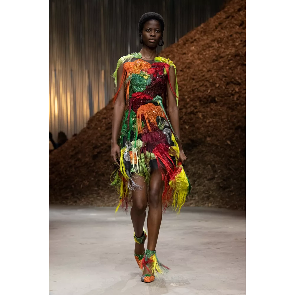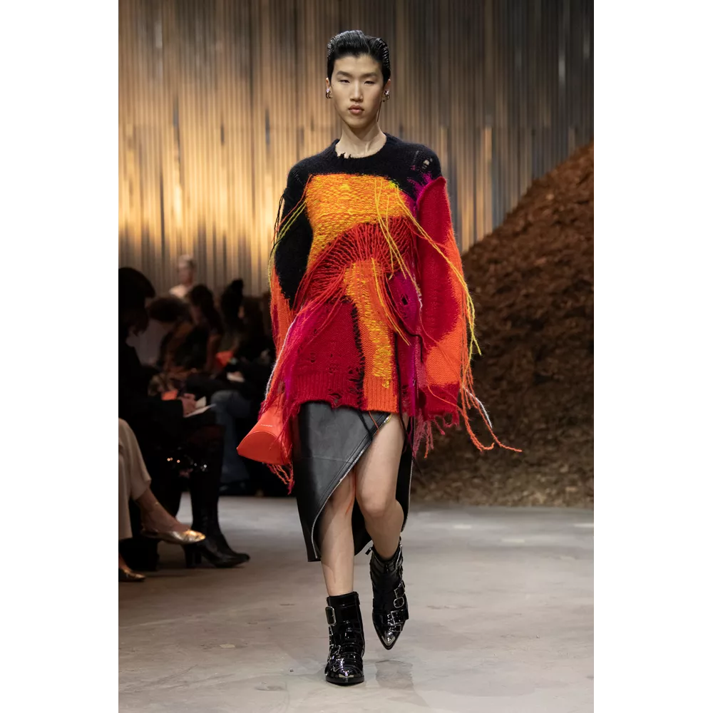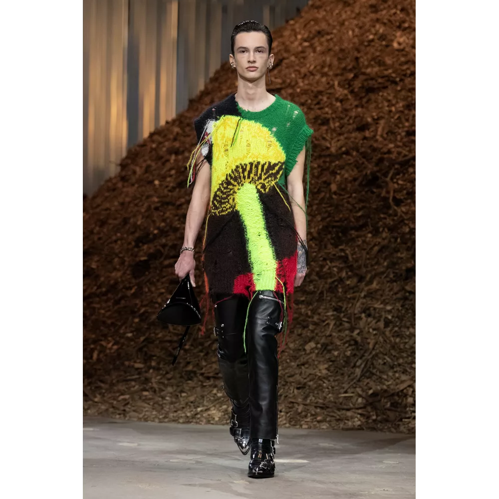 Η ιδέα της Burton αναφορικά με την έμπνευση της AW'22 συλλογής Alexander McQueen είναι πολύ ξεκάθαρη. Πώς αποτυπώνεται, όμως, αυτό στις δημιουργίες της; H πιο εξόφθαλμη αναφορά – φόρος τιμής στους μύκητες και τις underground κοινότητες τους είναι τα ψυχεδελικά σχέδια μανιταριών που αποτυπώνονται πάνω σε πλεκτά πουλόβερ και γιλέκα, αλλά και τα multicolor βραδινά φορέματα με κεντημένες πούλιες και νήματα που κρέμονται.