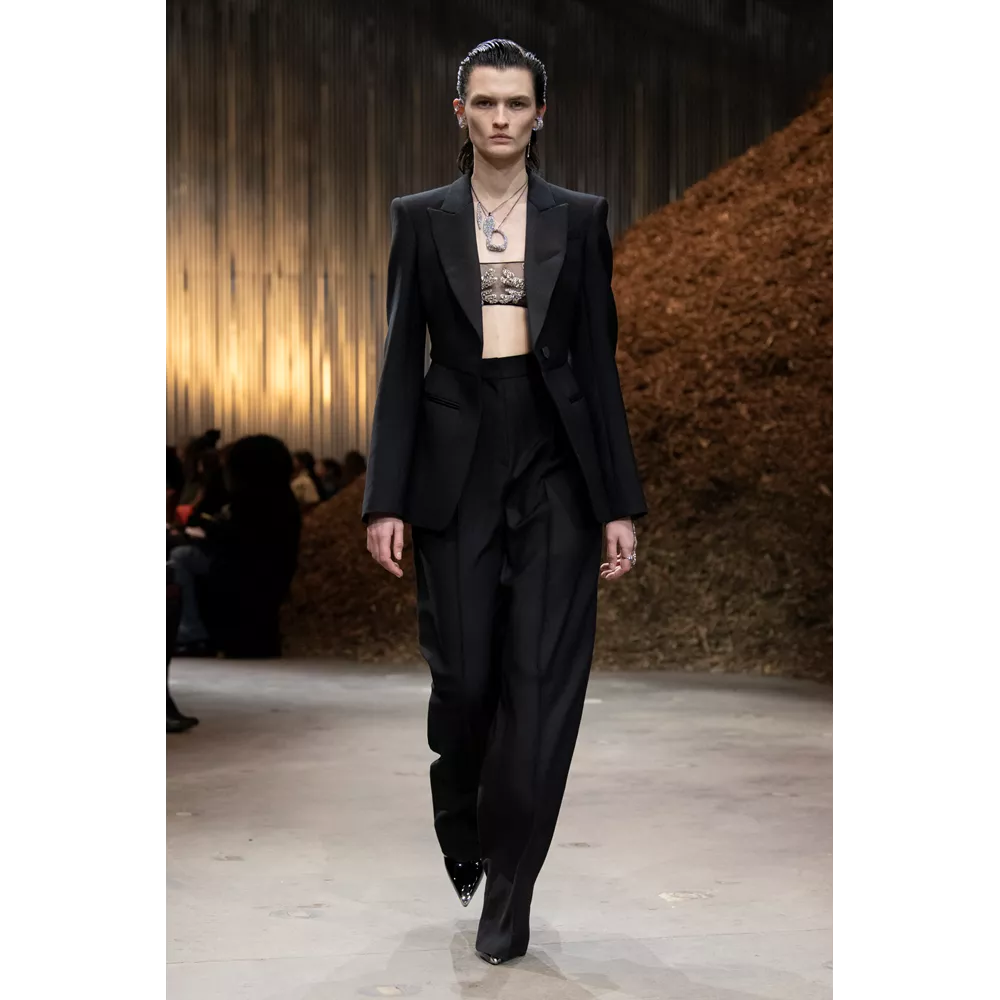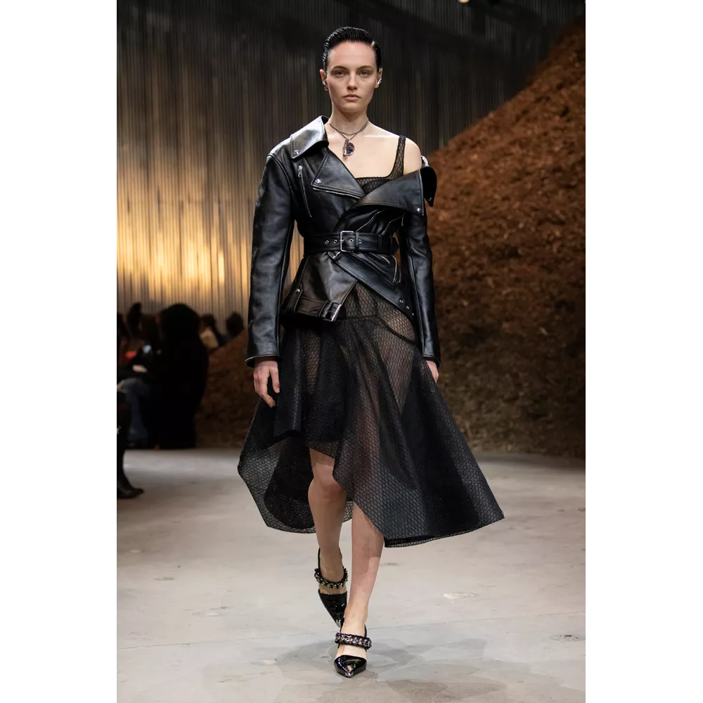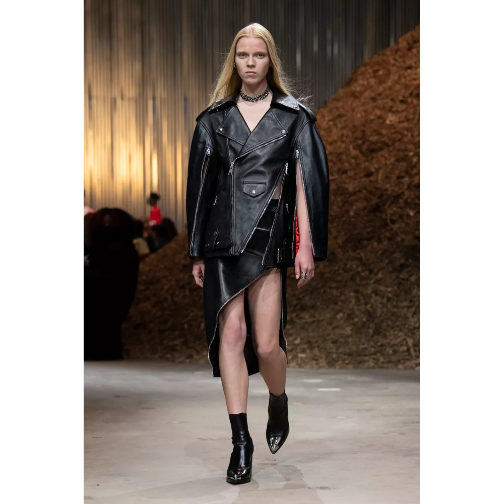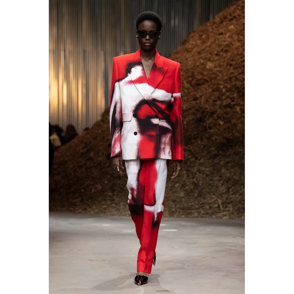Όσο για τα υπόλοιπα looks της συλλογής, τα biker jackets και η ροκ διάθεση που αποπνέουν τα δερμάτινα, τα τρουκς και τα πολλαπλά φερμουάρ είναι παρόντα σε μία ακόμα συλλογή, το αυστηρό και δεξιοτεχνικό tailoring δεν απουσιάζει από κοστούμια και πανωφόρια, τα βολάν, το τούλι και οι όγκοι παραμένουν πρωταγωνιστές στα φορέματα. Αξίζει, βεβαίως, να αναφερθούμε και στα looks – κοστούμια και φόρεμα- με τα graffiti-like τυπώματα που όπως αποκάλυψε η Sarah Burton αποτελούν φόρο τιμής στην Spring 1999 συλλογή του Alexander McQueen στην παρουσίαση της οποίας το μοντέλο και χορεύτρια Shalom Harlow εμφανίστηκε στο catwalk μ' ένα λευκό φόρεμα με επένδυση από τούλι το οποίο άρχισαν να ψεκάζουν με μπογιά δυο αυτόματα μηχανήματα – ρομπότ δημιουργώντας το αποτέλεσμα του graffiti.