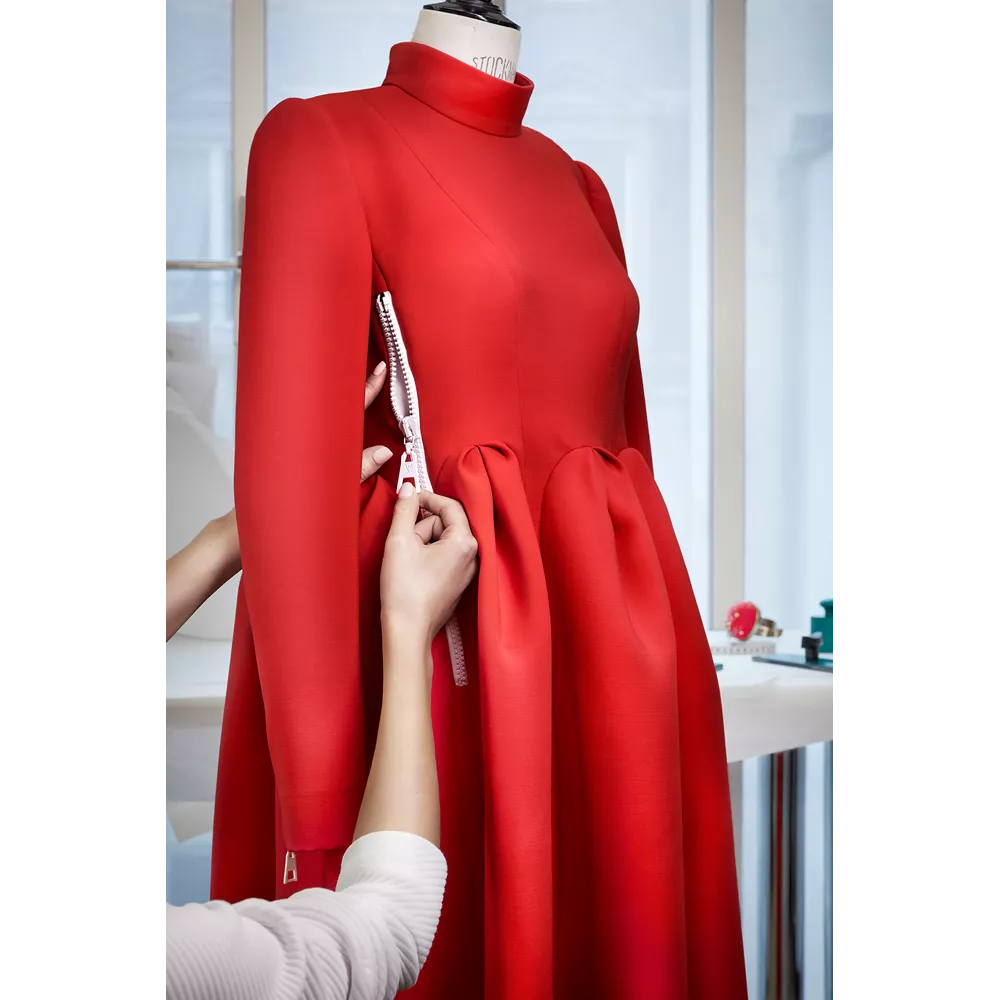 To κόκκινο custom-made μεταξωτό φόρεμα με μακριά μανίκια και πλισέ φούστα που φόρεσε η Sophie Turner διαθέτει λεπτομέρειες από λευκά φερμουάρ, ενώ η φούστα δημιουργήθηκε από 8 μεγάλες κυλινδρικές πιέτες που δημιουργούν πλούσιο κι επιβλητικό όγκο από τη μέση και κάτω. Τα λευκά φερμουάρ είναι τοποθετημένα στη μέση της πλάτης, στα πλαϊανά του φορέματος και στα τελειώματα των μανικιών.