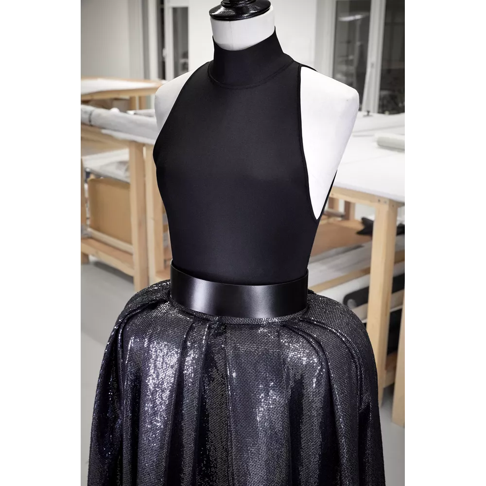 To μαύρο custom-made σύνολο της Cynthia Erivo αποτελείται ένα high neck bodysuit και πλεκτή φούστα κεντημένη με μίνι παγιέτες η οποία διαθέτει τονισμένους γοφούς. Η φούστα είναι κεντημένη με μικρές τετράγωνες πούλιες, ενώ ένα μαξιλάρι έχει τοποθετηθεί μέσα απ' αυτή, στο ύψος της μέσης, για να δώσει έξτρα όγκο στους γοφούς.
