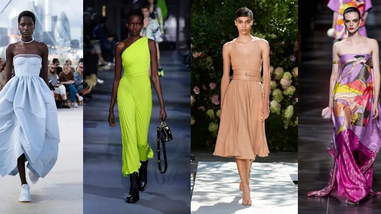 Από τον Σεπτέμβρη ως τον Απρίλιο έχουν περάσει αρκετοί μήνες και ένα φρεσκάρισμα στη μνήμη από τις προτάσεις των σχεδιαστών, είναι απαραίτητο. Από τα μεταξωτά στράπλες flowy φορέματα με graphic prints και τα λευκά cady καφτάνια της SS'22 συλλογής του οίκου Fendi, το lime-green πλισέ φόρεμα με έναν ώμο από τη συλλογή Valentino "Rendez Vous", στην οποία ανήκει κι η αναβίωση ενός iconic σχεδίου από το 1971, του αέρινου φορέματος με μοτίβο παπαρούνας, και τις υπέροχες αποχρώσεις σε μοβ, κίτρινο, μπλε, γαλάζιο, πορτοκαλί στα φορέματα των οίκων Ulla Johnson, Proenza Schouler, Balenciaga, Alexander McQueen, Chloé μέχρι τα αέρινα σιφόν με αφηρημένο μοτίβο πεταλούδας στην SS'22 συλλογή Chanel, τις θηλυκές σιλουέτες και τις nude αποχρώσεις στα φορέματα της collection Michael Kors, αλλά και τις χρωματιστές ρίγες σ' εκείνα που προτείνει ο Brandon Maxwell, τα φορέματα της άνοιξης 2022 είναι μια υπέροχη πανδαισία από επιλογές.