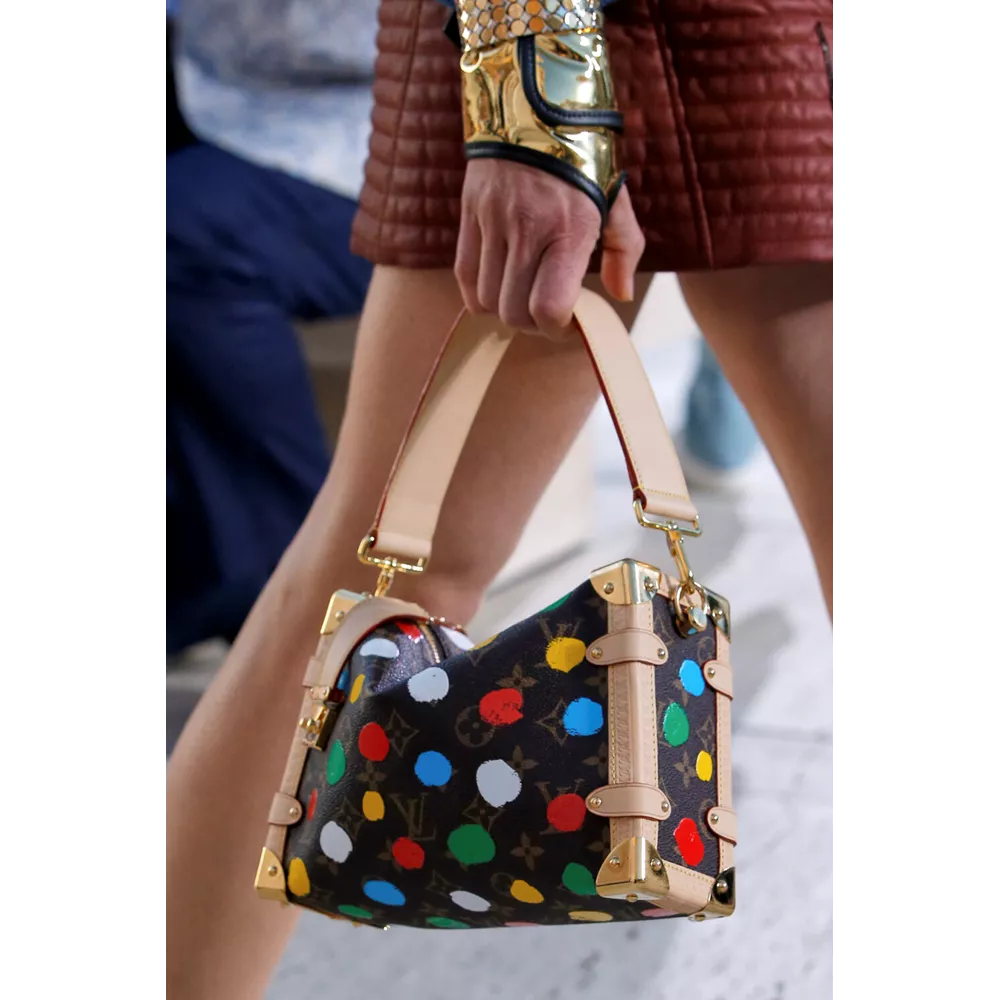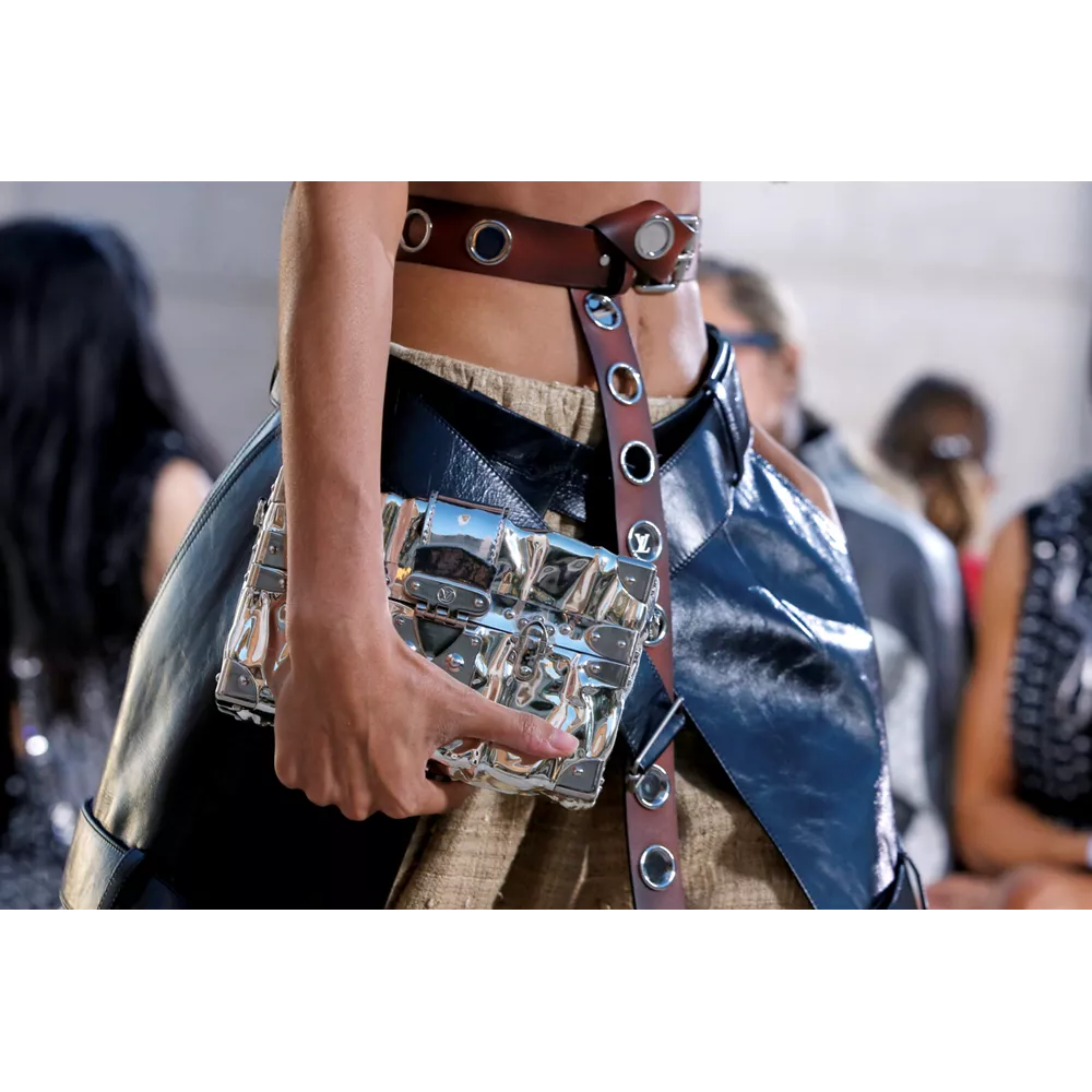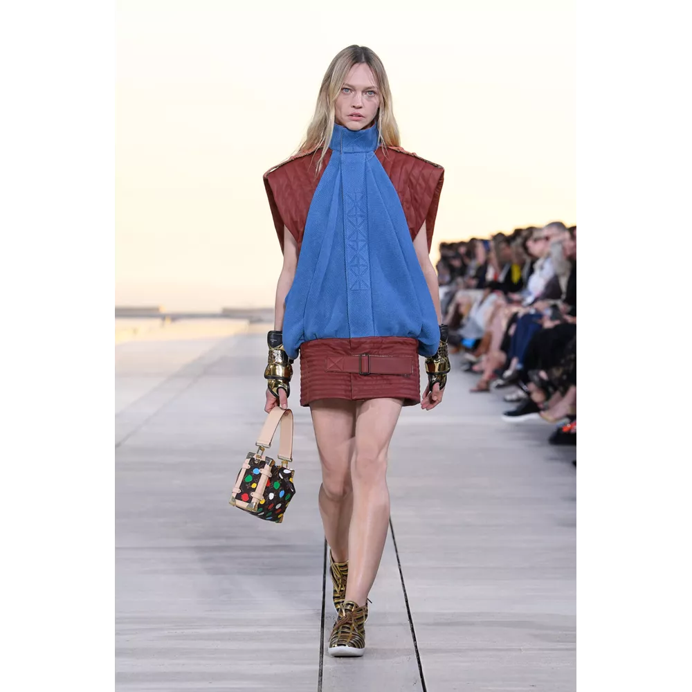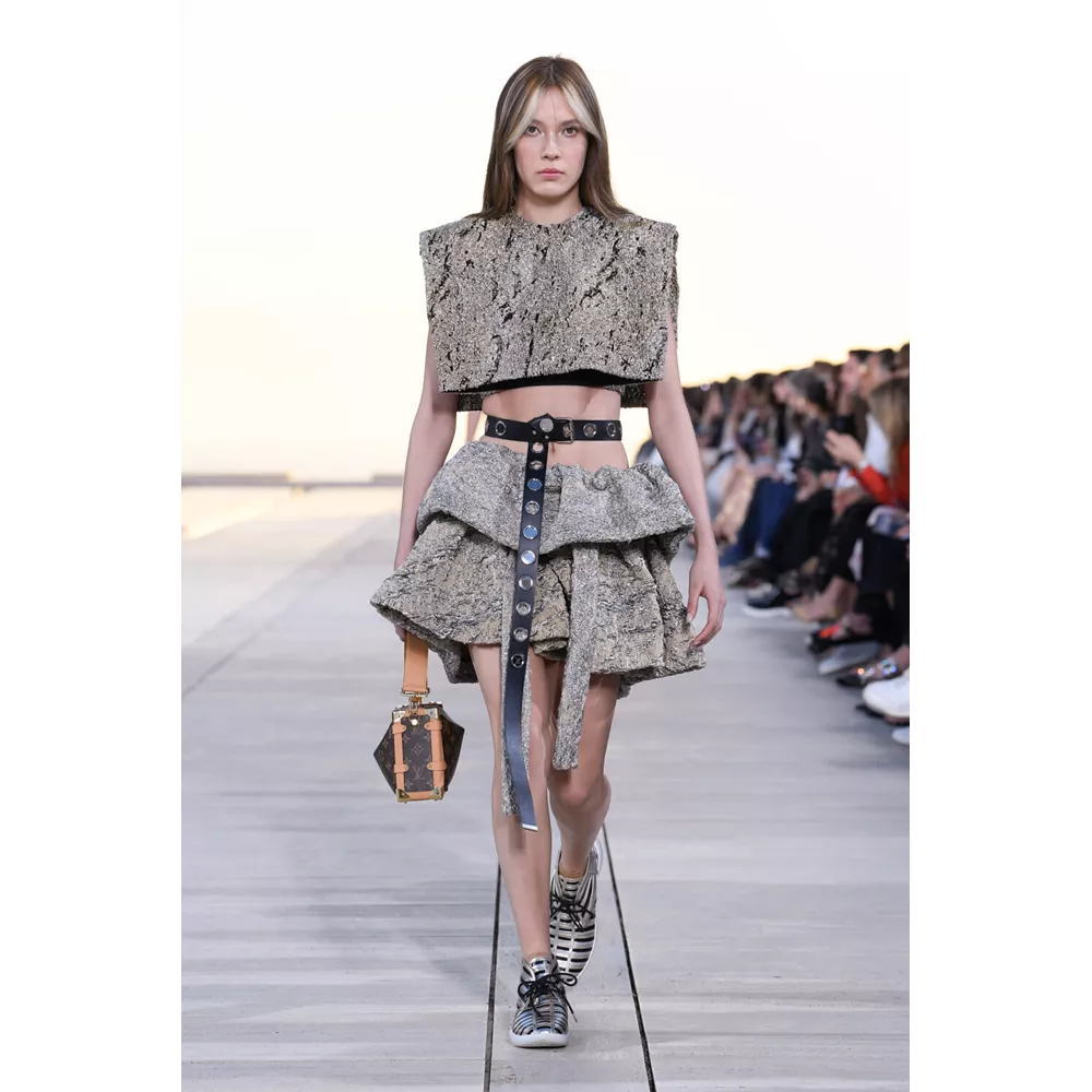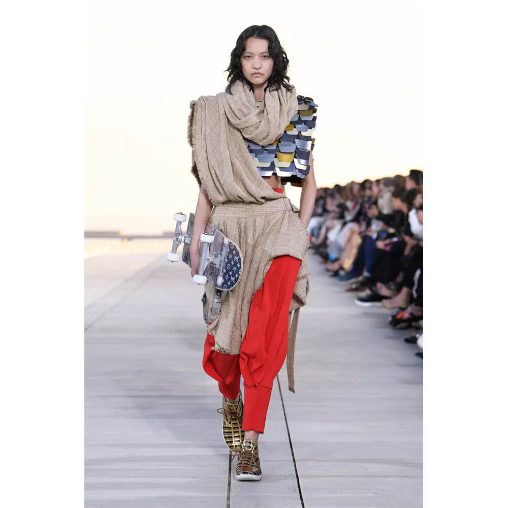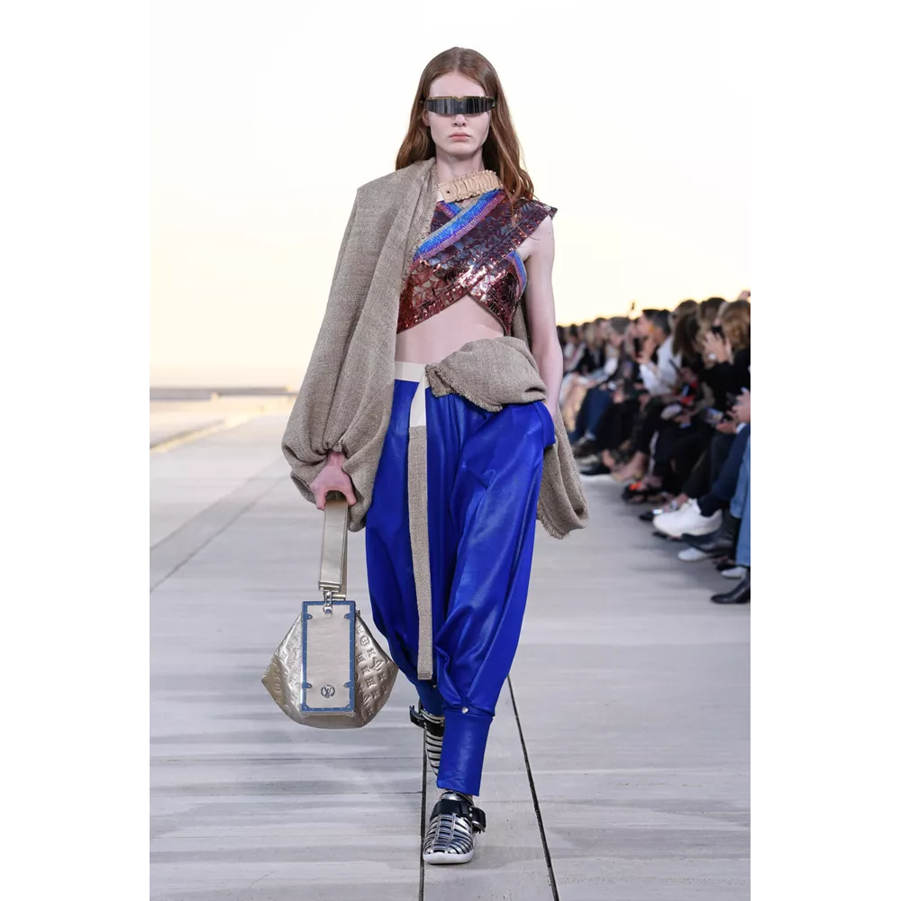Από αυτά τα οποία ξεχωρίζουν τα graphic print bomber jackets, τα δερμάτινα harem pants, τα metallic cargos και οι βερμούδες, τα χιαστί crop tops, οι ντραμπέ λινές φούστες, τα τοπς με πούλιες (ή μεταλλικά λέπια), τα λινά σάλια φορεμένα με το νομάδικο τρόπο, τα φλατ παπούτσια που μιμούνται εκείνα που φορούν οι σέρφερ ή τις over- the -knee μπότες που θυμίζουν αμυδρά gladiator sandals, τα μεταλλικά γάντια που μπορούν και να λειτουργήσουν ως κόσμημα, και φυσικά, τις πάντα επίκαιρες, πάντα ξεχωριστές τσάντες της Louis Vuitton, που έρχονται αναβαθμισμένα μέσα από τα υλικά και την αισθητική που αξιοποιεί η συλλογή Cruise 2023.