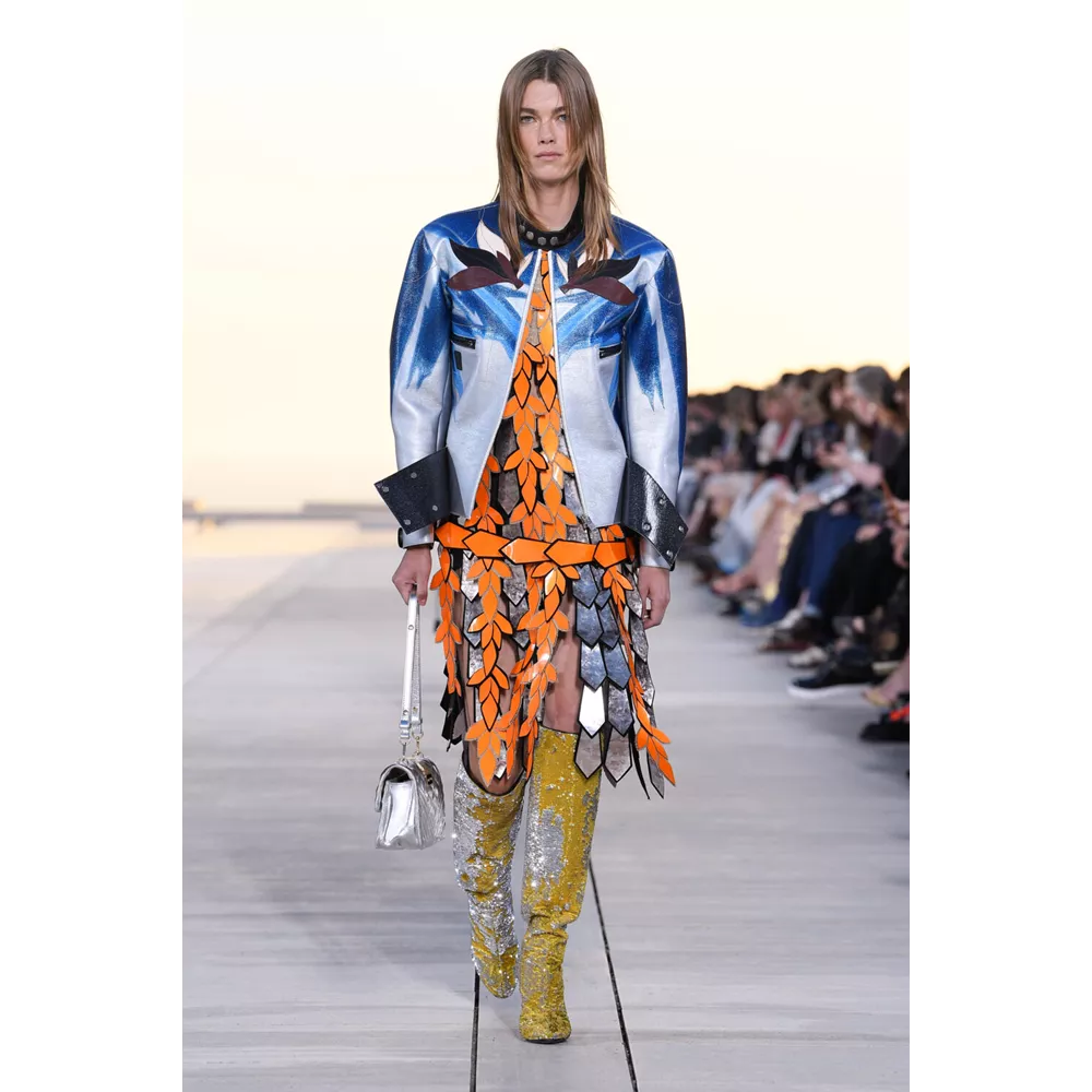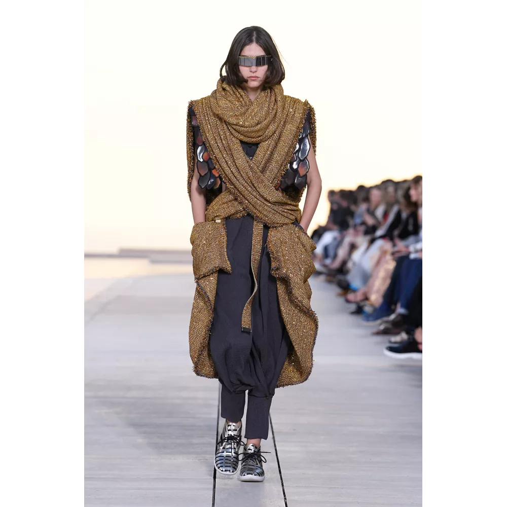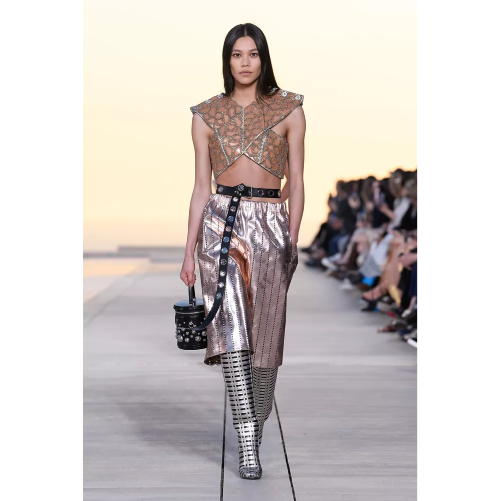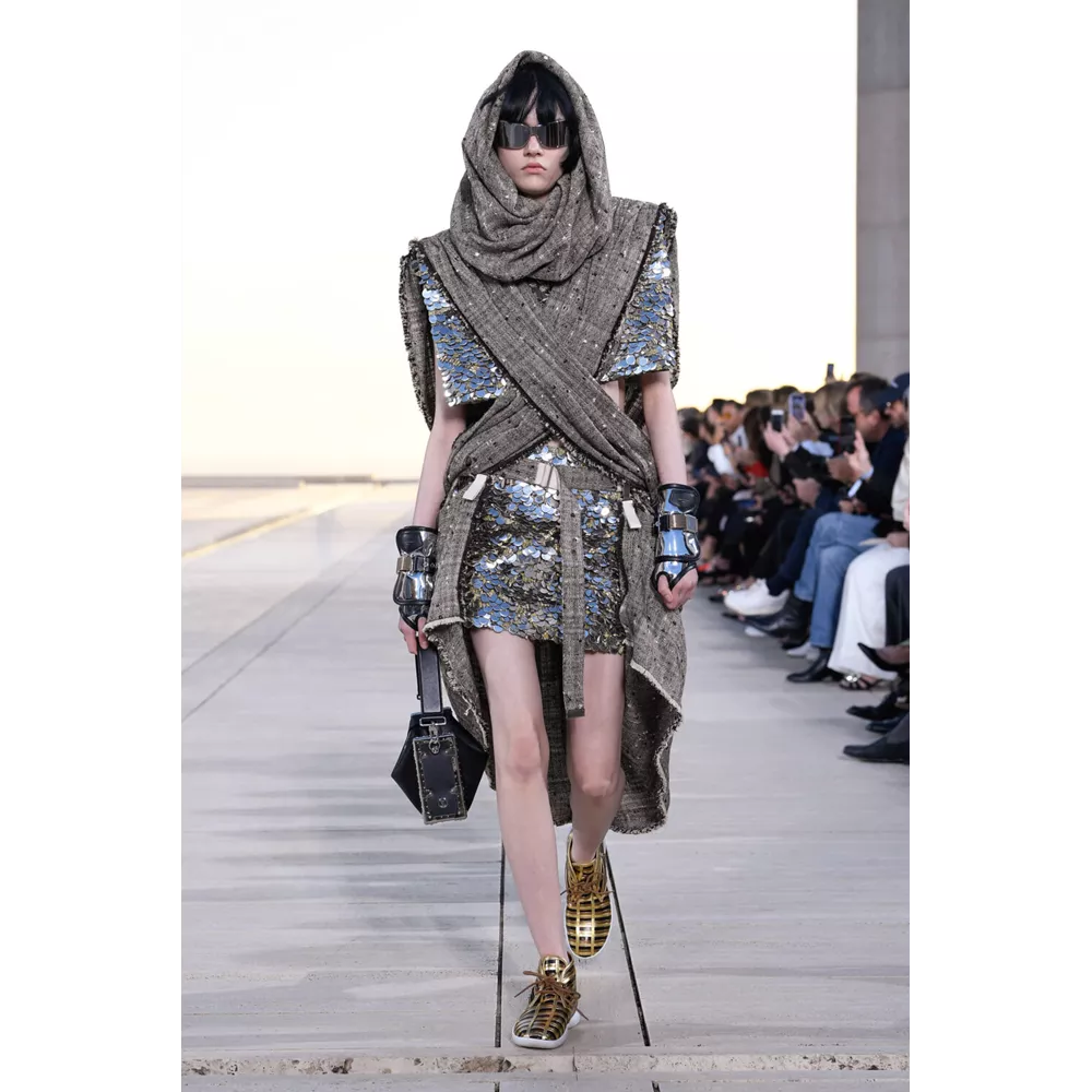 Αν έπρεπε να περιγράψουμε με πολύ συνοπτικά λόγια την Cruise 2023, θα λέγαμε ότι οι σύγχρονοι νομάδες βρήκαν τη συλλογή τους. Τα υλικά (μέταλλο) και υφάσματα (λινό, ζακάρ, μετάξι, δέρμα) που αξιοποιεί ο Nicolas Ghesquière δημιουργούν μια metallic παλέτα σε χρυσό και ασημί, που είναι κυρίαρχη, και συνθέτουν σιλουέτες που μοιάζουν βγαλμένες από την γκαρνταρόμπα ενός δυστοπικού sci-fi σύμπαντος. To show άνοιξαν μοντέλα ντυμένα με ογκώδη φορέματα με κουκούλες που έμοιαζαν σαν κομμάτια που αποσπάστηκαν από τους βράχους στο περιβάλλον τοπίο, ενώ η συνέχεια ανήκε σε πιο μεταμοντέρνα looks που συνδυάζουν sporty και sexy στοιχεία, αλλά και την cool Καλιφορνέζικη αύρα.