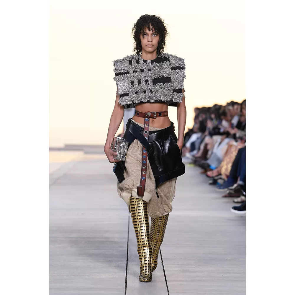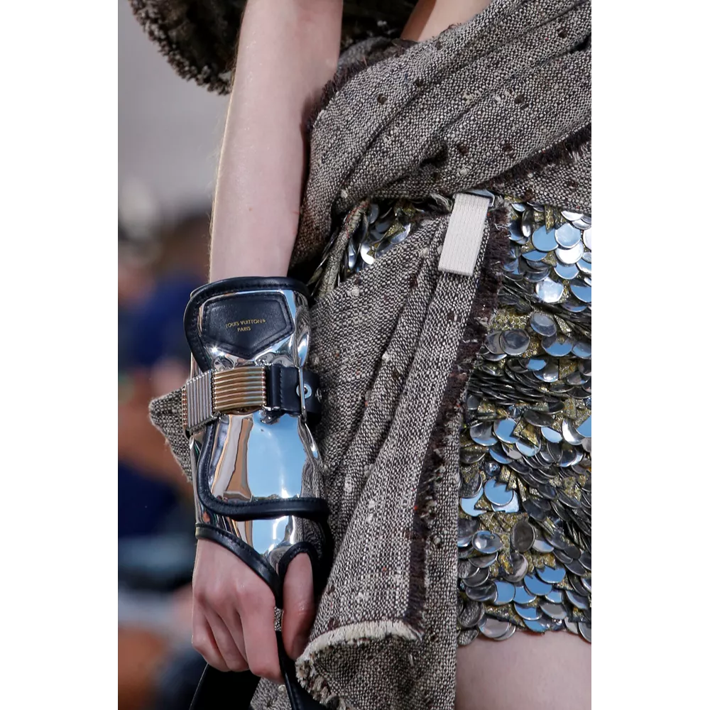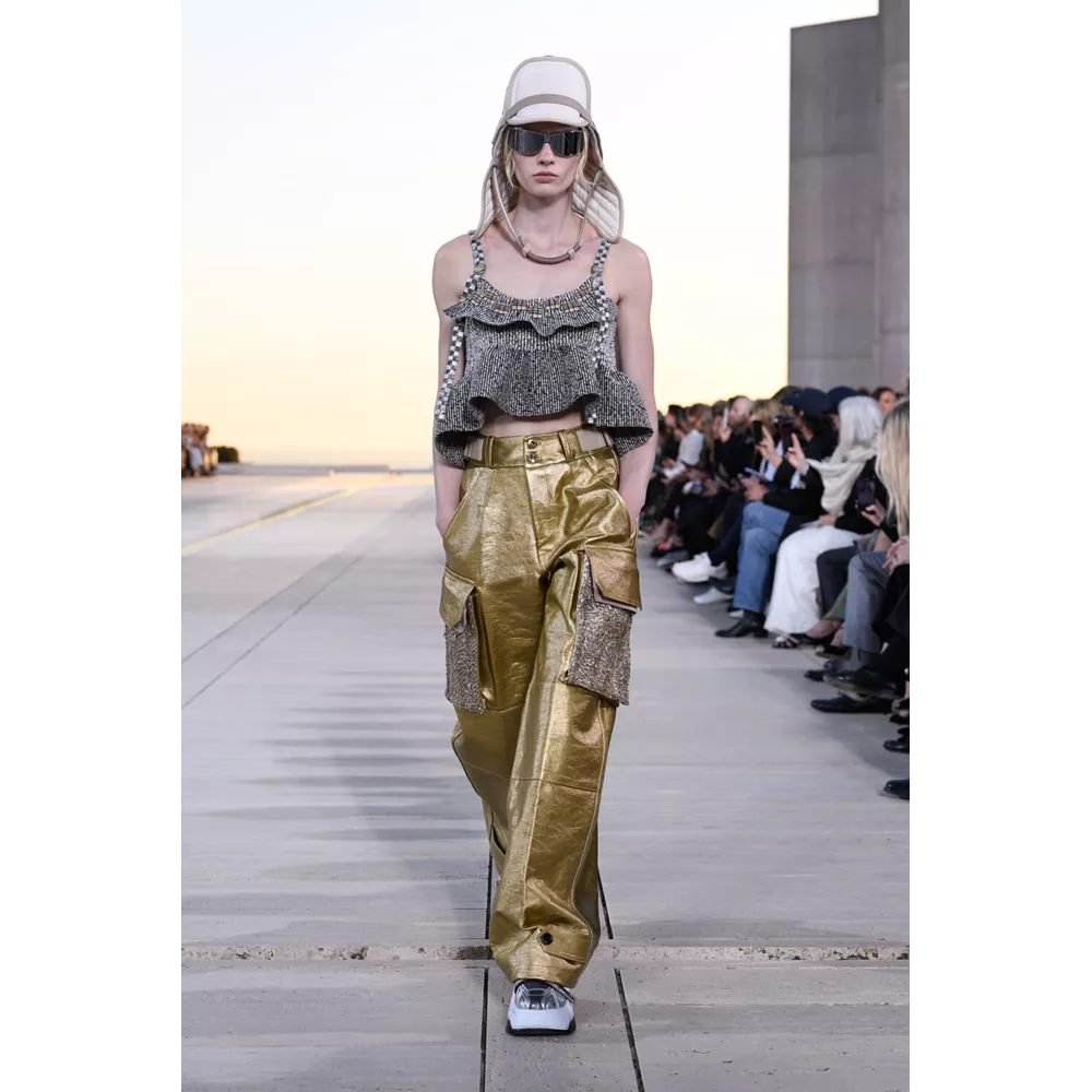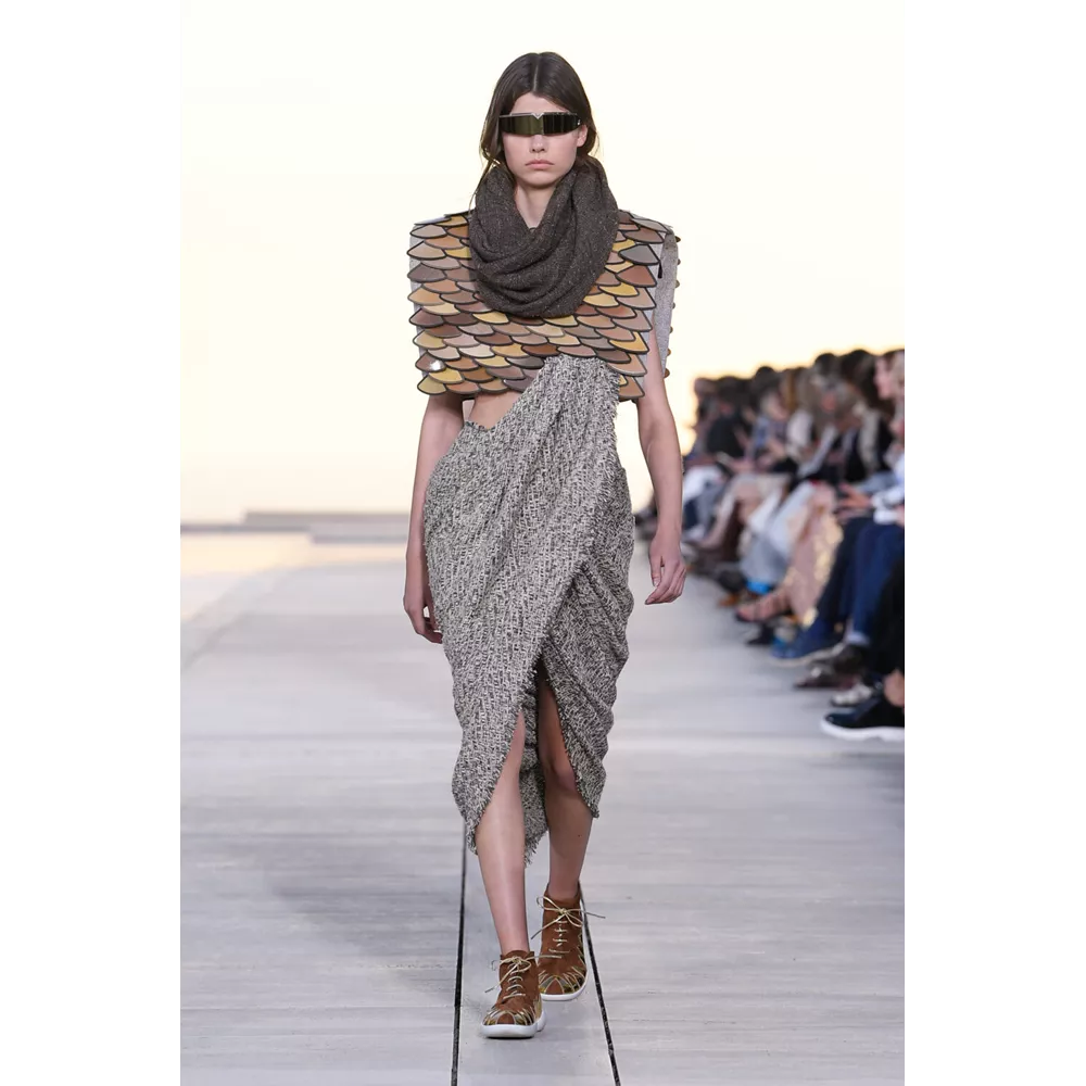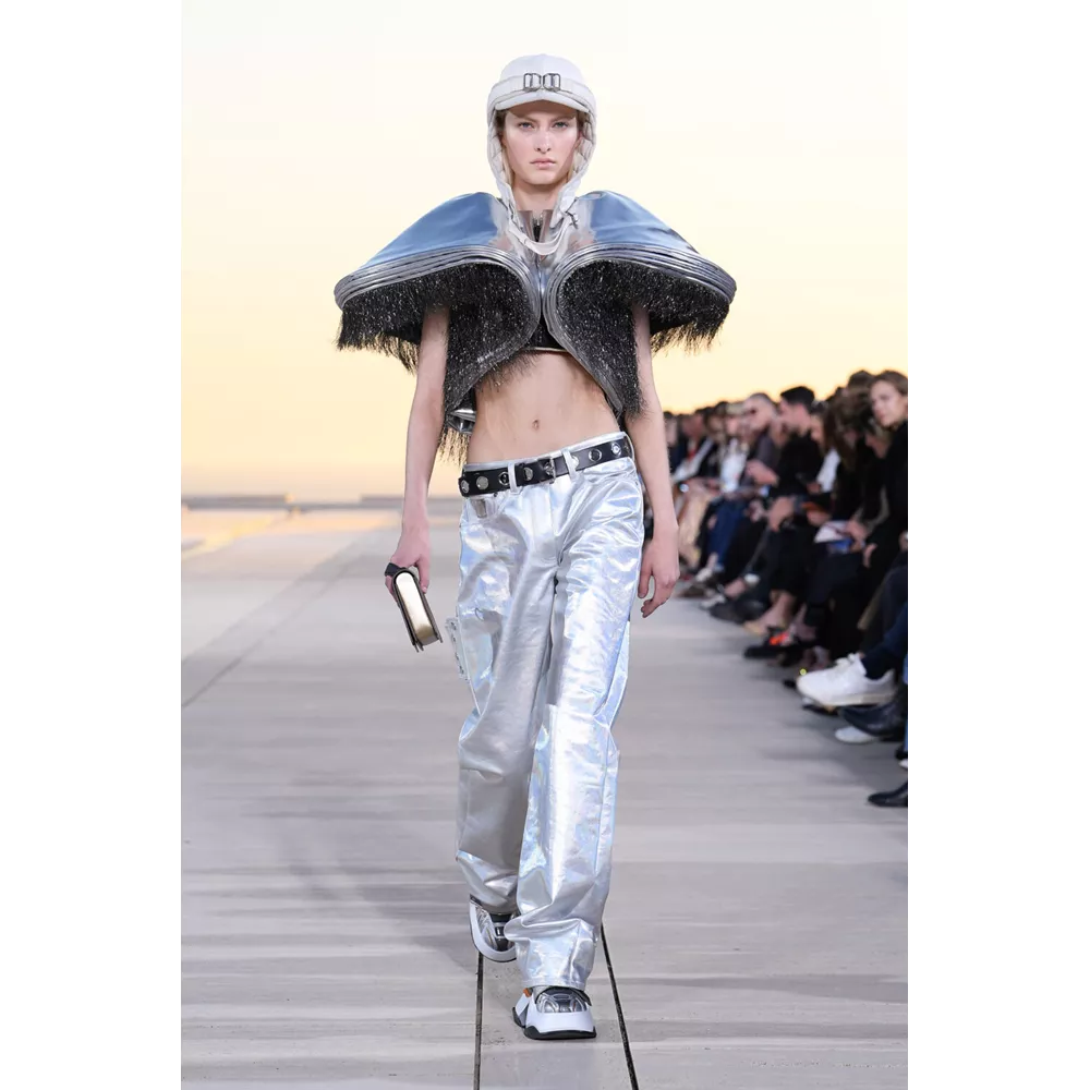 Αν έπρεπε να περιγράψουμε με πολύ συνοπτικά λόγια την Cruise 2023, θα λέγαμε ότι οι σύγχρονοι νομάδες βρήκαν τη συλλογή τους. Τα υλικά (μέταλλο) και υφάσματα (λινό, ζακάρ, μετάξι, δέρμα) που αξιοποιεί ο Nicolas Ghesquière δημιουργούν μια metallic παλέτα σε χρυσό και ασημί, που είναι κυρίαρχη, και συνθέτουν σιλουέτες που μοιάζουν βγαλμένες από την γκαρνταρόμπα ενός δυστοπικού sci-fi σύμπαντος. To show άνοιξαν μοντέλα ντυμένα με ογκώδη φορέματα με κουκούλες που έμοιαζαν σαν κομμάτια που αποσπάστηκαν από τους βράχους στο περιβάλλον τοπίο, ενώ η συνέχεια ανήκε σε πιο μεταμοντέρνα looks που συνδυάζουν sporty και sexy στοιχεία, αλλά και την cool Καλιφορνέζικη αύρα.