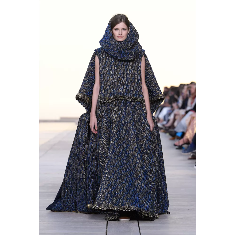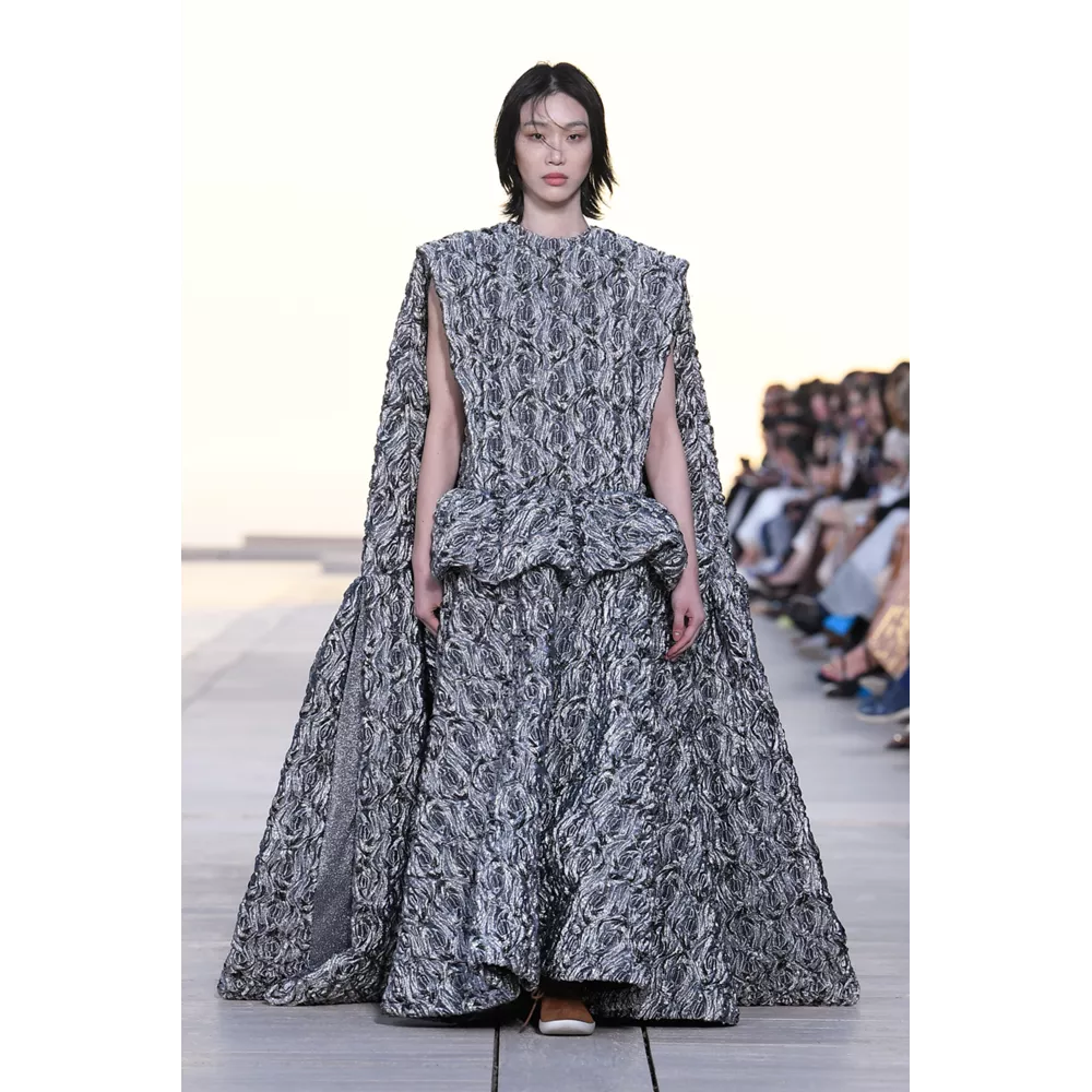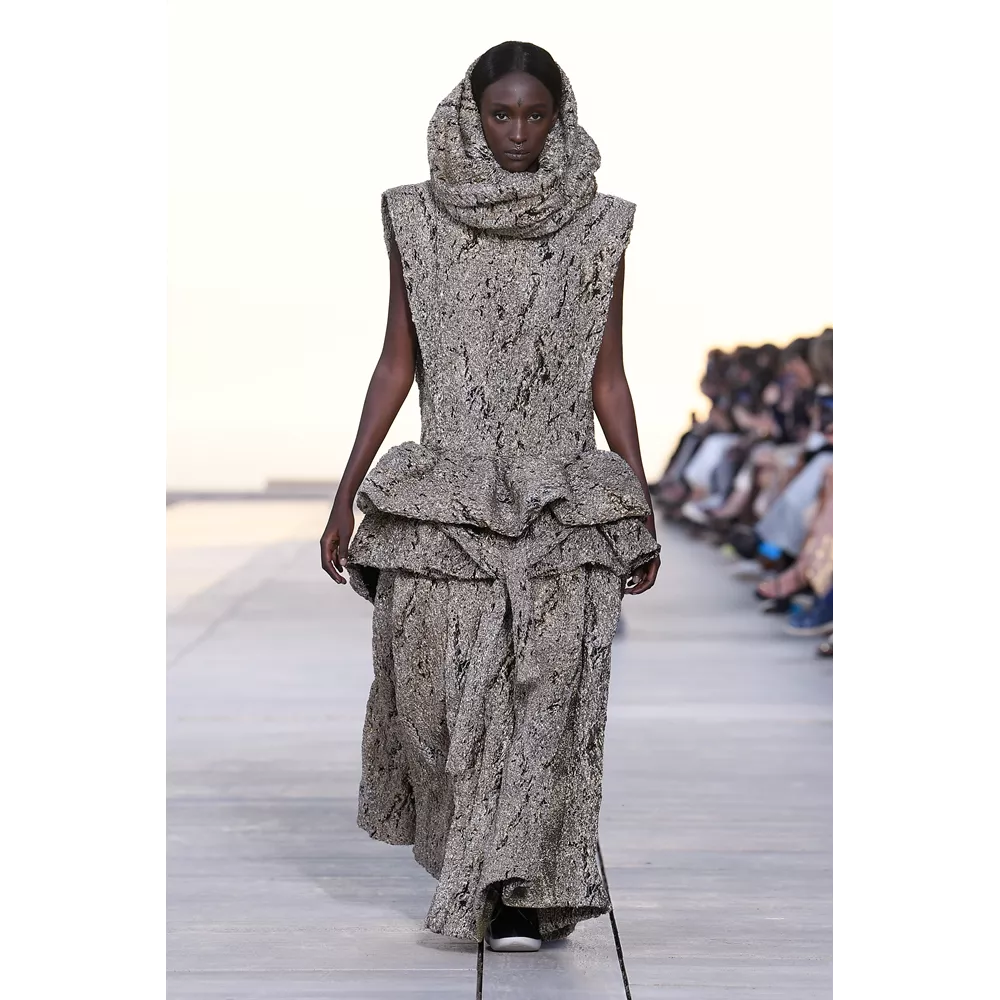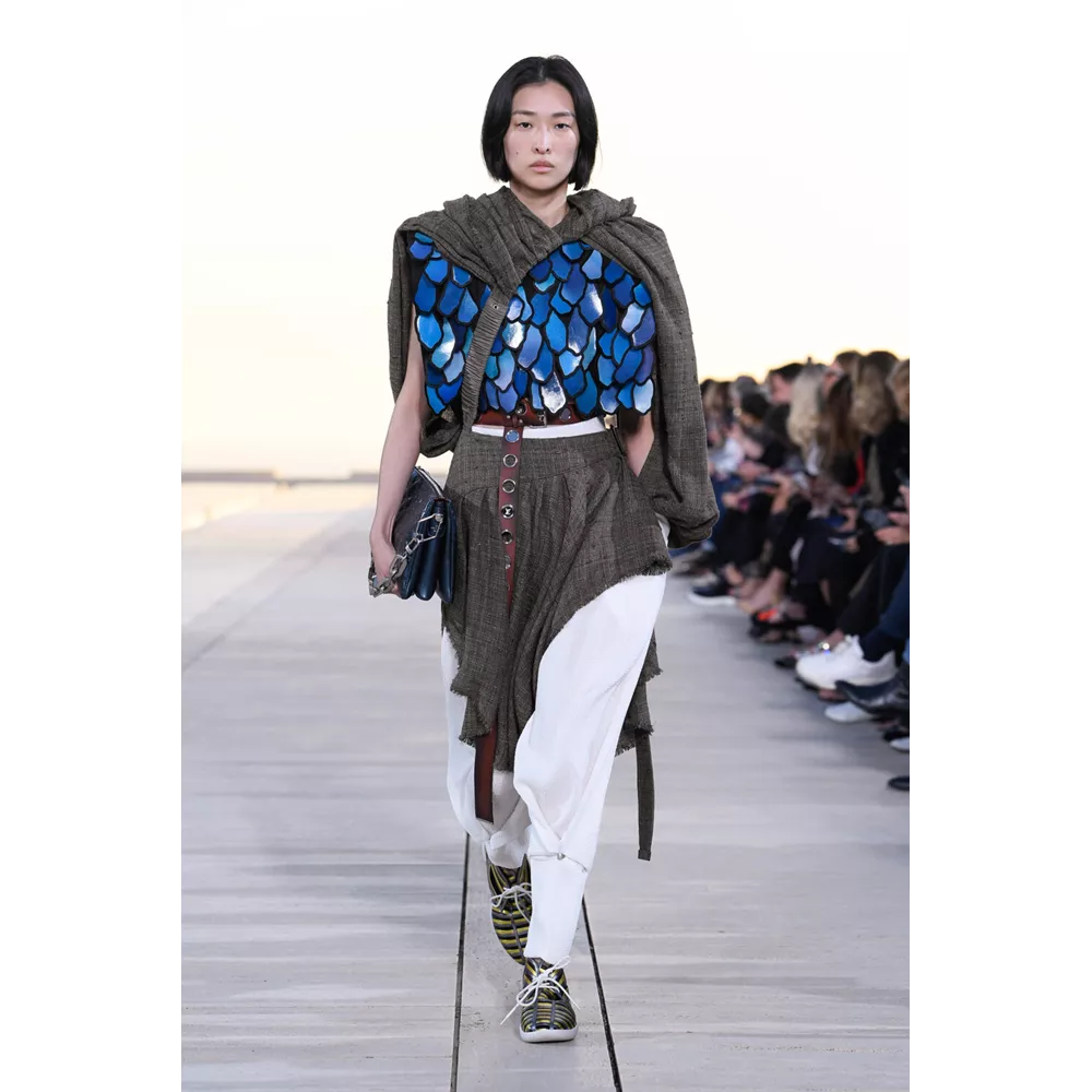 Αν έπρεπε να περιγράψουμε με πολύ συνοπτικά λόγια την Cruise 2023, θα λέγαμε ότι οι σύγχρονοι νομάδες βρήκαν τη συλλογή τους. Τα υλικά (μέταλλο) και υφάσματα (λινό, ζακάρ, μετάξι, δέρμα) που αξιοποιεί ο Nicolas Ghesquière δημιουργούν μια metallic παλέτα σε χρυσό και ασημί, που είναι κυρίαρχη, και συνθέτουν σιλουέτες που μοιάζουν βγαλμένες από την γκαρνταρόμπα ενός δυστοπικού sci-fi σύμπαντος. To show άνοιξαν μοντέλα ντυμένα με ογκώδη φορέματα με κουκούλες που έμοιαζαν σαν κομμάτια που αποσπάστηκαν από τους βράχους στο περιβάλλον τοπίο, ενώ η συνέχεια ανήκε σε πιο μεταμοντέρνα looks που συνδυάζουν sporty και sexy στοιχεία, αλλά και την cool Καλιφορνέζικη αύρα.