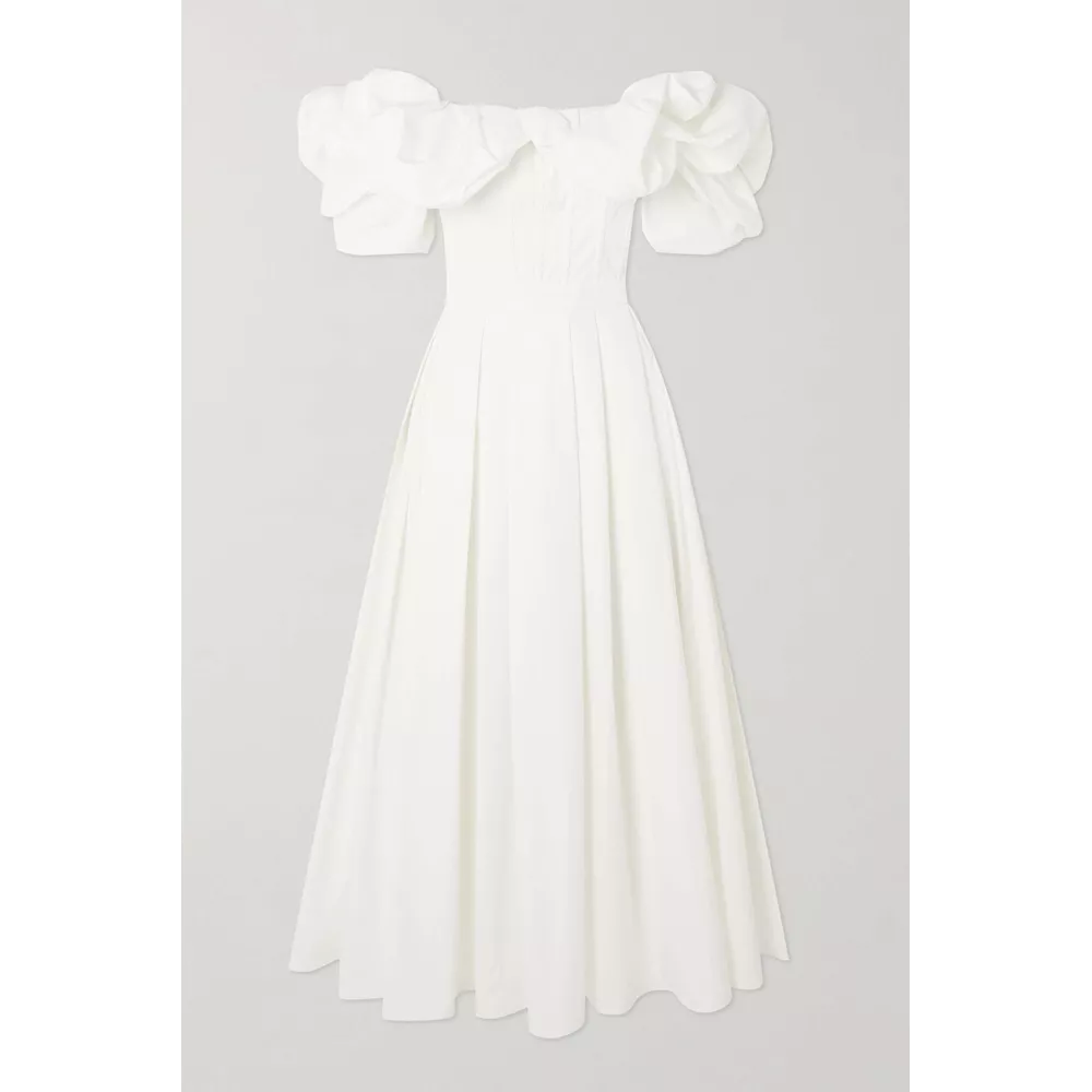 Off-the-shoulder πλισέ μάξι φόρεμα από βαμβακερή ποπλίνα, Alexander McQueen.