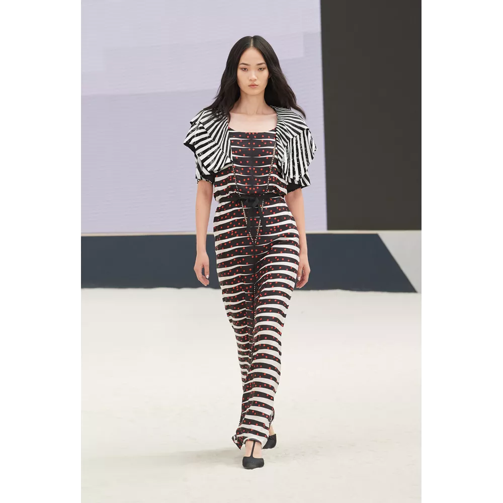 Στρογγυλεμένοι ώμοι, square backs και κεντήματα με γεωμετρικά σχήματα και μοτίβα κλείνουν επίσης το μάτι στη μόδα της δεκαετίας του 1930, ενώ κοιτούν παράλληλα και στα '70s, απηχώντας τον Κονστρουκτιβισμό που αντικατοπτρίζεται και στο "graphic" ντεκόρ του Veilhan  – σε συνέχεια πάντα του προηγούμενο show, αλλά και την ιδιαίτερη σχέση του Karl Lagerfeld με τη συγκεκριμένη καλλιτεχνική έννοια.