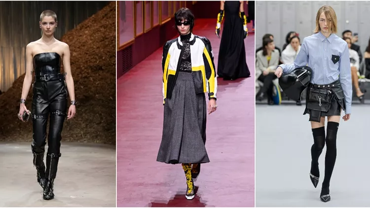 Ο οίκος Dior στη συλλογή του για τη σεζόν Φθινόπωρο- Χειμώνας 2022-23 συνδυάζει το moto jacket με tailored φούστες και δαντελένια τοπ ενώ φοράει στα μοντέλα με τα μαύρα μάξι βραδινά φορέματα racing οπερατικά γάντια. Από την άλλη, ο οίκος Alexander McQueen ντύνει με δέρμα θηλυκές σιλουέτες όπως στράπλες ασύμμετρα φορέματα και ολόσωμες φόρμες με bold χαρακτηριστικά όπως φερμουάρ και ζώνες κατά μήκος του ενδύματος, ενώ ο Saint Laurent ενισχύει τη μινιμαλιστική αισθητική με edgy στοιχεία συνδυάζοντας δερμάτινα aviator jackets με σατέν slip φορέματα.