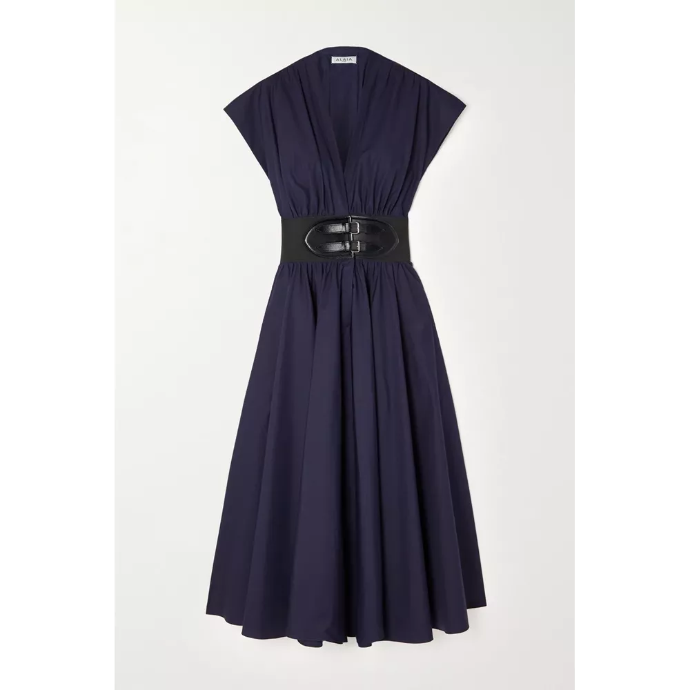 Navy πλισέ μίντι φόρεμα με ζώνη, Alaïa.