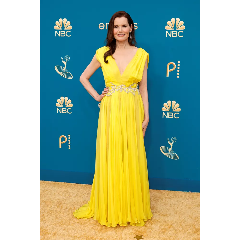 H Geena Davis με φόρεμα Rani Zakhem σε κίτρινο χρώμα.