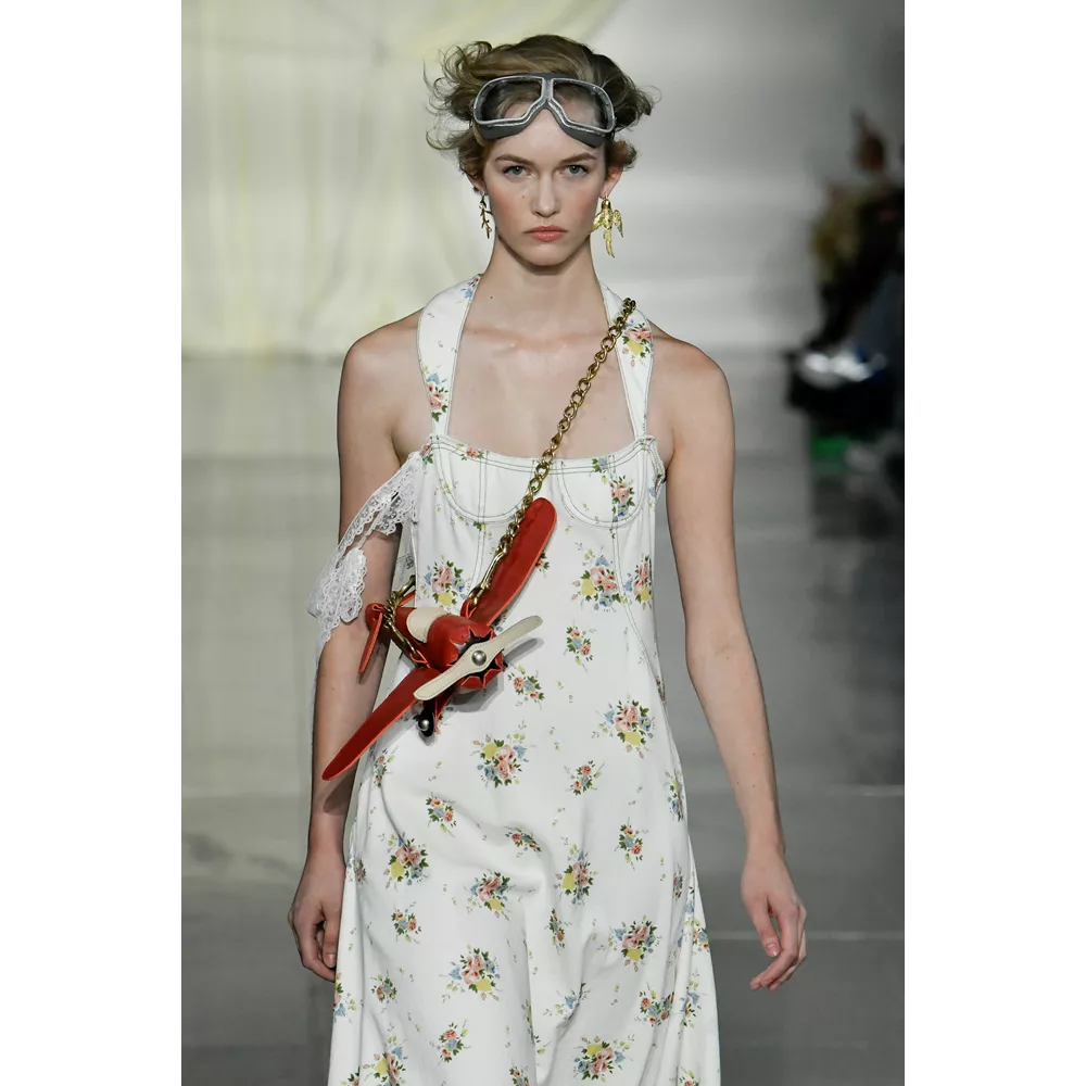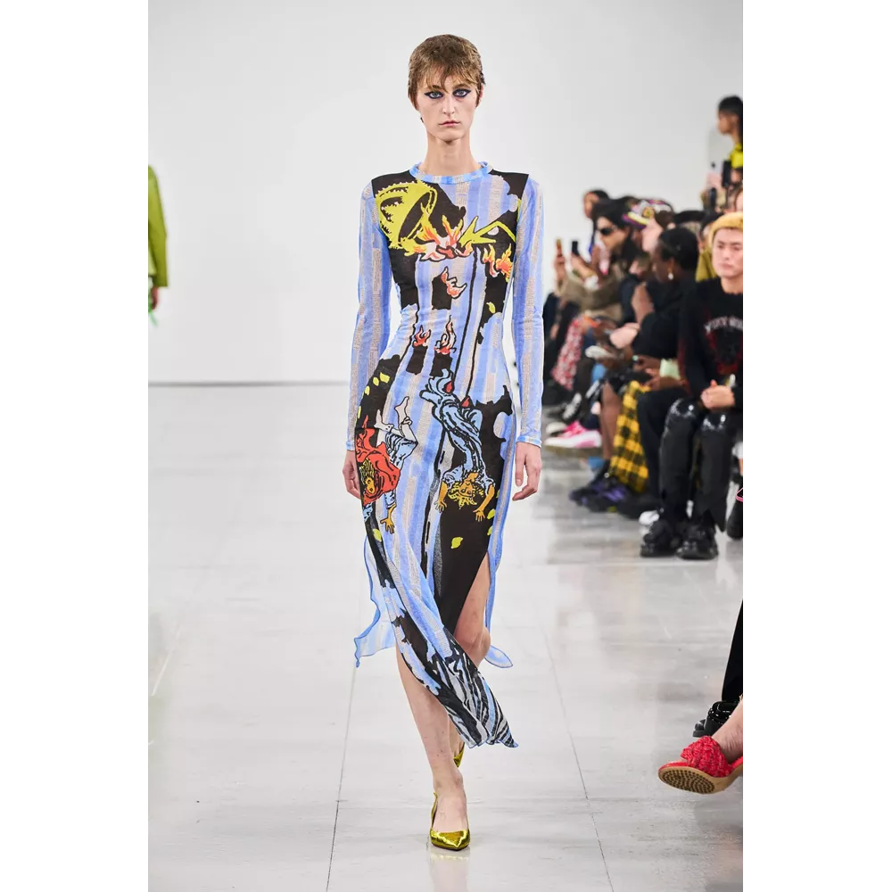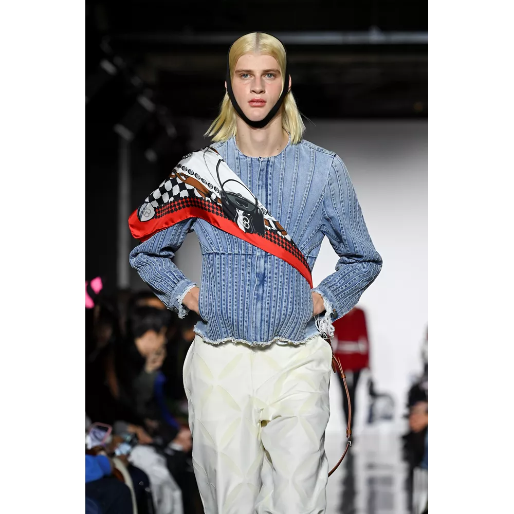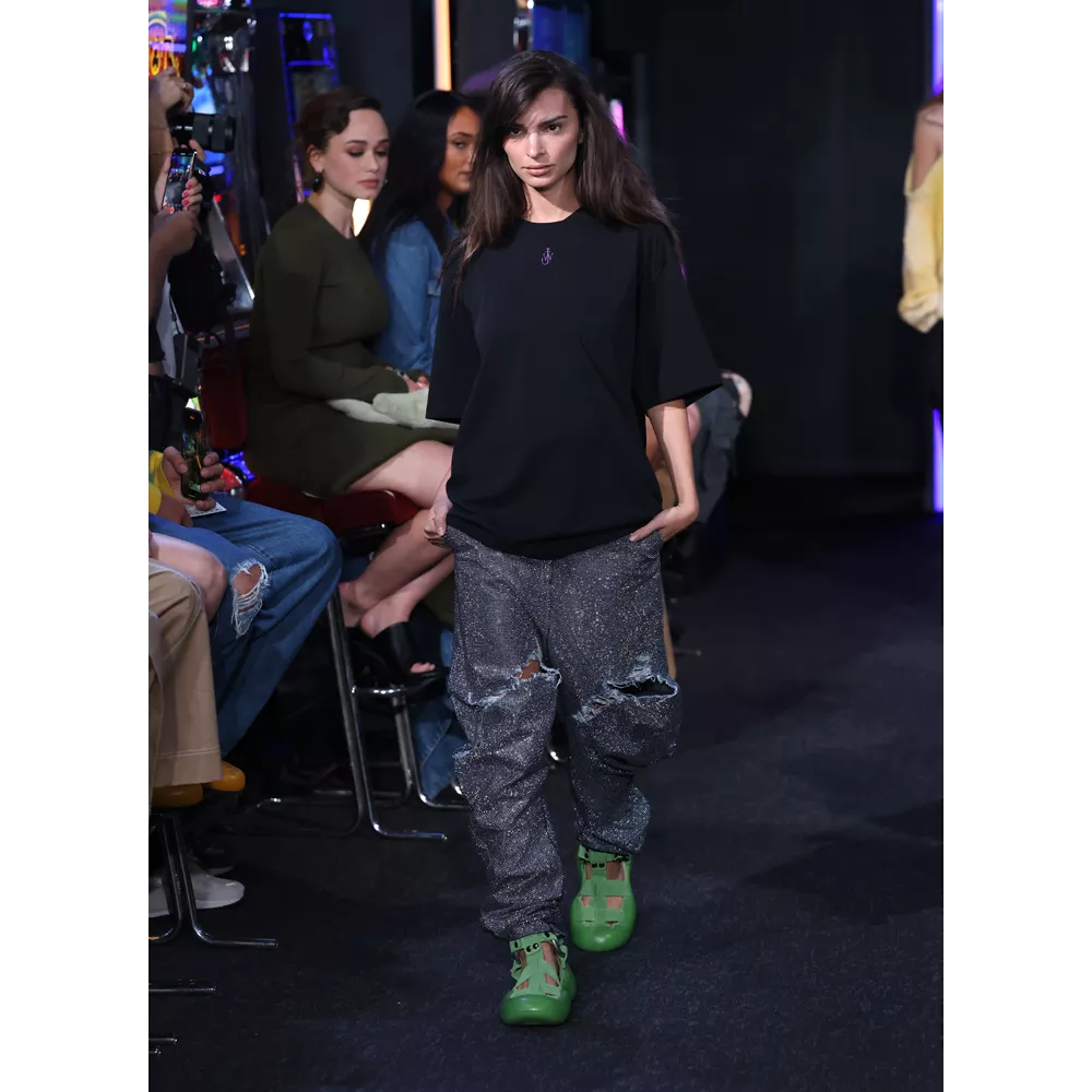 -Τον νεο-σουρεαλισμό του JW Anderson που για την SS'23 συλλογή αντλεί την έμπνευσή του, όπως δήλωσε ο ίδιος, από "το παράλληλο σύμπαν των ανθρώπων που είναι παγιδευμένοι στους υπολογιστές του" και δημιουργεί φορέματα - πληκτρολόγια, t-shirt dresses με logos από διάφορες γραμματοσειρές, ένα φόρεμα - μεταλλική σφαίρα και δυο που μιμούνται τις πλαστικές σακούλες μέσα στις οποίες μεταφέρονται τα χρυσόψαρα. Την ίδια στιγμή, στέλνει στην πασαρέλα ένα από τα πιο σέξι μοντέλα του πλανήτη, την Emily Ratajkowski, ντυμένη σχεδόν ...σεμνά, με μαύρο t-shirt και φαρδύ παντελόνι με σκισίματα. Bonus extravaganza, ο τρόπος που ο πολυτάλαντος Βρετανός σχεδιαστή συστήνει να φορέσουμε τα πουλόβερ: με την κρεμάστρα περασμένη στον λαιμό και τον γιακά- ζιβάγκο να κοιτάει προς τα κάτω!