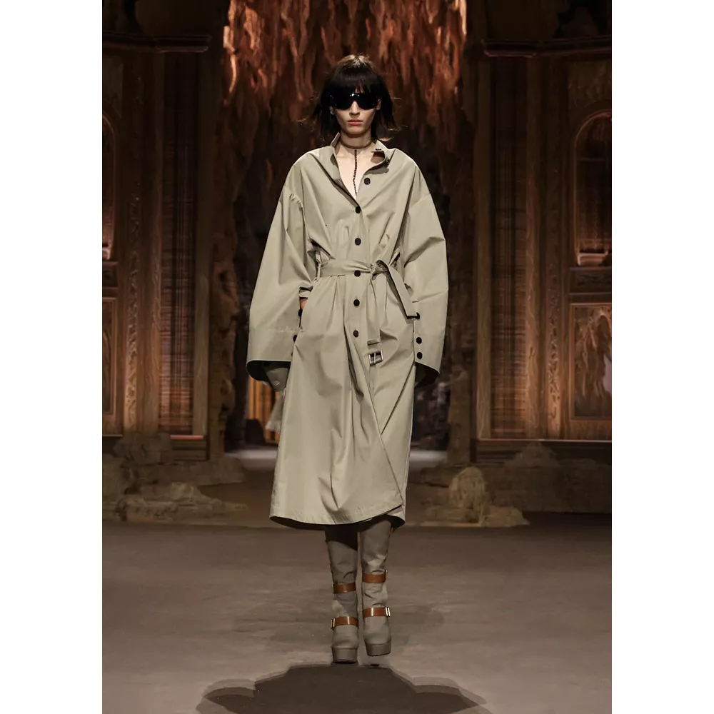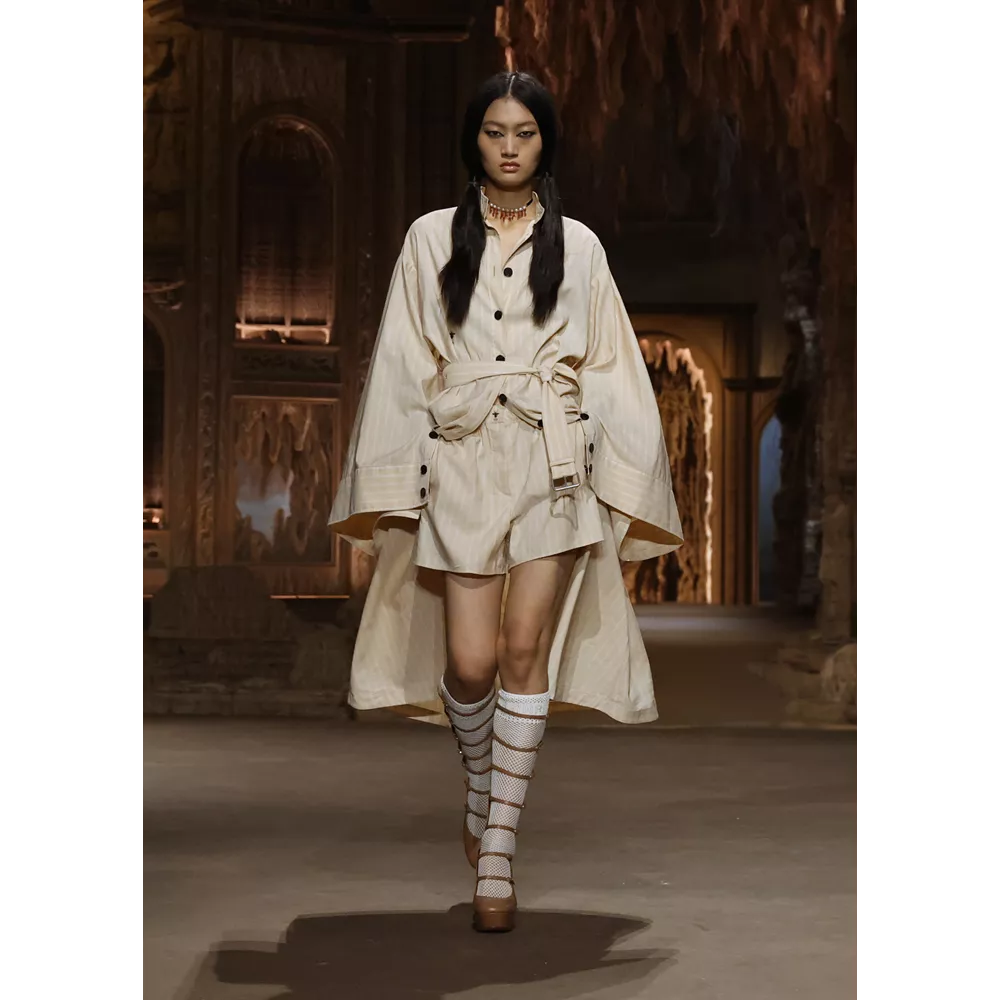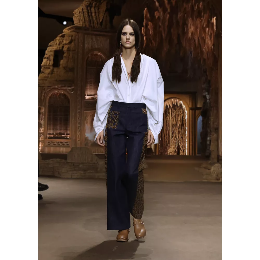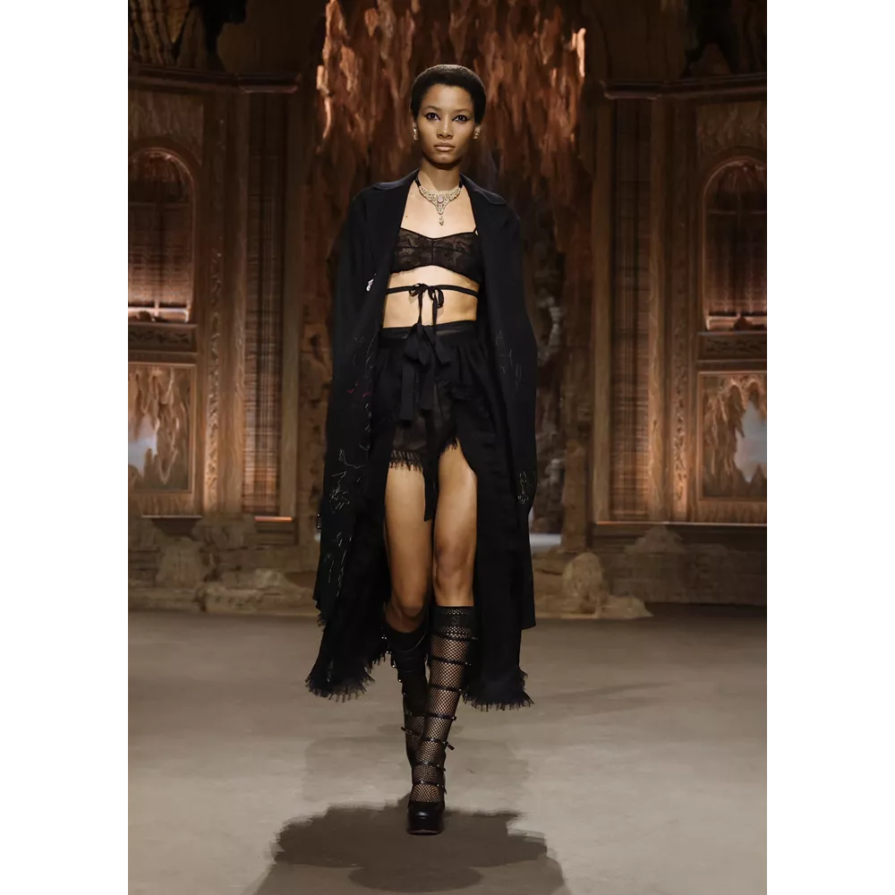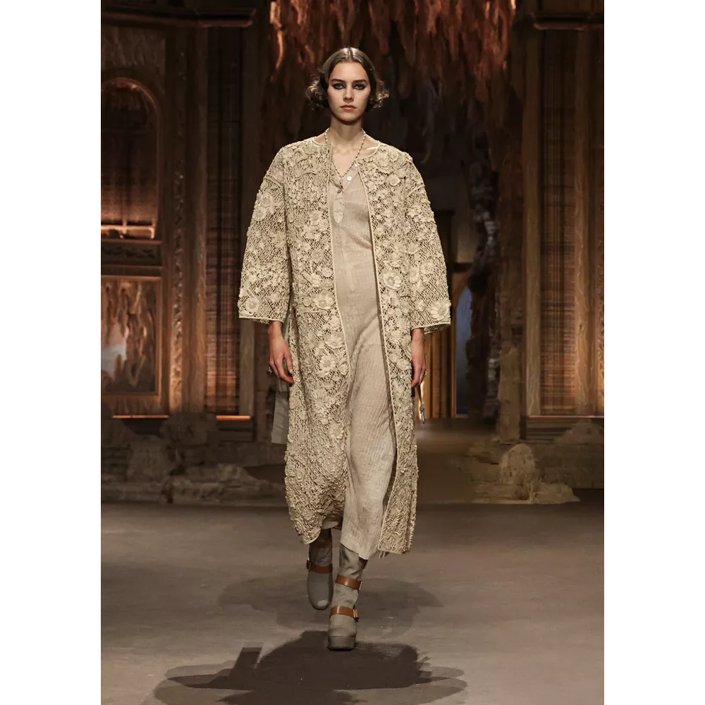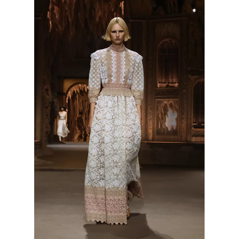 Το πολύ ιδιαίτερο σκηνικό που φιλοξένησε το catwalk, τα μπαρόκ σπήλαια φτιαγμένα εξ' ολοκλήρου από χαρτόνι, έχει την υπογραφή της Γαλλίδας καλλιτέχνιδος Eva Jospin, και αντανακλά την προνομιούχα σχέση που οι γυναίκες έχουν με τη φύση [ σ.σ.: στη συλλογή οι γήινες και ουδέτερες αποχρώσεις είναι κυρίαρχες], ενώ κατά τη διάρκεια του catwalk ντουέτα χορευτών απέδιδαν τη χορογραφία των Imre van Opstal και Marne van Opstal, ως ένα καλλιτεχνικό ιντερμέδιο στην πασαρέλα [σ.σ.: η Αικατερίνη των Μεδίκων ήταν πάτρωνας και υποστηρικτής των τεχνών στην εποχή της, η Maria Grazia Chiuri είναι λάτρης των τεχνών και έχει ράψει τα κοστούμια ως καλλιτεχνική διευθύντρια του Dior για παραστάσεις μπαλέτου και σύγχρονου χορού ], ενώ ήταν ντυμένοι με κορμάκια που έδιναν την εντύπωση ότι δεν φορούσαν τίποτα υπογραμμίζοντας μ' ένα έμμεσο τρόπο ότι πριν τα ρούχα, πριν από οποιαδήποτε ενδυμασία - όπως αυτές εμφανίστηκαν η μία μετά την άλλη στην πασαρέλα- προηγείται το γυμνό σώμα.