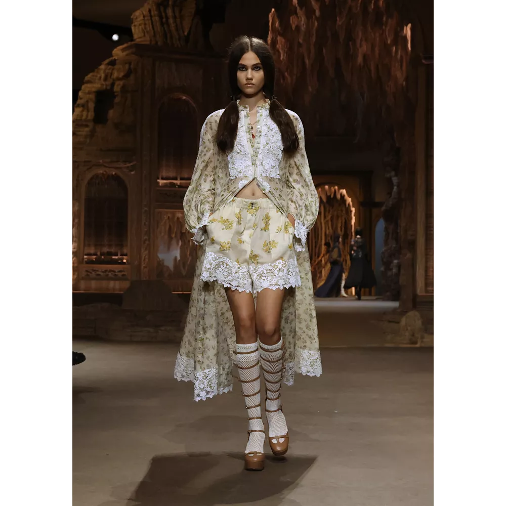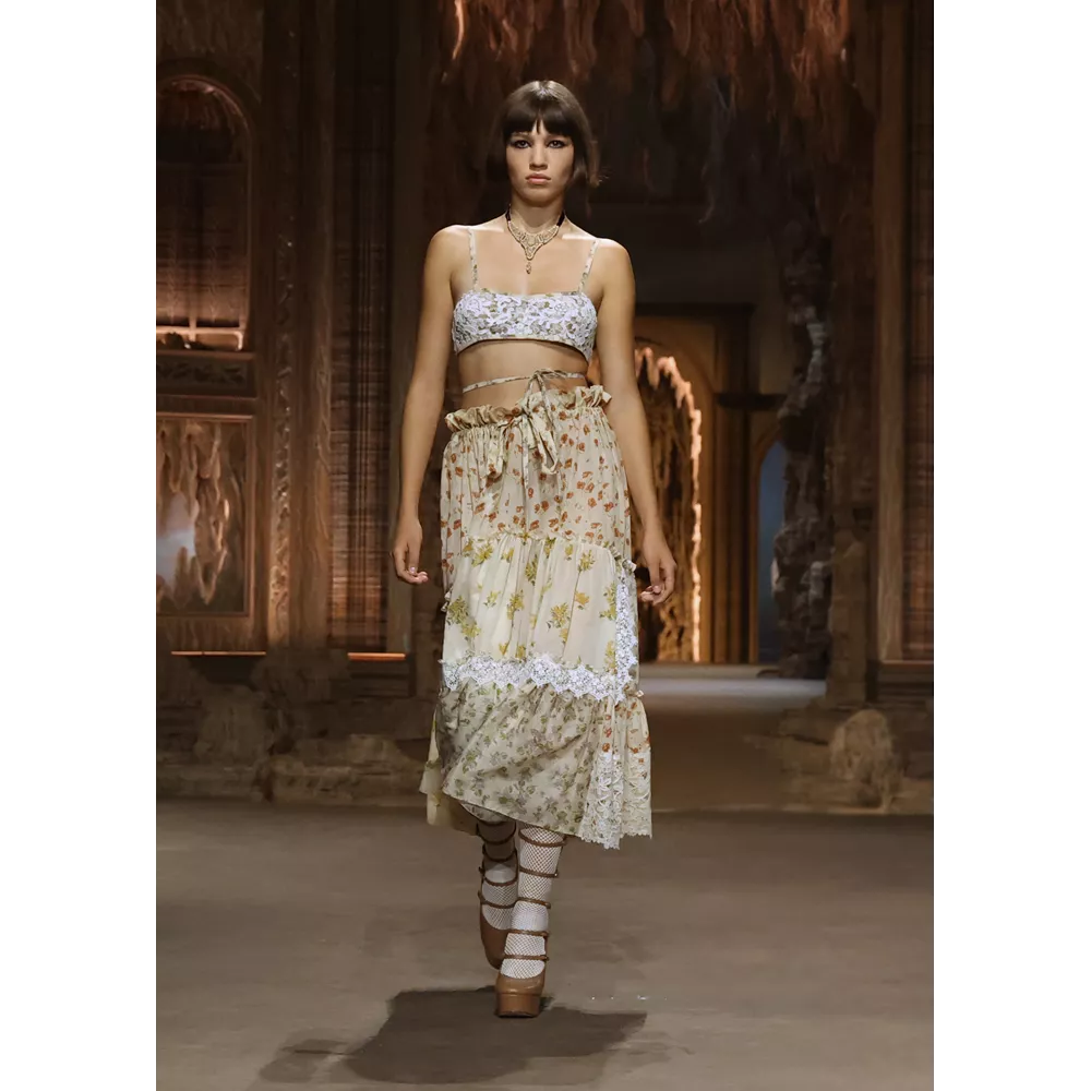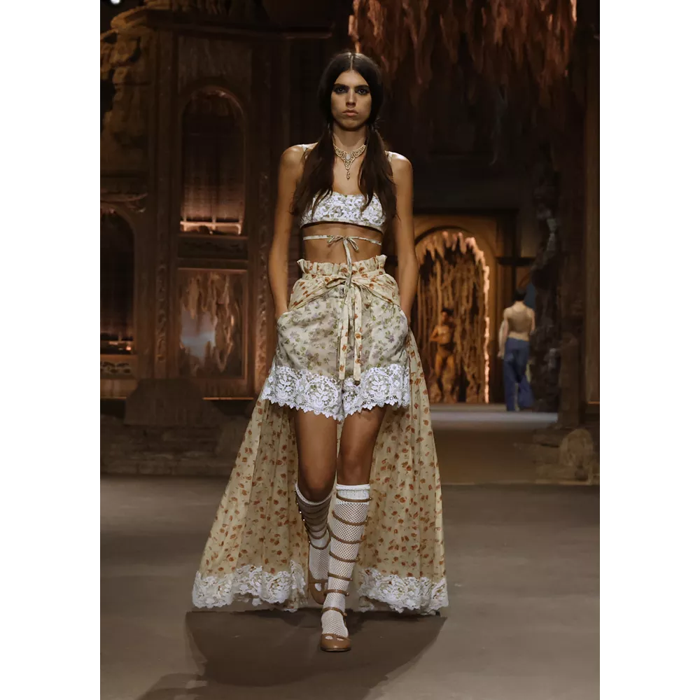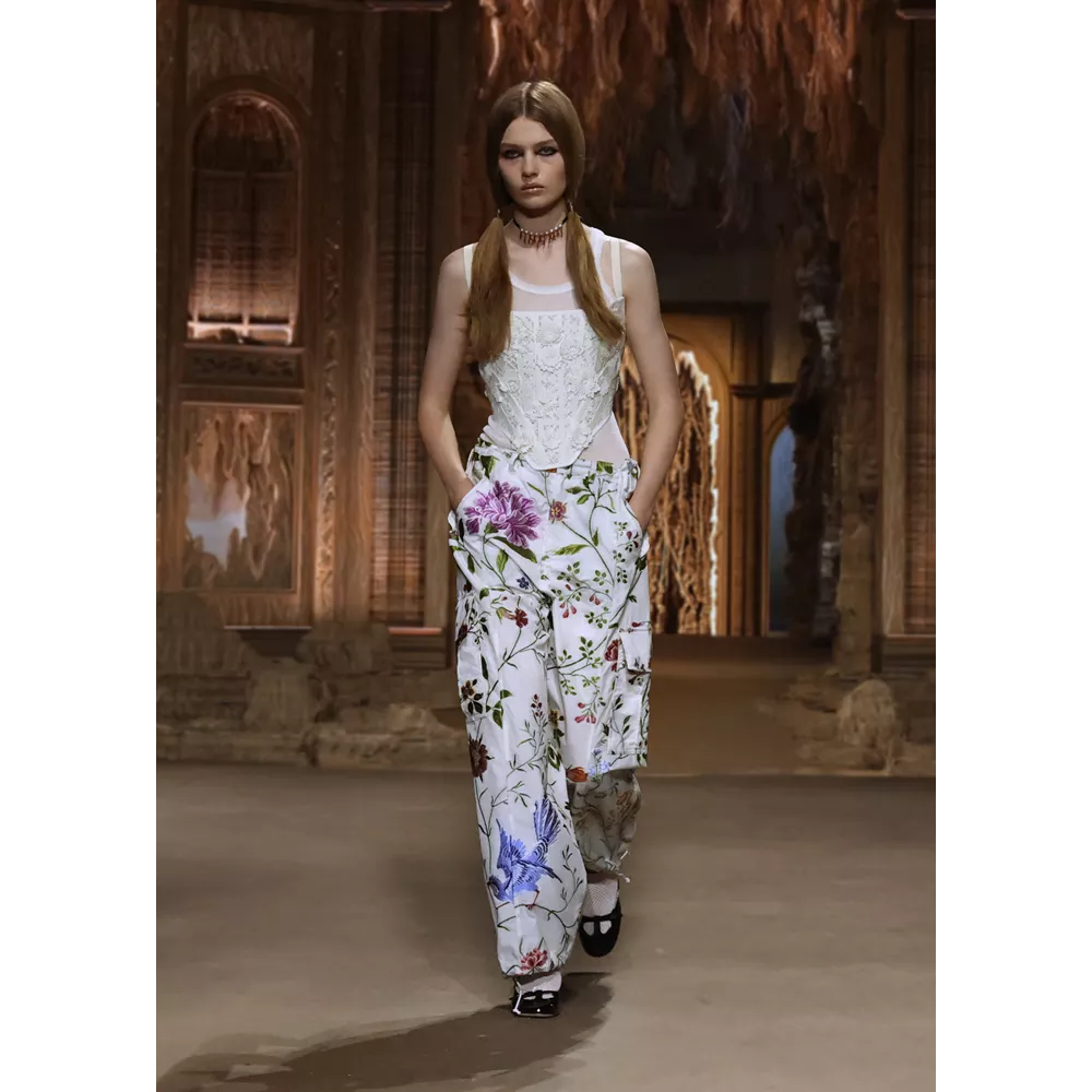 Στα "μετα- royal" looks της Dior, η Maria Grazia Chiuri αναβαθμίζει τους κορσέδες δίνοντας τους ένα πιο αυστηρό γεωμετρικό σχήμα που "παγιδεύει" το μπούστο και τους συνδυάζει με cargo pants και λευκά πουκάμισα σε outfits της καθημερινότητας , σαν οι κορσέδες να αποτελούσαν μέρος του day- to - day styling από καιρό. Ενώ από την άλλη, τα guêpière (τα εσώρουχα- μπάσκες), άλλες φορές φανερά κι άλλες κρυμμένα, σχηματίζουν σιλουέτες που θυμίζουν τις φαρδιές, φουσκωτές, τονισμένες στους γοφούς φούστες από τα φορέματα στην Αυλή της Αικατερίνης των Μεδίκων και προσφέρουν μία fairytale όσο και δυναμική πρόταση για το στιλ της Άνοιξης. Ως μία πατρογονική κληρονομία τα raffia coats διακοσμημένα με φλοράλ μοτίβα και μοτίβα από πουλιά, έρχονται επίσης αναβαθμισμένα μέσα από τη δημιουργικότητα και τη σύγχρονη ματιά της Chiuri.