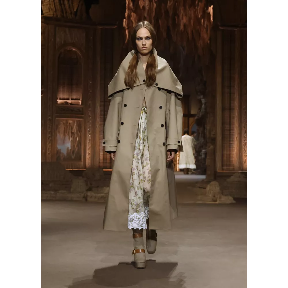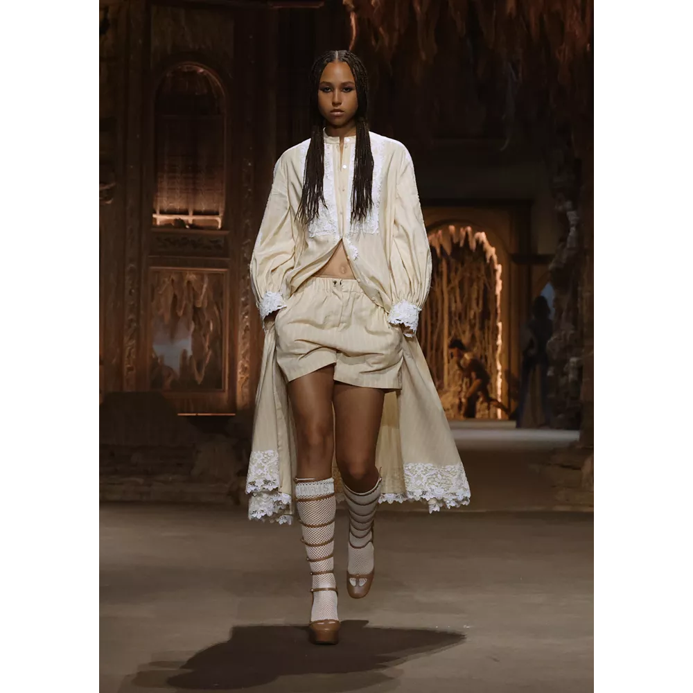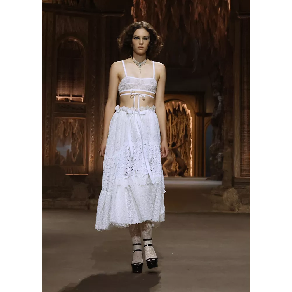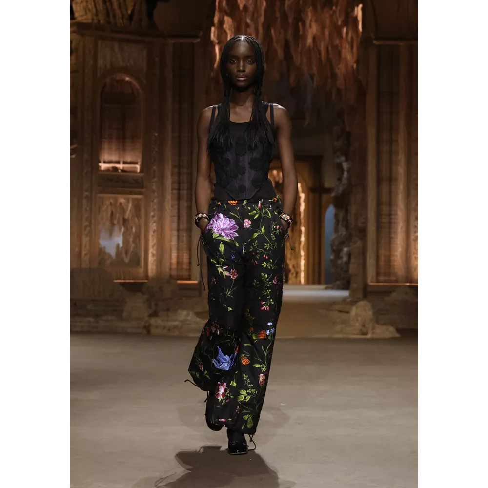 Στα "μετα- royal" looks της Dior, η Maria Grazia Chiuri αναβαθμίζει τους κορσέδες δίνοντας τους ένα πιο αυστηρό γεωμετρικό σχήμα που "παγιδεύει" το μπούστο και τους συνδυάζει με cargo pants και λευκά πουκάμισα σε outfits της καθημερινότητας , σαν οι κορσέδες να αποτελούσαν μέρος του day- to - day styling από καιρό. Ενώ από την άλλη, τα guêpière (τα εσώρουχα- μπάσκες), άλλες φορές φανερά κι άλλες κρυμμένα, σχηματίζουν σιλουέτες που θυμίζουν τις φαρδιές, φουσκωτές, τονισμένες στους γοφούς φούστες από τα φορέματα στην Αυλή της Αικατερίνης των Μεδίκων και προσφέρουν μία fairytale όσο και δυναμική πρόταση για το στιλ της Άνοιξης. Ως μία πατρογονική κληρονομία τα raffia coats διακοσμημένα με φλοράλ μοτίβα και μοτίβα από πουλιά, έρχονται επίσης αναβαθμισμένα μέσα από τη δημιουργικότητα και τη σύγχρονη ματιά της Chiuri.