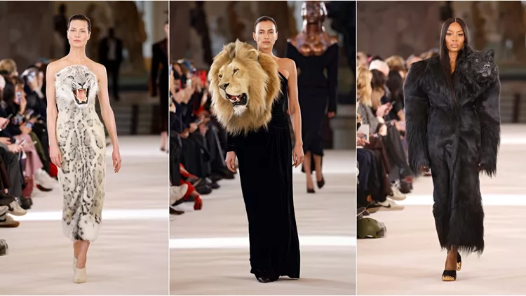 Αλλά ας τα πάρουμε από την αρχή. Νωρίτερα σήμερα 23 Ιανουαρίου, η Paris Couture Week σήκωσε αυλαία με το show του οίκου Schiaparelli το οποίο πραγματοποιήθηκε στο Le Petit Palais στο Παρίσι. Ήδη, από τις αφίξεις των celebrities- καλεσμένων στο front row έγινε σαφές ότι μία πληθωρική, σκόπιμα σοκαριστική, extravaganza κρύβεται πίσω από τις προθέσεις του σχεδιαστή για τη νέα collection: η Kylie Jenner εμφανίζεται φορώντας ένα μάξι στράπλες βραδινό φόρεμα από βελούδο που το συμπλήρωνε ως διακοσμητικό μια τεράστια κεφαλή λιονταριού, ενώ η Doja Cat έφτασε ως μία παραλλαγή της ...Mystique (Χ-Men) καλυμμένη στο κεφάλι και το σώματα της με 30.000 κρυστάλλους Swarovski σε πορφυρό χρώμα τοποθετημένους με το χέρι και ένα κόκκινο στράπλες μίνι φόρεμα με φούστα κεντημένη με στρογγυλές χάντρες.