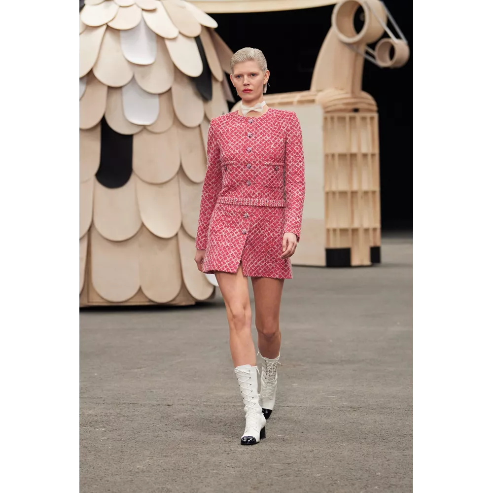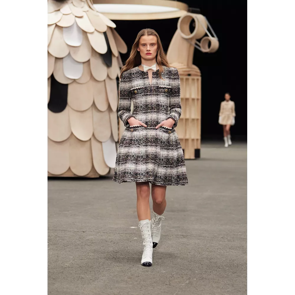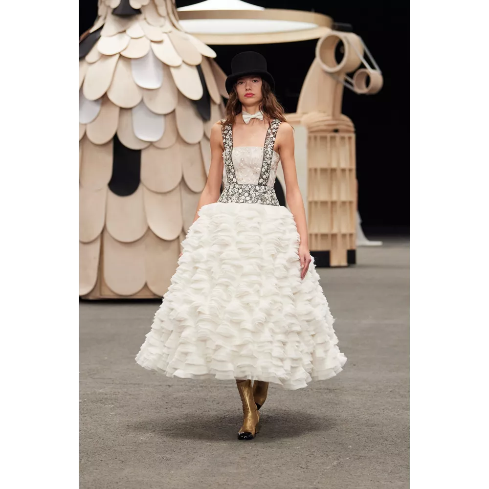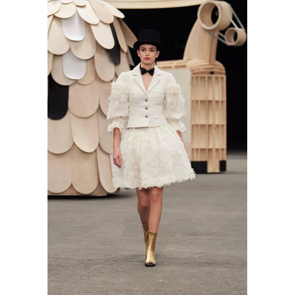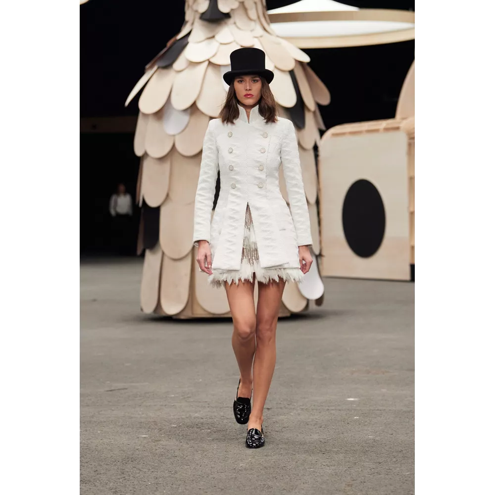 To show που φιλοξενήθηκε στο Grand Palais Ephemere στο Παρίσι ξεκίνησε με τη εμφάνιση στην πασαρέλα- που έμοιαζε με αρένα γηπέδου- των γιγάντιων ξύλινων κατασκευών που ο Xavier Veilhan εμπνεύστηκε από τα διακοσμητικά στο διαμέρισμα της Chanel. Ως άλλοι Δούρειοι Ίπποι, οι κατασκευές από ξύλο, χαρτόνι και χαρτί που μιμούνται μεταξύ άλλων τη μορφή ενός πουλιού, μίας καμήλας, ενός σκύλου, ενός ελέφαντα και του αγαπημένου τόσο της Viard όσο και το Veilhan, αλόγου, ανοίγουν και από μέσα στους εμφανίζονται τα μοντέλα τα οποία παρουσιάζουν τα πρώτα looks της collection. Την αρχή, βεβαίως, κάνει η Vivienne Rohner με το λευκό tweed coatdress, τα loafers σε λουστρίνι και το ψηλό μαύρο καπέλο με τα οποία την είδαμε και στο teaser της haute couture συλλογής. "Μου αρέσει όταν ένα θαυμαστό ξέσπασμα συμβαίνει εμπρός μας και διακόπτει τη ροή των πραγμάτων", θα πει η Viard για τη σκηνή στην έναρξη του show.