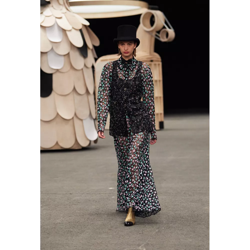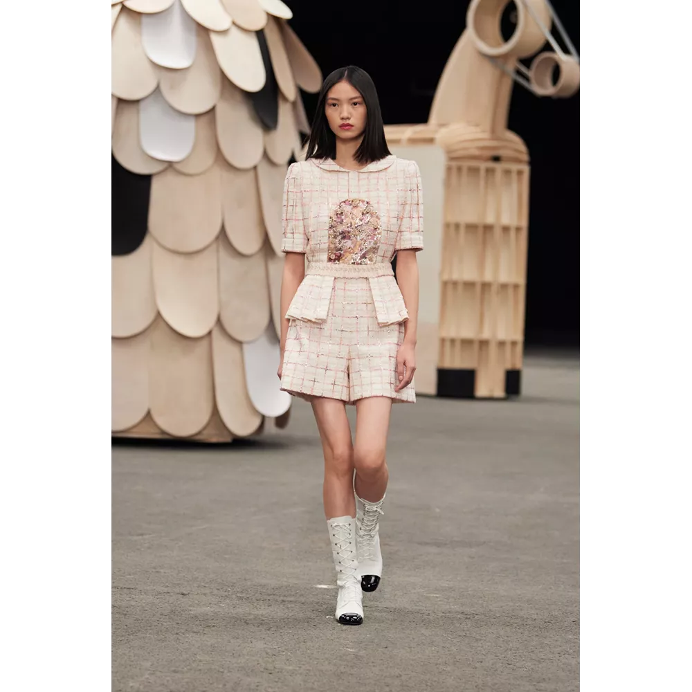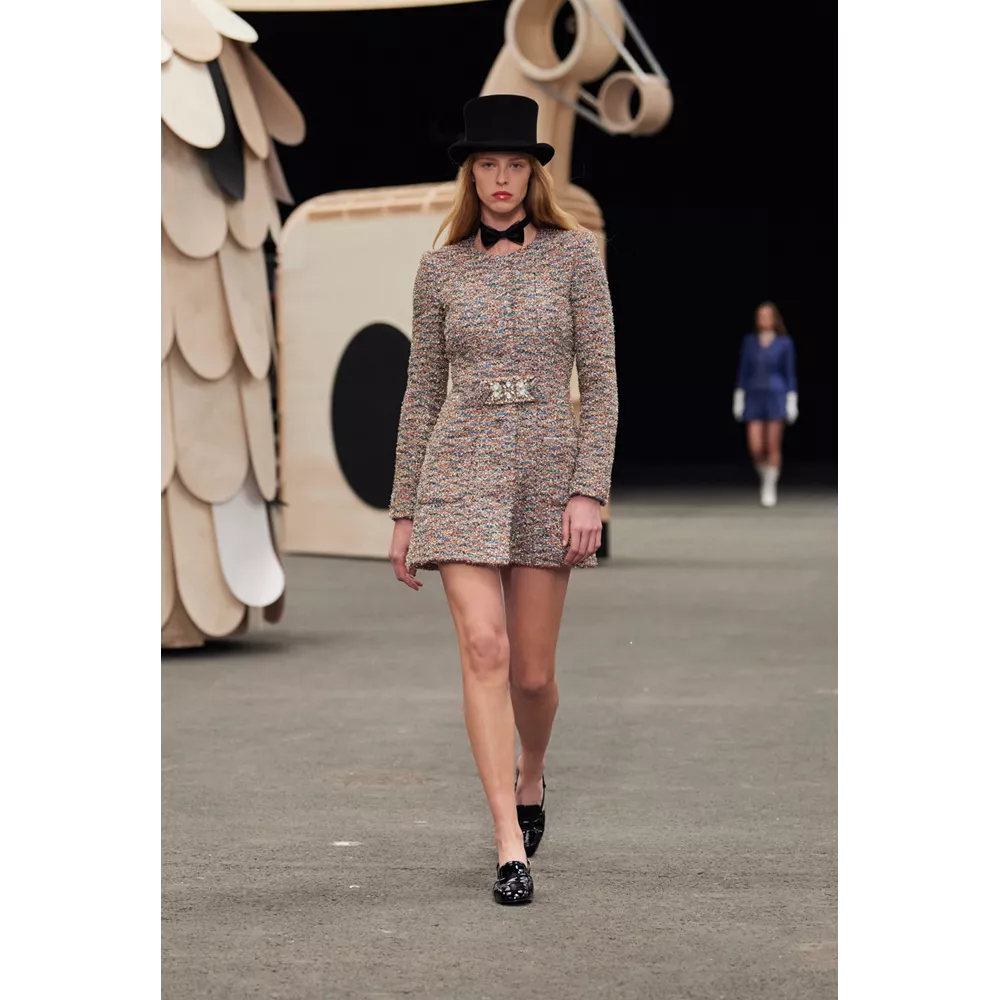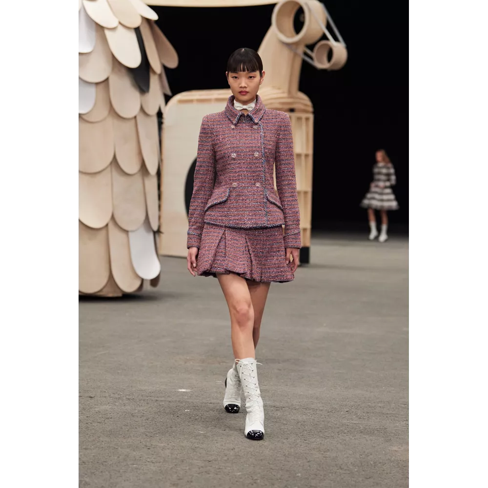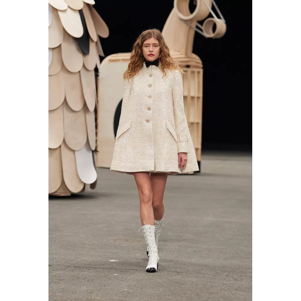 To show που φιλοξενήθηκε στο Grand Palais Ephemere στο Παρίσι ξεκίνησε με τη εμφάνιση στην πασαρέλα- που έμοιαζε με αρένα γηπέδου- των γιγάντιων ξύλινων κατασκευών που ο Xavier Veilhan εμπνεύστηκε από τα διακοσμητικά στο διαμέρισμα της Chanel. Ως άλλοι Δούρειοι Ίπποι, οι κατασκευές από ξύλο, χαρτόνι και χαρτί που μιμούνται μεταξύ άλλων τη μορφή ενός πουλιού, μίας καμήλας, ενός σκύλου, ενός ελέφαντα και του αγαπημένου τόσο της Viard όσο και το Veilhan, αλόγου, ανοίγουν και από μέσα στους εμφανίζονται τα μοντέλα τα οποία παρουσιάζουν τα πρώτα looks της collection. Την αρχή, βεβαίως, κάνει η Vivienne Rohner με το λευκό tweed coatdress, τα loafers σε λουστρίνι και το ψηλό μαύρο καπέλο με τα οποία την είδαμε και στο teaser της haute couture συλλογής. "Μου αρέσει όταν ένα θαυμαστό ξέσπασμα συμβαίνει εμπρός μας και διακόπτει τη ροή των πραγμάτων", θα πει η Viard για τη σκηνή στην έναρξη του show.