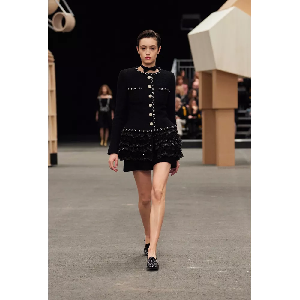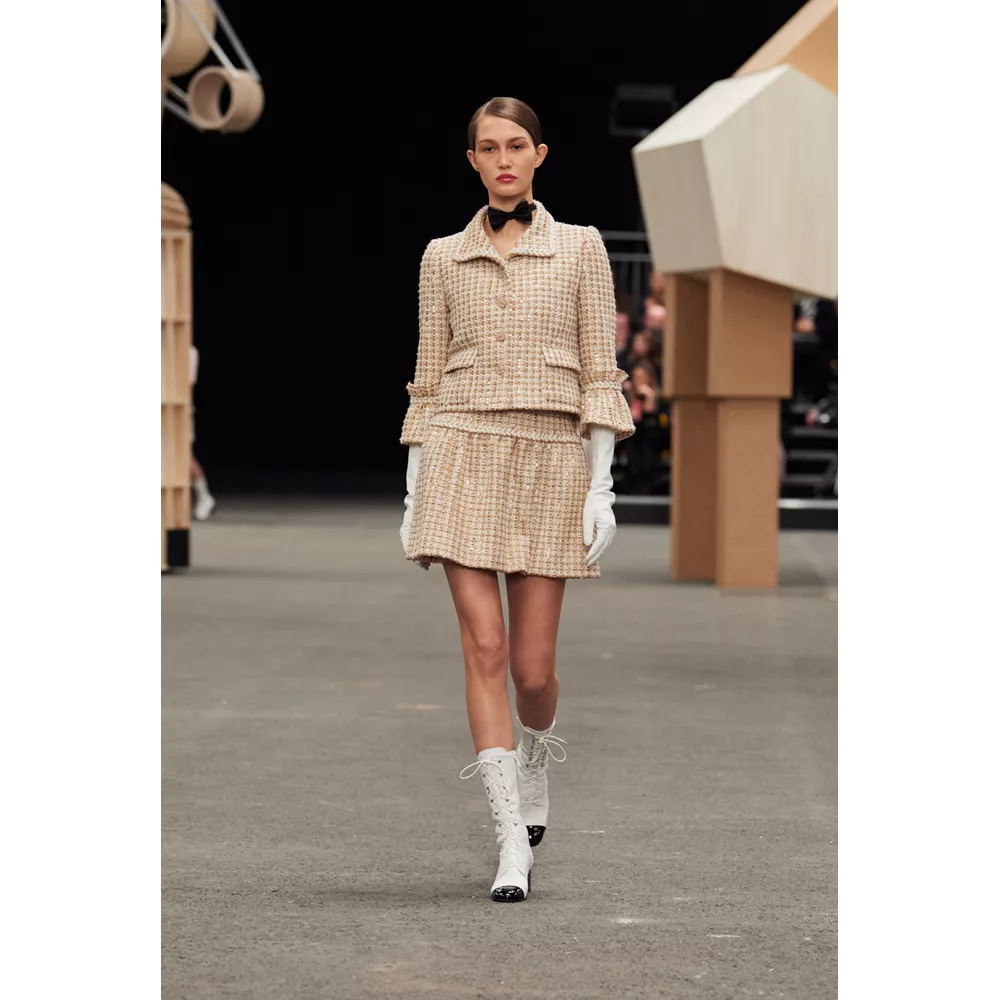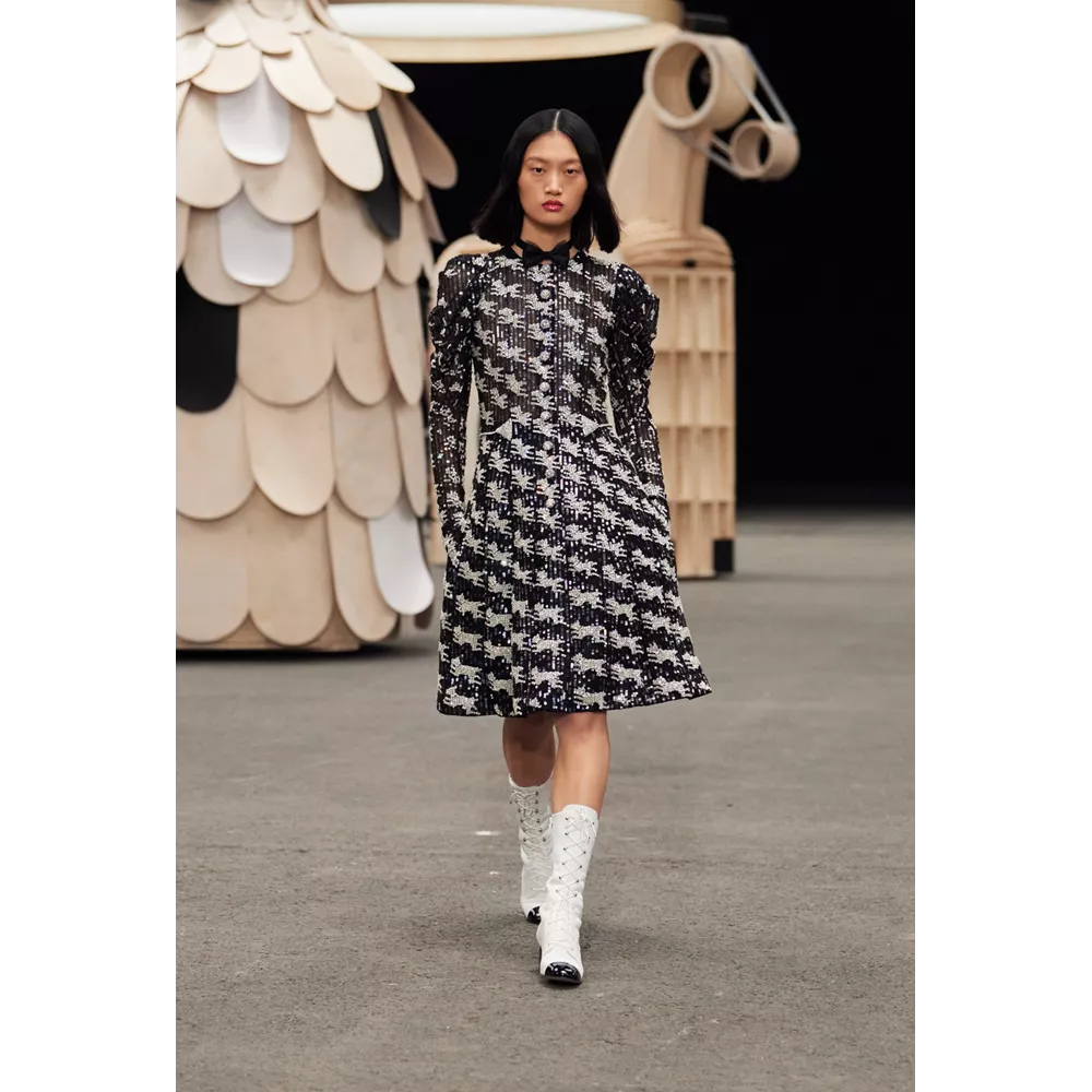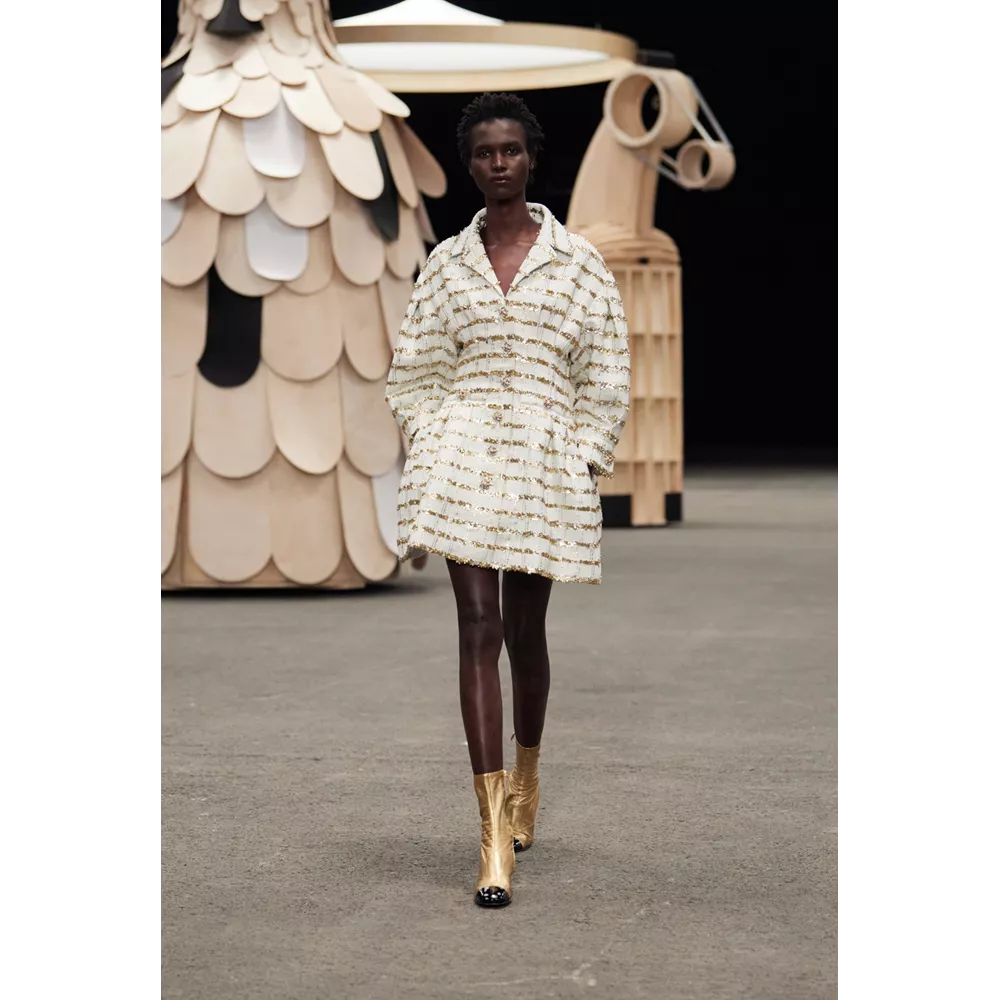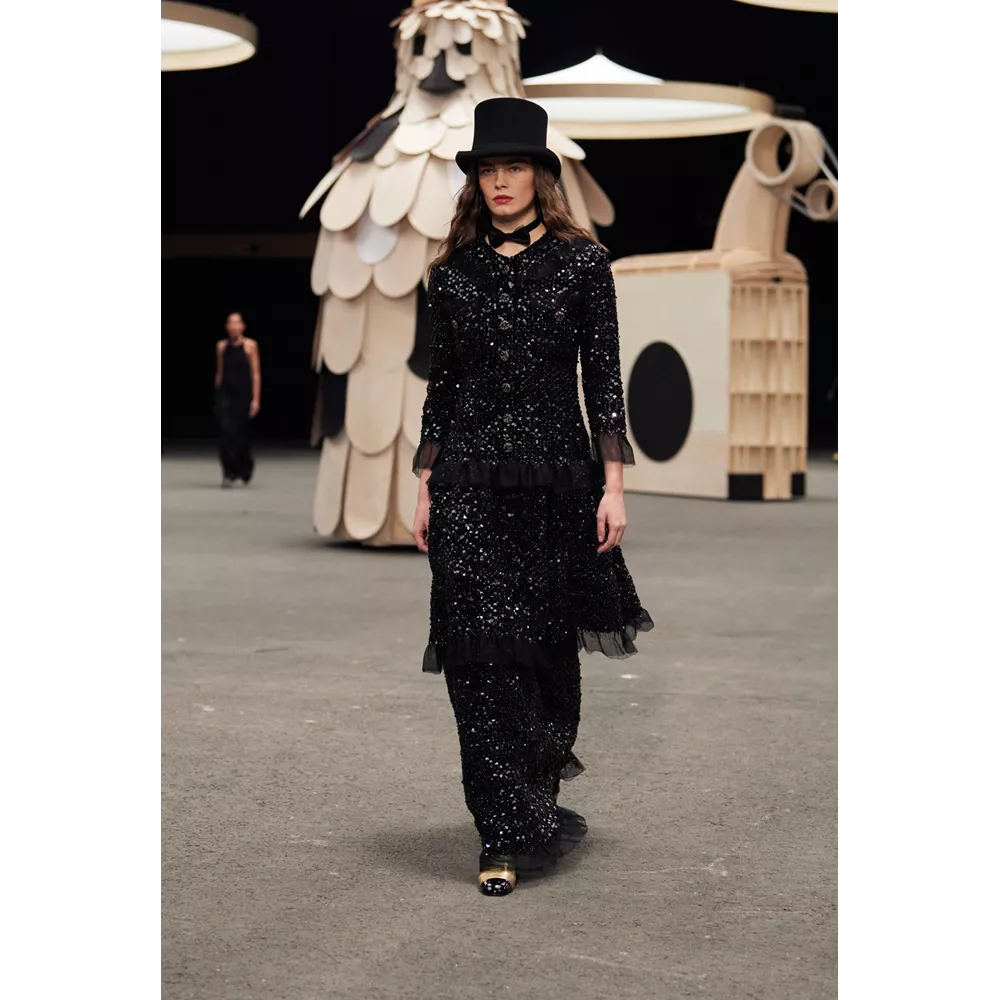 To show που φιλοξενήθηκε στο Grand Palais Ephemere στο Παρίσι ξεκίνησε με τη εμφάνιση στην πασαρέλα- που έμοιαζε με αρένα γηπέδου- των γιγάντιων ξύλινων κατασκευών που ο Xavier Veilhan εμπνεύστηκε από τα διακοσμητικά στο διαμέρισμα της Chanel. Ως άλλοι Δούρειοι Ίπποι, οι κατασκευές από ξύλο, χαρτόνι και χαρτί που μιμούνται μεταξύ άλλων τη μορφή ενός πουλιού, μίας καμήλας, ενός σκύλου, ενός ελέφαντα και του αγαπημένου τόσο της Viard όσο και το Veilhan, αλόγου, ανοίγουν και από μέσα στους εμφανίζονται τα μοντέλα τα οποία παρουσιάζουν τα πρώτα looks της collection. Την αρχή, βεβαίως, κάνει η Vivienne Rohner με το λευκό tweed coatdress, τα loafers σε λουστρίνι και το ψηλό μαύρο καπέλο με τα οποία την είδαμε και στο teaser της haute couture συλλογής. "Μου αρέσει όταν ένα θαυμαστό ξέσπασμα συμβαίνει εμπρός μας και διακόπτει τη ροή των πραγμάτων", θα πει η Viard για τη σκηνή στην έναρξη του show.