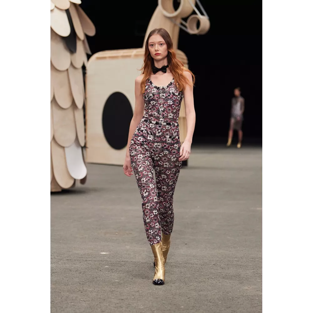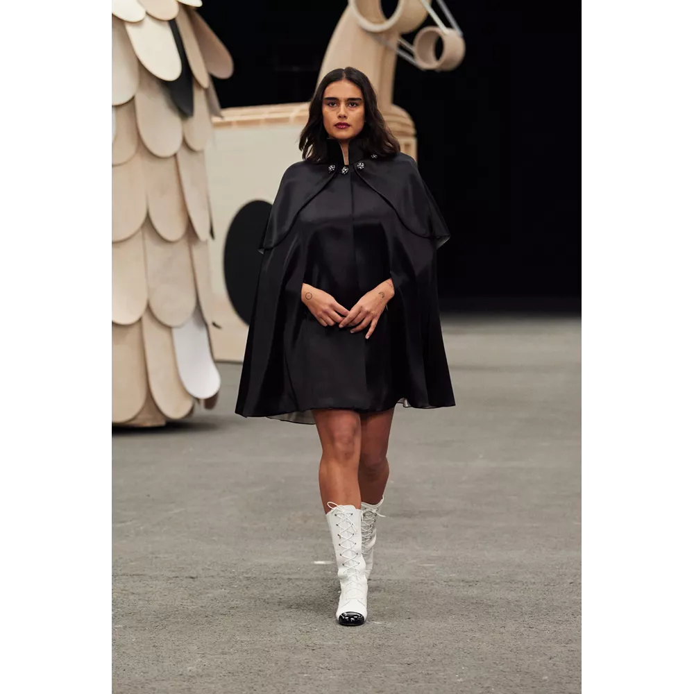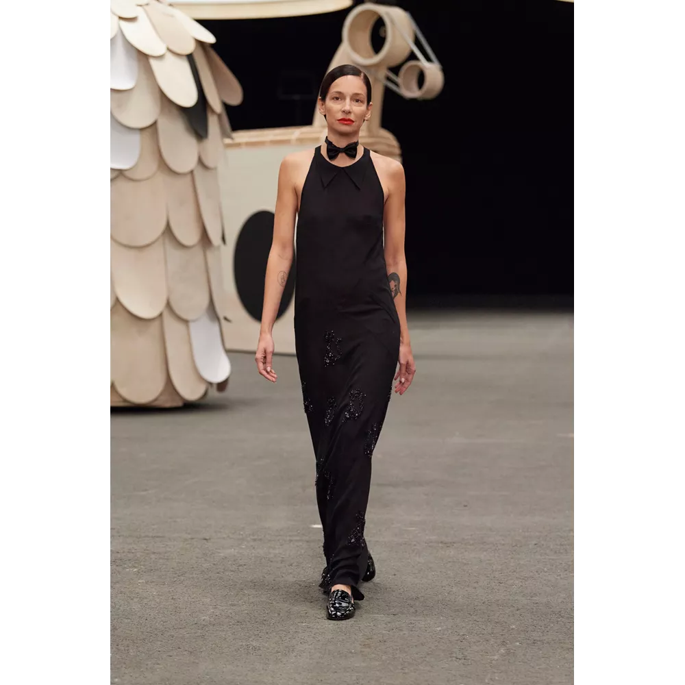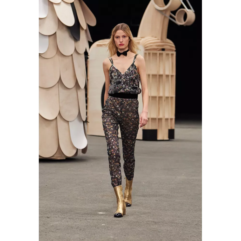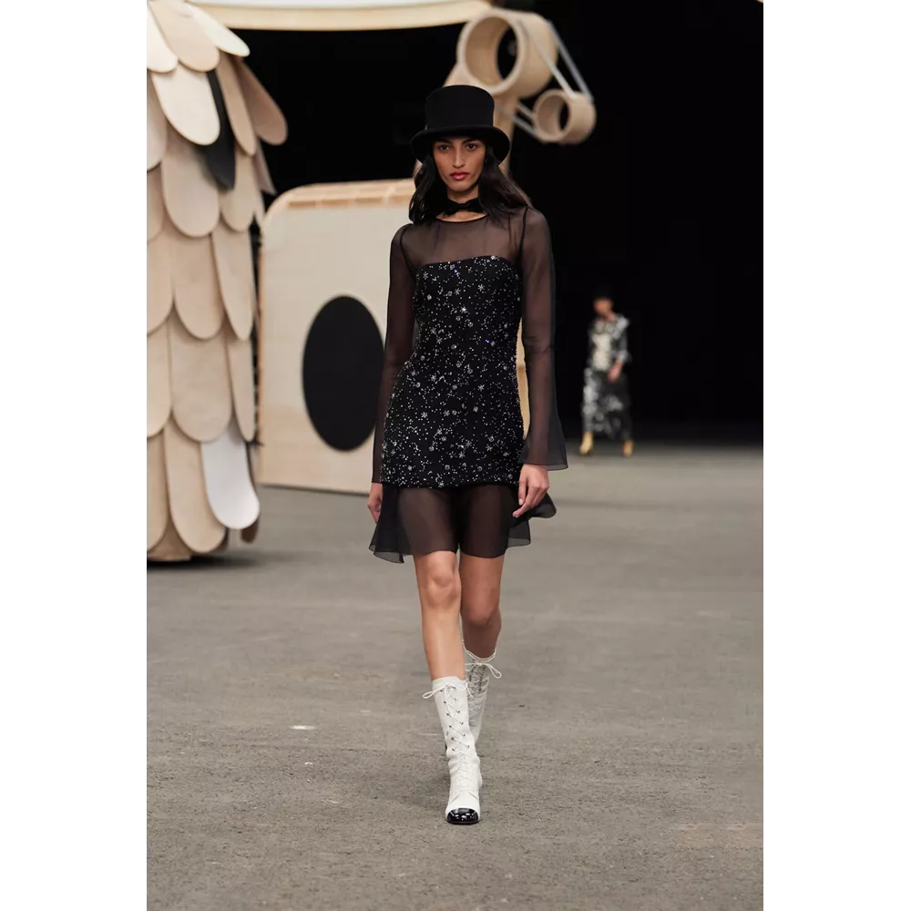 To show που φιλοξενήθηκε στο Grand Palais Ephemere στο Παρίσι ξεκίνησε με τη εμφάνιση στην πασαρέλα- που έμοιαζε με αρένα γηπέδου- των γιγάντιων ξύλινων κατασκευών που ο Xavier Veilhan εμπνεύστηκε από τα διακοσμητικά στο διαμέρισμα της Chanel. Ως άλλοι Δούρειοι Ίπποι, οι κατασκευές από ξύλο, χαρτόνι και χαρτί που μιμούνται μεταξύ άλλων τη μορφή ενός πουλιού, μίας καμήλας, ενός σκύλου, ενός ελέφαντα και του αγαπημένου τόσο της Viard όσο και το Veilhan, αλόγου, ανοίγουν και από μέσα στους εμφανίζονται τα μοντέλα τα οποία παρουσιάζουν τα πρώτα looks της collection. Την αρχή, βεβαίως, κάνει η Vivienne Rohner με το λευκό tweed coatdress, τα loafers σε λουστρίνι και το ψηλό μαύρο καπέλο με τα οποία την είδαμε και στο teaser της haute couture συλλογής. "Μου αρέσει όταν ένα θαυμαστό ξέσπασμα συμβαίνει εμπρός μας και διακόπτει τη ροή των πραγμάτων", θα πει η Viard για τη σκηνή στην έναρξη του show.