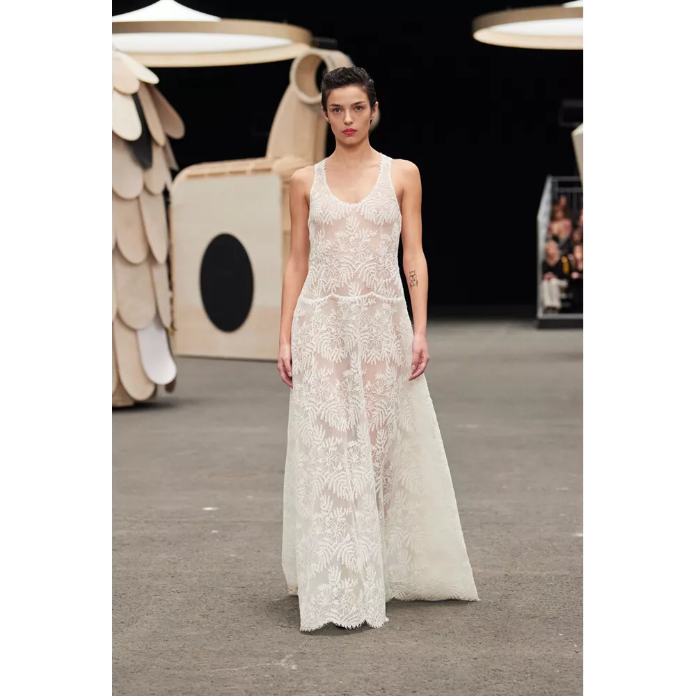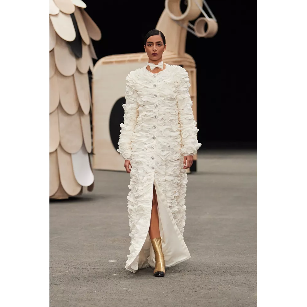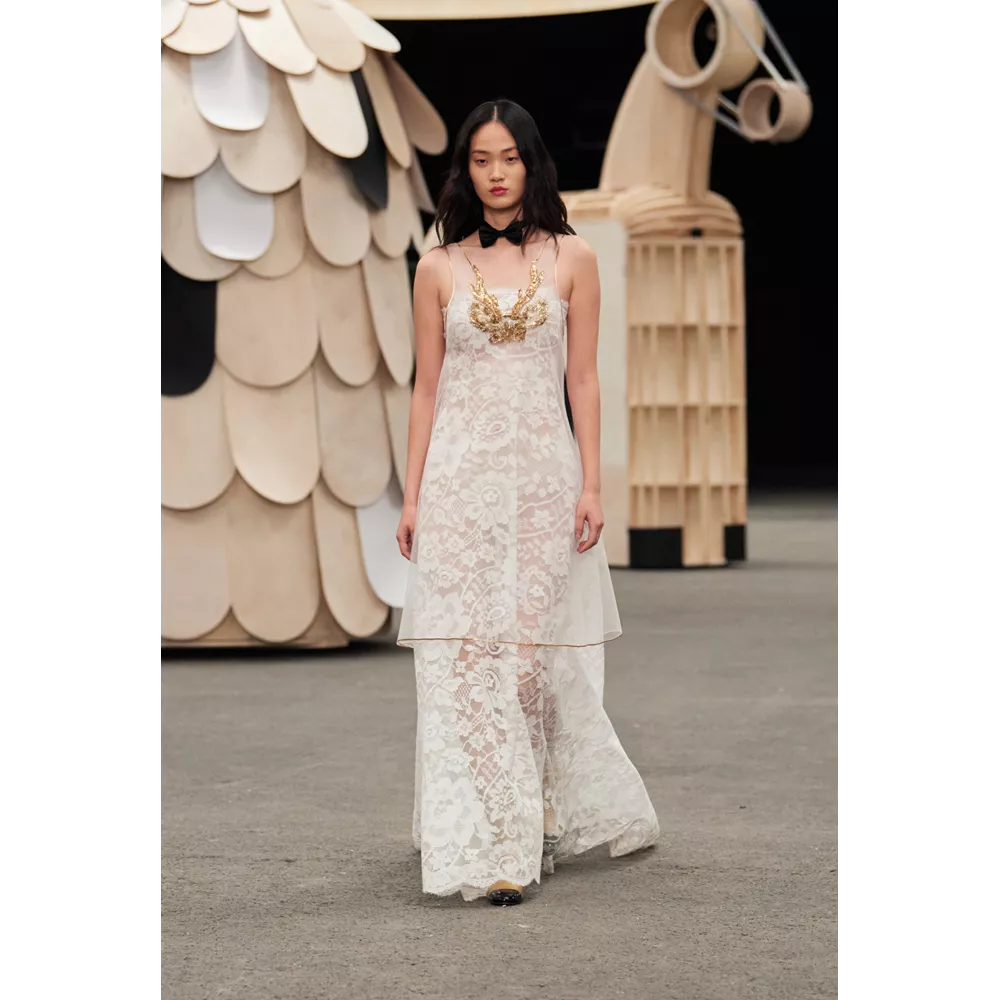 Ντελικάτα αέρινα φορέματα από διαφάνεια και δαντέλα, εμπριμέ ολόσωμες φόρμες, ογκώδη φούστες με φραμπαλά που καταλήγουν σε τιράντες και θυμίζουν σαλοπέτα, μακριές ημιδιαφανείς πουκαμίσες, φορέματα με πολλά επίπεδα, και διαφάνειες σε layering με άλλες διαφάνειες ή δαντέλες συμπληρώνουν την haute couture SS'23 συλλογή της Chanel, που αξιοποιεί σ' αυτές τις - πιο βραδινές - δημιουργίες της υφάσματα όπως το μεταξωτό τούλι, ο ταφτάς, η οργάντζα, η ζορζέτα και η chantilly δαντέλα. Όσο για τη νύφη της Chanel, σ' αυτή ανήκει ένα από τα ωραιότερα looks της συλλογής: ένα λευκό μίνι sheer φόρεμα κεντημένο με χελιδόνια, όπως και το πέπλο που το συμπληρώνει, και φορεμένα με χρυσές two-tone μπότες.