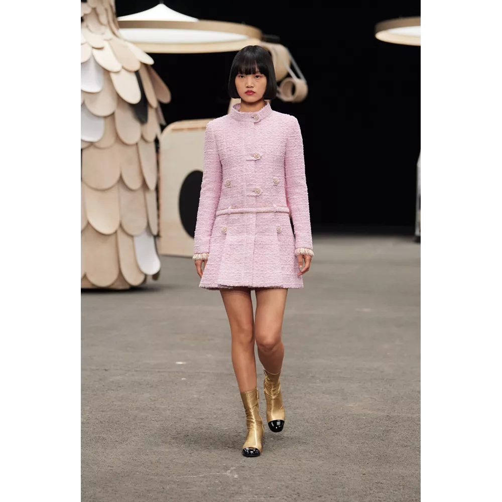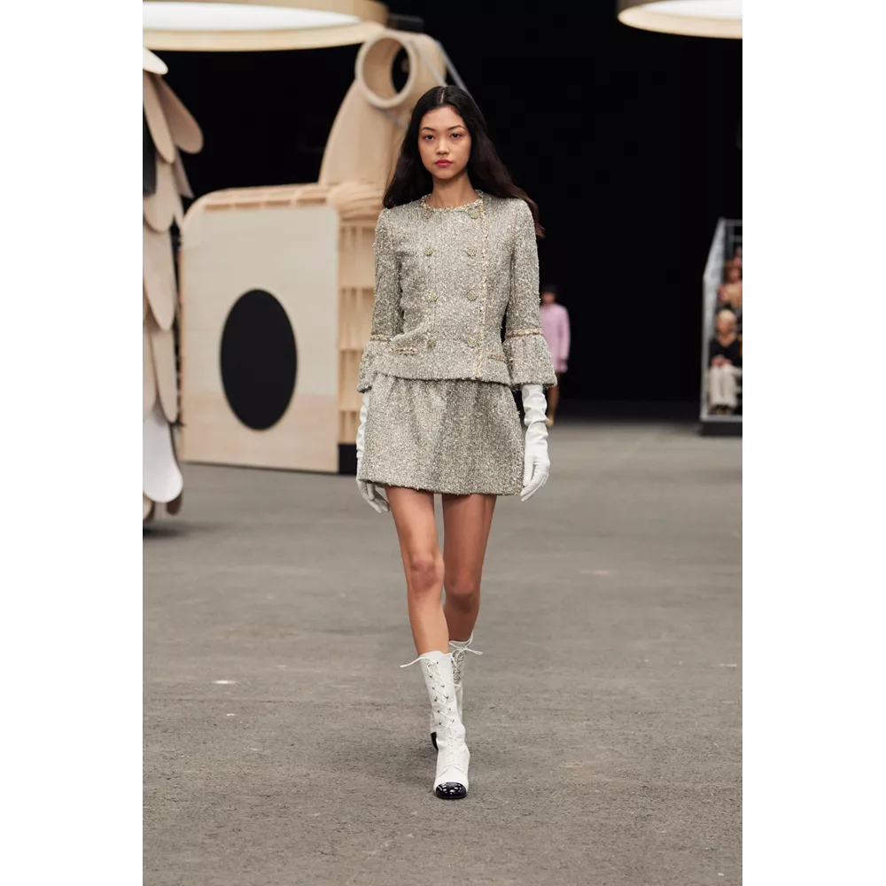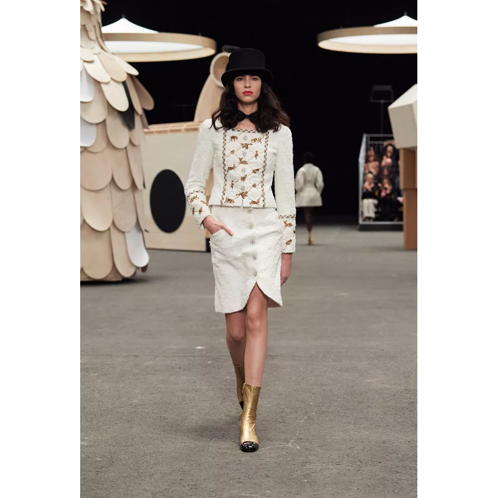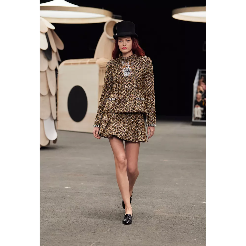 Τα coatdresses όπως και τα tweed κοστούμια (με μίνι φούστες και σορτς) είναι κυρίαρχα στη συλλογή. Και έρχονται, όπως μας έχει προϊδεάσει η Viard, κεντημένα με σχέδια από γατάκια, σκυλάκια corgis, λαγούς και χελιδόνια που μοιράζονται τον ίδιο πρωταγωνιστικό ρόλο με τα ελάφια και τις καμέλιες που είναι εμβληματικά του οίκου. To κοστούμι Chanel που προτείνει εδώ η Viard δανείζεται στοιχεία από τις στολές σε παρελάσεις κι άλλα θεάματα. Ψηλά καπέλα, παπιγιόν, λευκά γάντια, lace up μποτάκια, σατέν κάπες, πλισέ φούστες, σακάκια με διπλή σειρά κουμπιών ή με ουρά (τύπου φράκο), tuxedo πουκάμισα, πούλιες, κοντά σορτς και μεσοφόρια χαρίζουν τη μαγεία στα looks της νέας συλλογής, ενώ η καλλιτεχνική διευθύντρια της Chanel προσθέτει στην έμπνευσή της την ποίηση- όπως θα πει- που συναντά κανείς στον κόσμο των μαζορετών.
