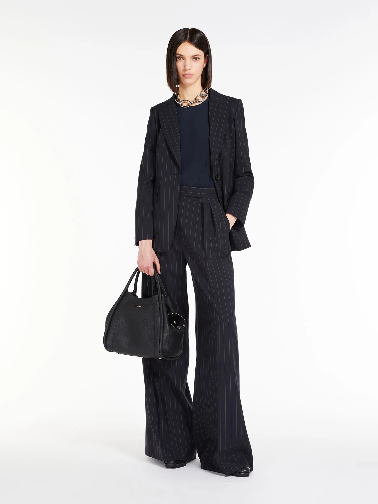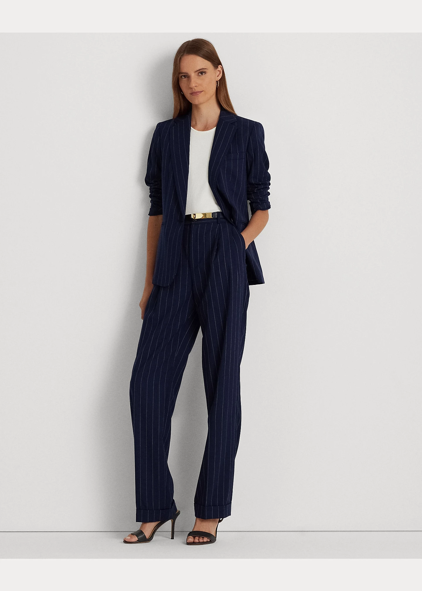 Σταυρωτό ανοιχτό σακάκι κουστουμιού με ρίγα pinstripe και παντελόνι κουστουμιού με ρίγα pinstripe και πιέτες, Massimo Dutti.