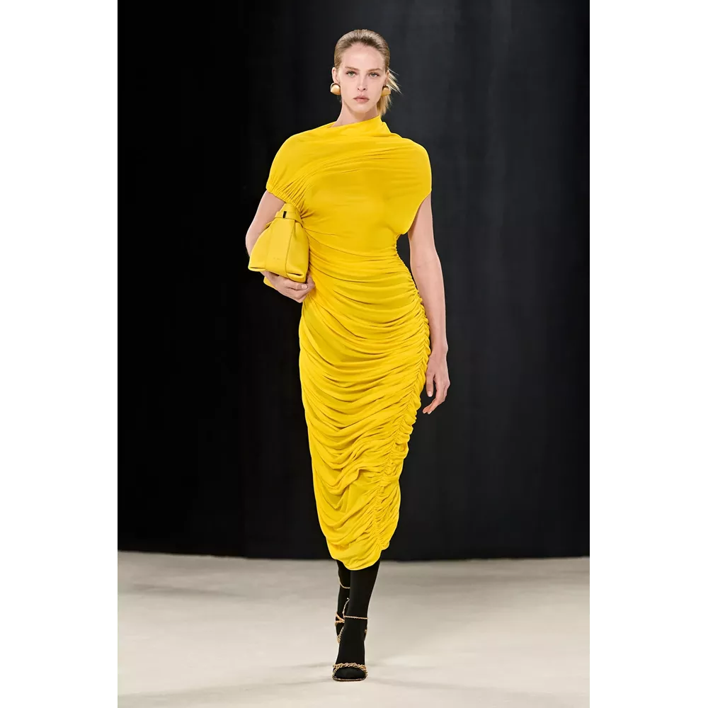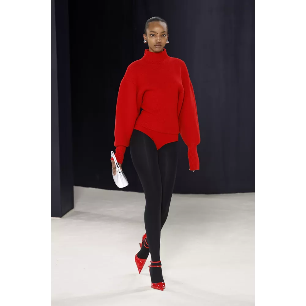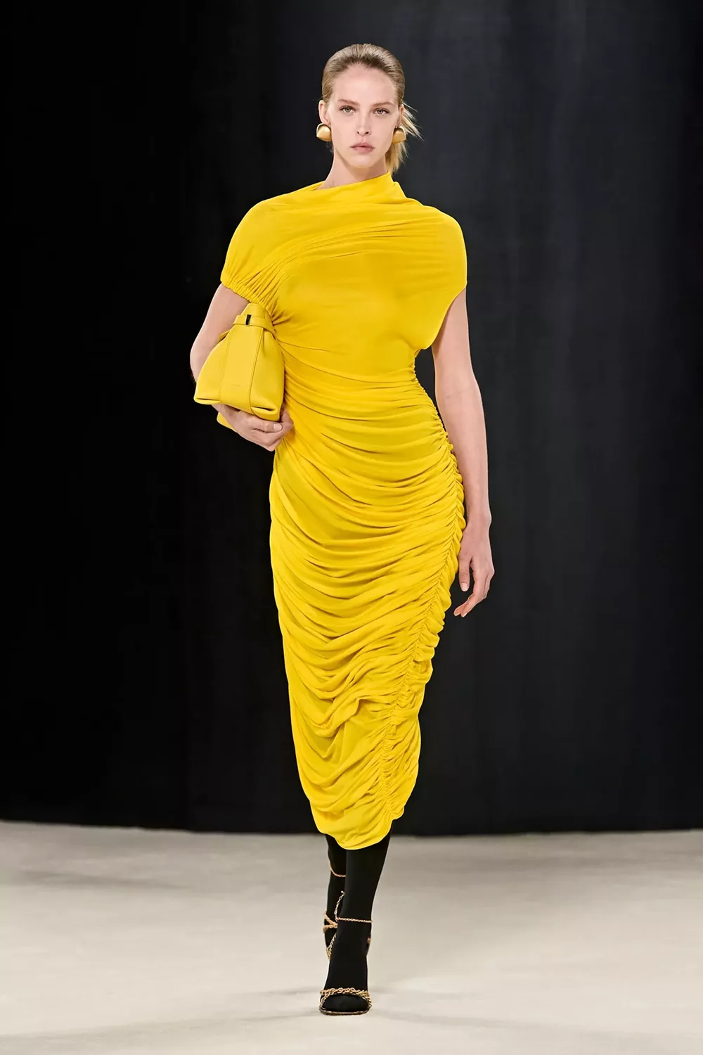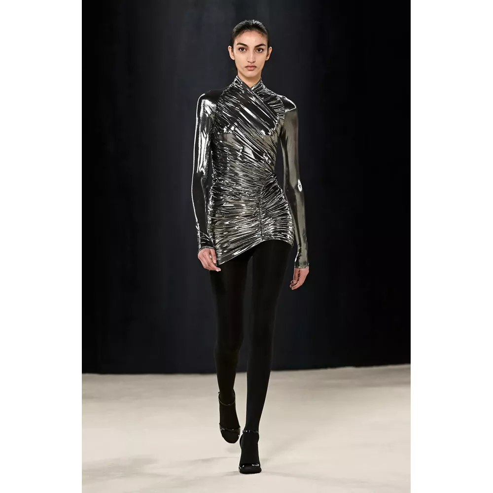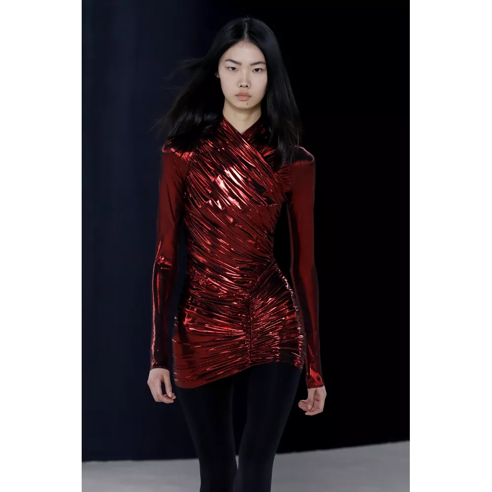 Πέρα, όμως, από τα κομμάτια που θα μπορούσαν να αφορούν το uplifting power dressing και το τολμηρό workwear, η συλλογή αφήνει χώρο και για σύνολα που θα μπορούσαν χωρέσουν στην ταμπέλα του eveningwear, όπως πληθωρικές γούνες φορεμένες με ολόσωμα bodysuits, πλισέ μαύρα φορέματα με κόκκινες πιέτες ή μάξι με βαθύ ντεκολτέ και υφή γούνας, ντελικάτα ντραπέ σε λευκό και κίτρινο χρώμα, και σέξι ruched metallic φορέματα συνδυασμένα με οπάκ μαύρα καλσόν.