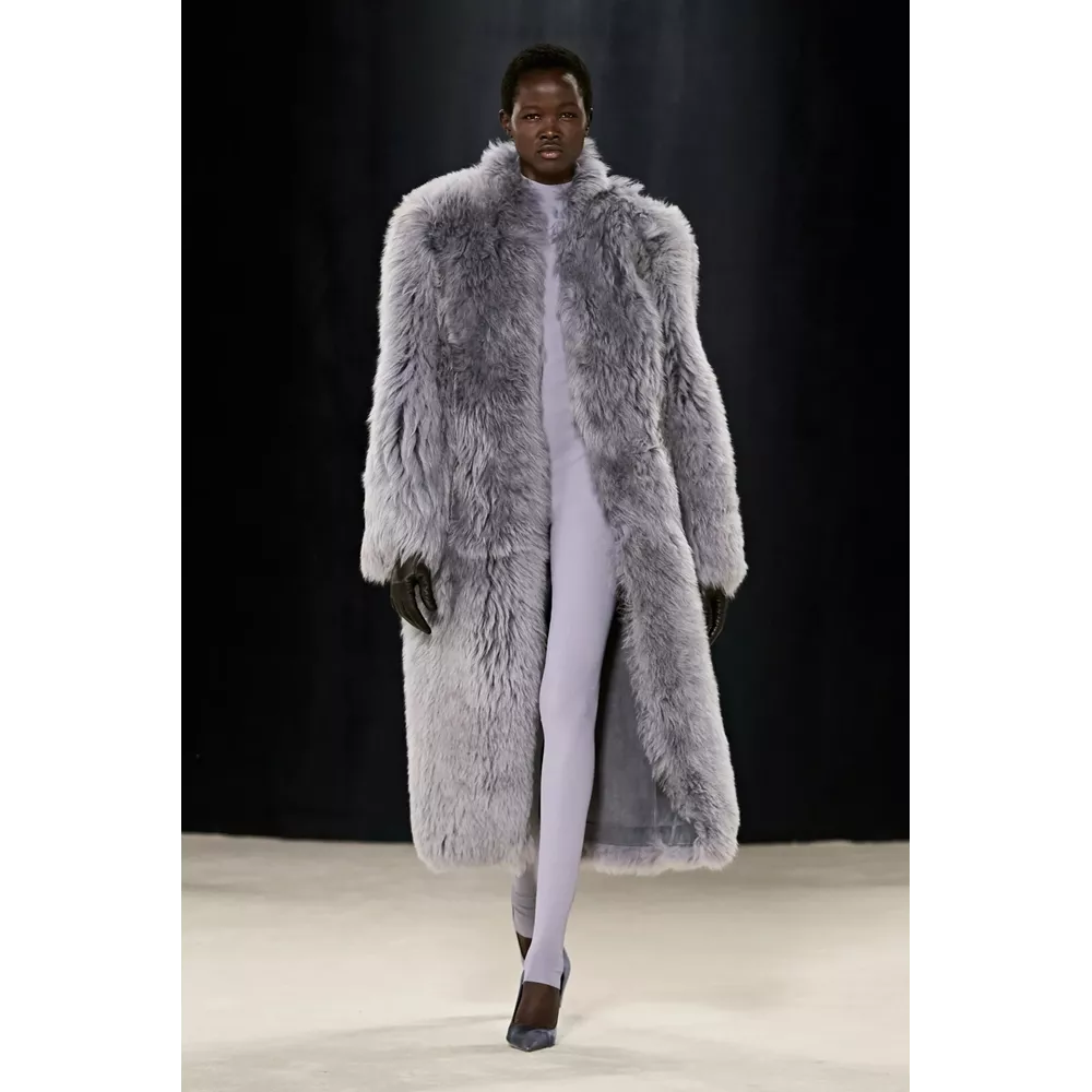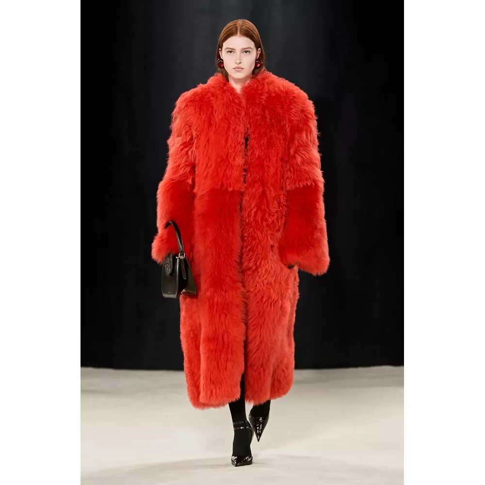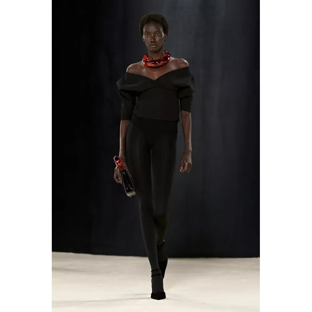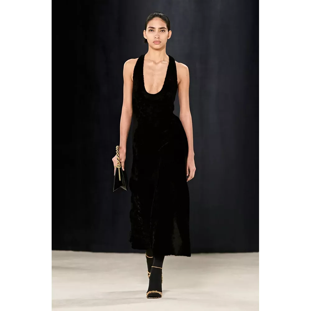 Πέρα, όμως, από τα κομμάτια που θα μπορούσαν να αφορούν το uplifting power dressing και το τολμηρό workwear, η συλλογή αφήνει χώρο και για σύνολα που θα μπορούσαν χωρέσουν στην ταμπέλα του eveningwear, όπως πληθωρικές γούνες φορεμένες με ολόσωμα bodysuits, πλισέ μαύρα φορέματα με κόκκινες πιέτες ή μάξι με βαθύ ντεκολτέ και υφή γούνας, ντελικάτα ντραπέ σε λευκό και κίτρινο χρώμα, και σέξι ruched metallic φορέματα συνδυασμένα με οπάκ μαύρα καλσόν.