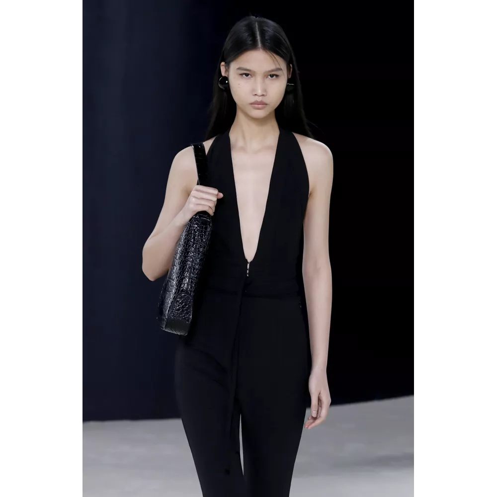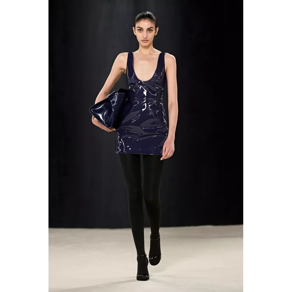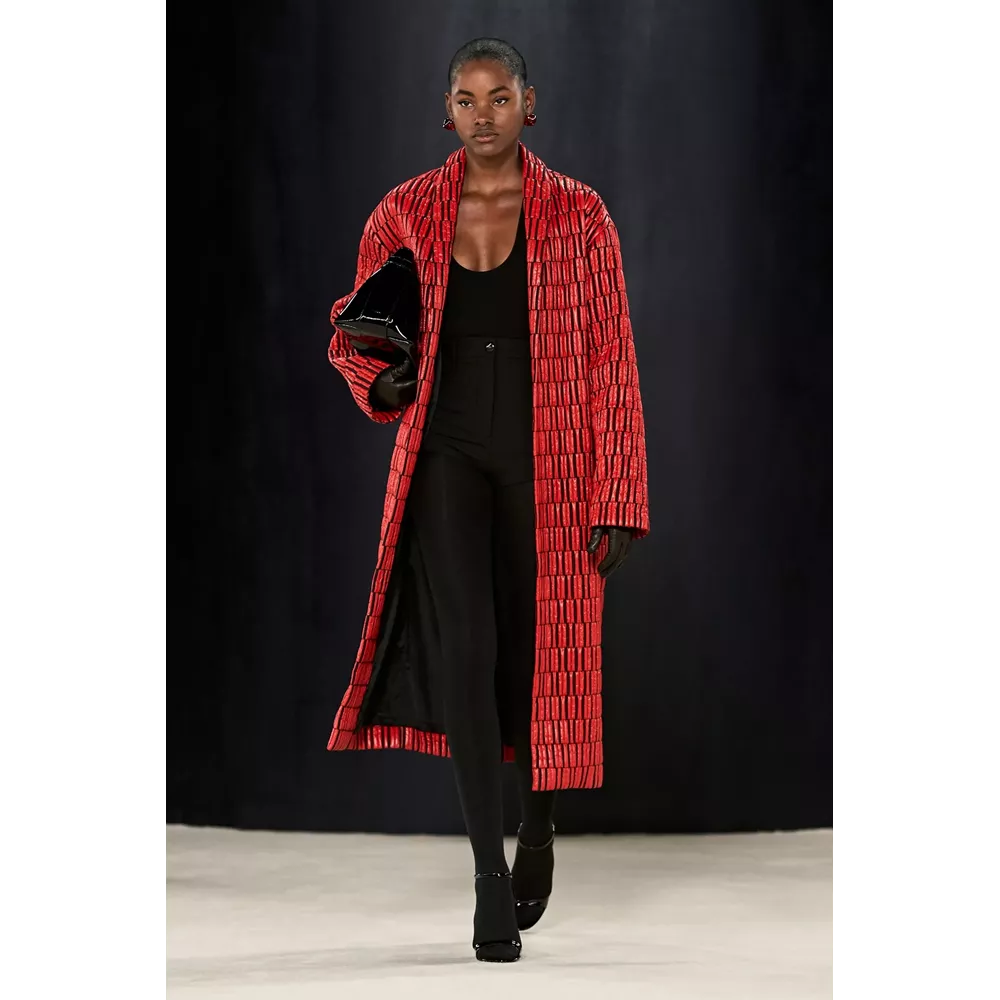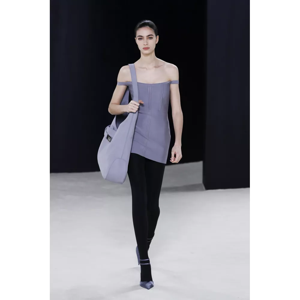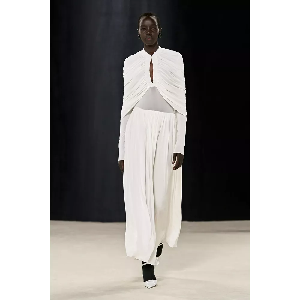 Πέρα, όμως, από τα κομμάτια που θα μπορούσαν να αφορούν το uplifting power dressing και το τολμηρό workwear, η συλλογή αφήνει χώρο και για σύνολα που θα μπορούσαν χωρέσουν στην ταμπέλα του eveningwear, όπως πληθωρικές γούνες φορεμένες με ολόσωμα bodysuits, πλισέ μαύρα φορέματα με κόκκινες πιέτες ή μάξι με βαθύ ντεκολτέ και υφή γούνας, ντελικάτα ντραπέ σε λευκό και κίτρινο χρώμα, και σέξι ruched metallic φορέματα συνδυασμένα με οπάκ μαύρα καλσόν.