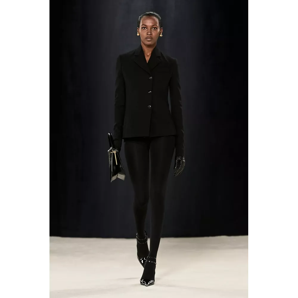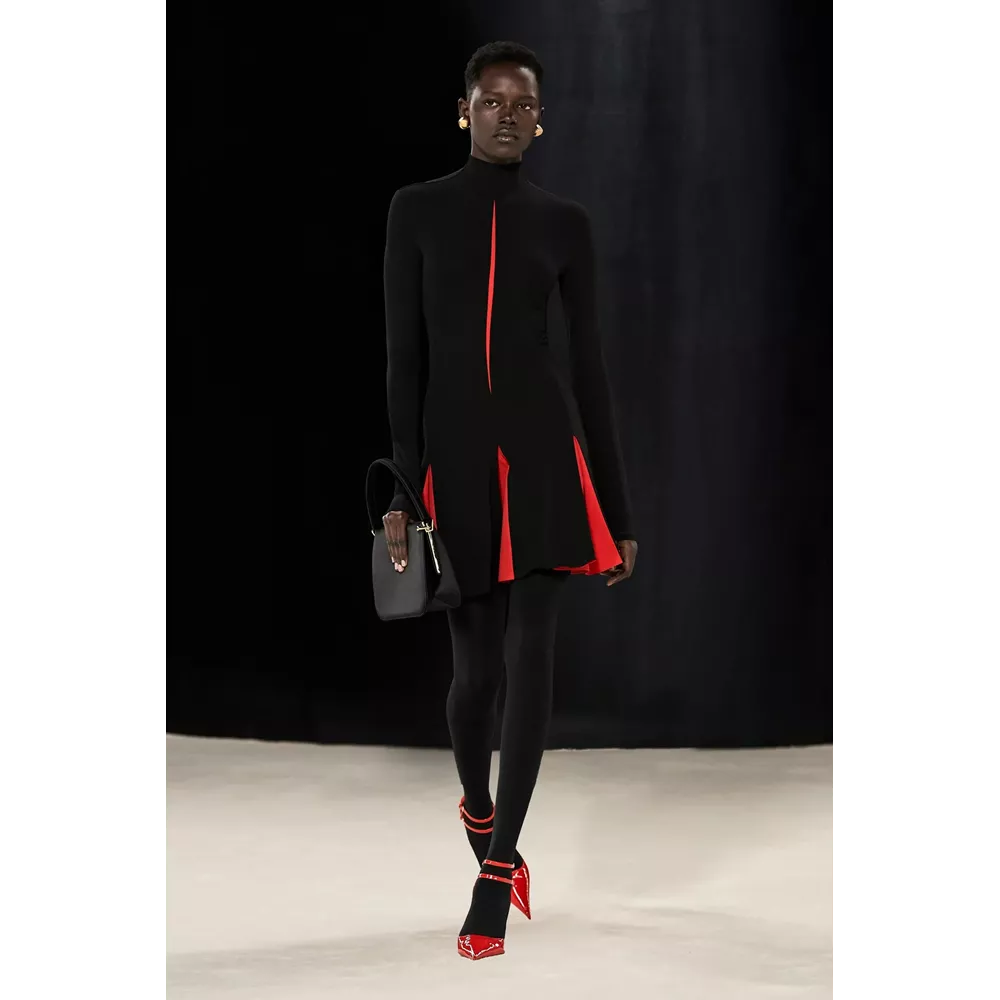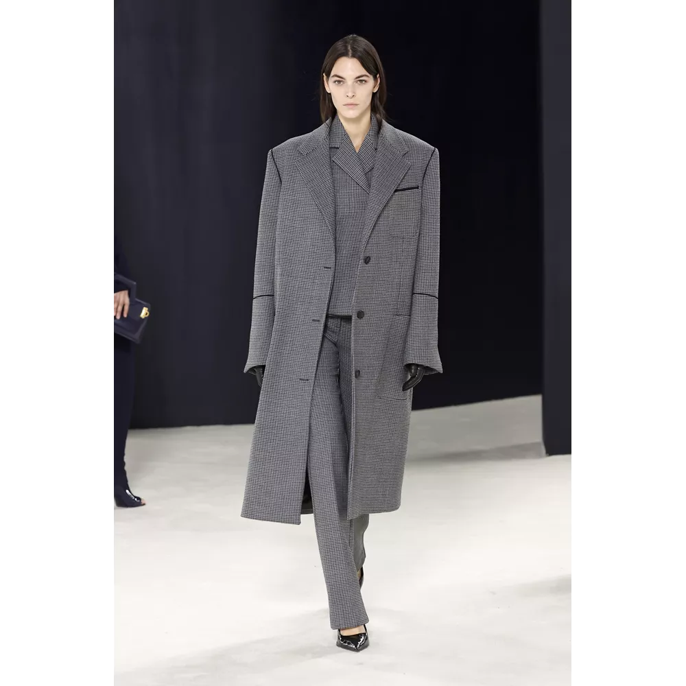 Αν μπορούμε να συνοψίσουμε σε λίγες λέξεις αυτά που εντυπωσιάζουν με την πρώτη ματιά στη συλλογή θα σχολιάζαμε οι καθαρές γραμμές, τα εκλεπτισμένα twists και η χρωματική παλέτα (που περιορίζεται στα nany, γκρι, μαύρο και λευκό, κάνοντας μία εξαίρεση για το signature του οίκου κόκκινο, για περιορισμένα κίτρινα κομμάτια και κάποιες προτάσεις σε καφέ). Η συλλογή ανοίγει μ' ένα ριχτό navy blue παλτό με wrap γιακά που συγκρατούν δυο στρογγυλά metallic κουμπιά, ενώ το look ολοκληρώνεται από ένα knit catsuit στο ίδιο χρώμα με το παλτό, δερμάτινα γάντια και μαύρες κλασικές γόβες σε λουστρίνι. Super chic, χωρίς αμφιβολία, το σύνολο δημιουργεί υψηλές προσδοκίες με το "καλημέρα" σας και η συνέχεια δεν απογοητεύει: μονοχρωματικά σετ που συνδυάζουν κολάν και balloon sleeve μπλούζες με κουμπιά (και θα μπορούσαν να είναι το στιλ μιας μοντέρνας ξιφομάχου) και ολοκληρώνονται με κομψά mules σε λουστρίνι, tailored παλτό με αποσπώμενες κουκούλες τοποθετημένες στους ώμους σαν εσάρπα, γκρι καρό κοστούμια συνδυασμένα σε layering με ασορτί παλτό και διακριτικές "χαρακιές" στα μανίκια, κομψά slim fit σακάκια (ή πουλόβερ) φορεμένα με hot pants και οπάκ μαύρα καλσόν, σουέτ καμπαρντίνες με rib - knit ανασηκωμένους γιακάδες και άλλες με zip λεπτομέρειες στα μανίκια που αποκαλύπτουν την εσωτερική επένδυση δημιουργώντας το two-tones εφέ συνθέτουν τη γκαρνταρόμπα του μοντέρνου, δυναμικού power dressing.