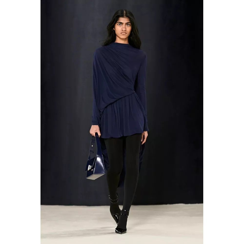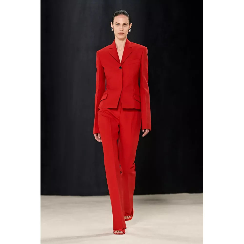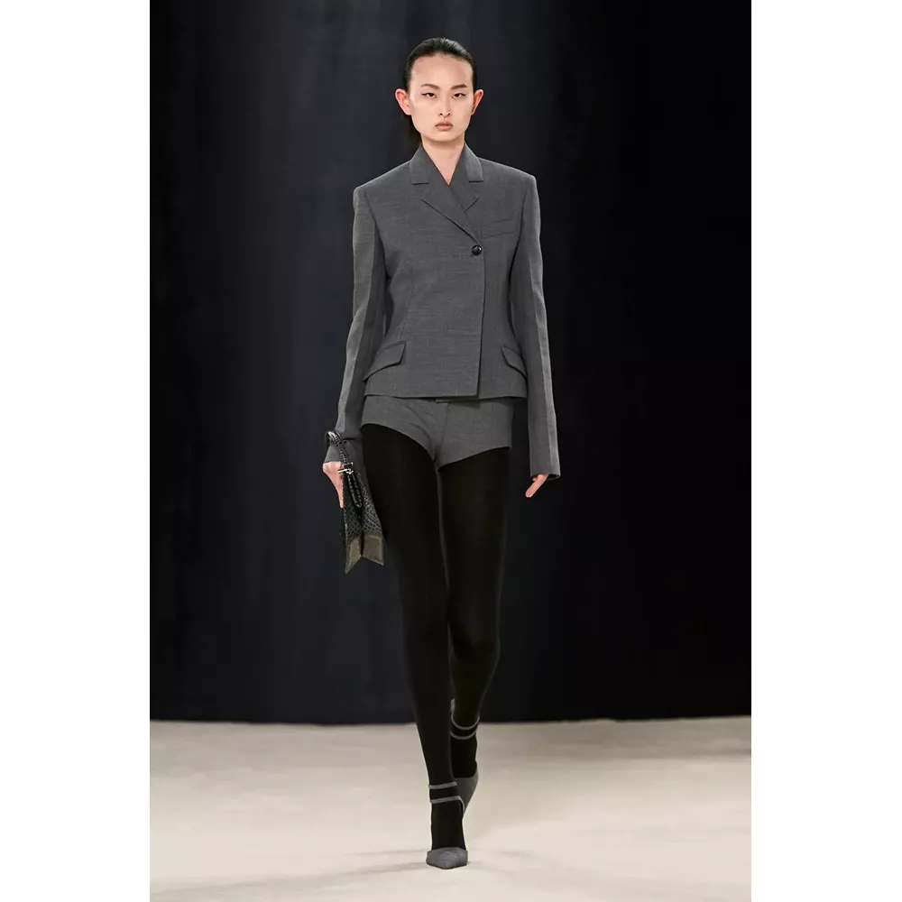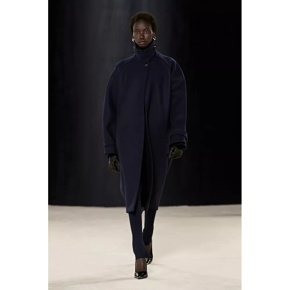 Αν μπορούμε να συνοψίσουμε σε λίγες λέξεις αυτά που εντυπωσιάζουν με την πρώτη ματιά στη συλλογή θα σχολιάζαμε οι καθαρές γραμμές, τα εκλεπτισμένα twists και η χρωματική παλέτα (που περιορίζεται στα nany, γκρι, μαύρο και λευκό, κάνοντας μία εξαίρεση για το signature του οίκου κόκκινο, για περιορισμένα κίτρινα κομμάτια και κάποιες προτάσεις σε καφέ). Η συλλογή ανοίγει μ' ένα ριχτό navy blue παλτό με wrap γιακά που συγκρατούν δυο στρογγυλά metallic κουμπιά, ενώ το look ολοκληρώνεται από ένα knit catsuit στο ίδιο χρώμα με το παλτό, δερμάτινα γάντια και μαύρες κλασικές γόβες σε λουστρίνι. Super chic, χωρίς αμφιβολία, το σύνολο δημιουργεί υψηλές προσδοκίες με το "καλημέρα" σας και η συνέχεια δεν απογοητεύει: μονοχρωματικά σετ που συνδυάζουν κολάν και balloon sleeve μπλούζες με κουμπιά (και θα μπορούσαν να είναι το στιλ μιας μοντέρνας ξιφομάχου) και ολοκληρώνονται με κομψά mules σε λουστρίνι, tailored παλτό με αποσπώμενες κουκούλες τοποθετημένες στους ώμους σαν εσάρπα, γκρι καρό κοστούμια συνδυασμένα σε layering με ασορτί παλτό και διακριτικές "χαρακιές" στα μανίκια, κομψά slim fit σακάκια (ή πουλόβερ) φορεμένα με hot pants και οπάκ μαύρα καλσόν, σουέτ καμπαρντίνες με rib - knit ανασηκωμένους γιακάδες και άλλες με zip λεπτομέρειες στα μανίκια που αποκαλύπτουν την εσωτερική επένδυση δημιουργώντας το two-tones εφέ συνθέτουν τη γκαρνταρόμπα του μοντέρνου, δυναμικού power dressing.