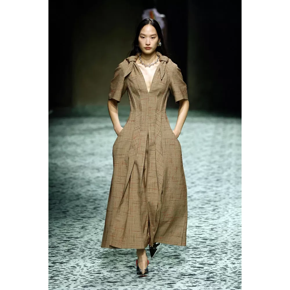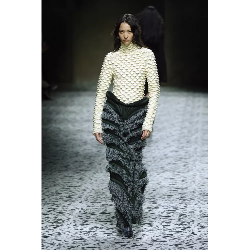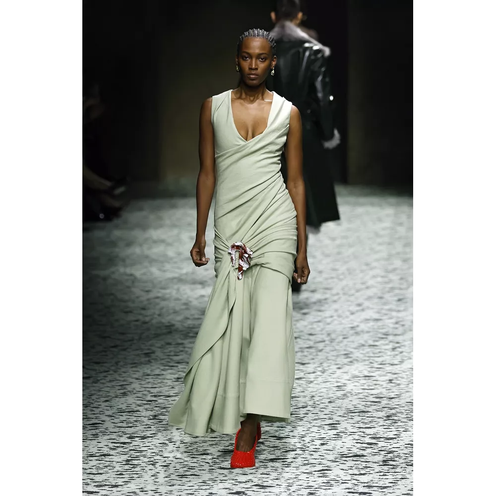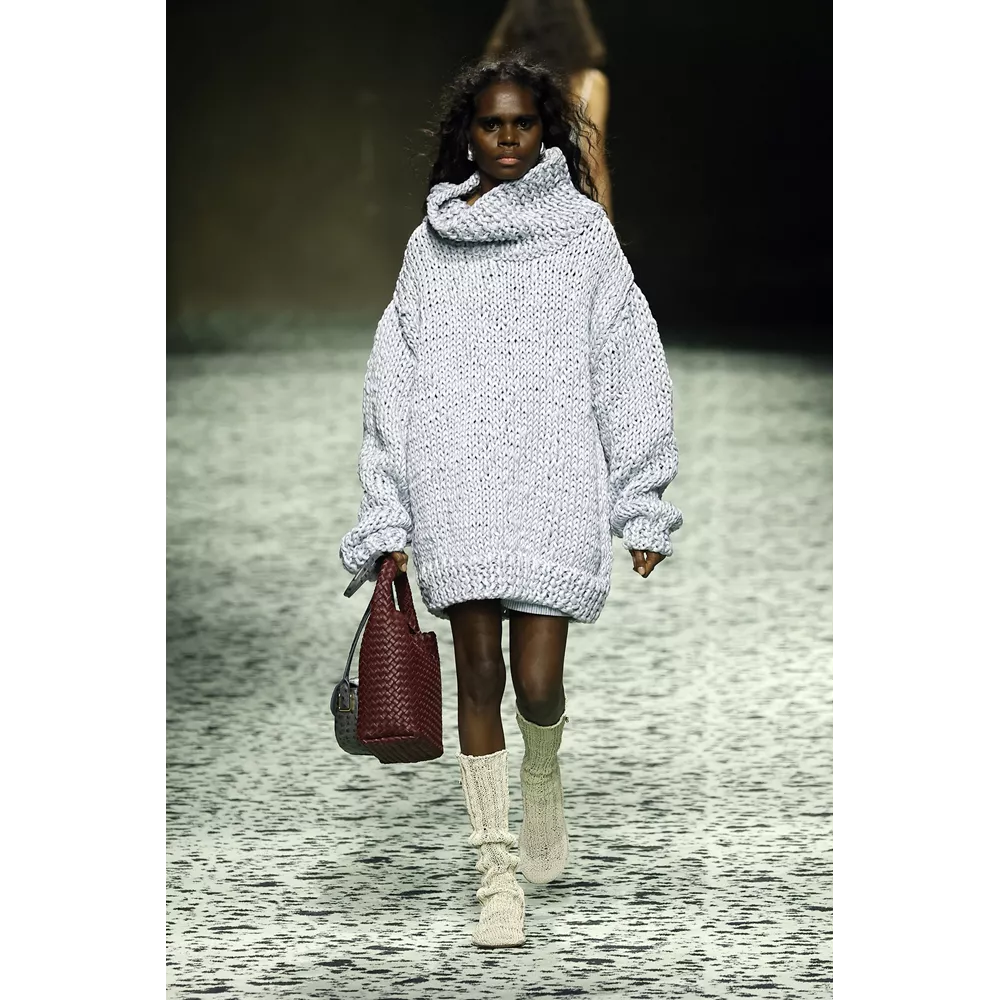 Φυσικά, δεν μπορούμε να παραλείψουμε από τα hightlights της συλλογής α) τα looks που μοιάζουν βγαλμένα από το παραμύθι της Μικρής Γοργόνας, στα οποία πλεκτό ζιβάγκο με λεπτομέρειες που θυμίζουν λέπια συνδυάζεται με μάξι φούστα σε mermaid σιλουέτα τονισμένη ψηλά στους γοφούς και κεντημένη προς τα κάτω με κρόσσια, β) τα pannier φορέματα της συλλογής που τονίζουν τη μέση και τους γοφούς στα πλαϊνά, όπως και γ) τα δεξιοτεχνικά wrap ντραπέ με την αέρινη κίνηση στη φούστα, δ) το έξυπνο layering που εμφανίζεται σε κοστούμια με φούστα και σε σετ με παλτό όπου πάνελ από δέρμα ξεπροβάλλουν διακριτικά και "ήσυχα" κάτω ή μέσα από το κυρίως ένδυμα, και ε) τα πάντα μοναδικά αξεσουάρ, τσάντες και παπούτσια της νέας Bottega Veneta, από την οποία ήδη οι αετομάτηδες της μόδας έχουν ξεχωρίζουν και μιλούν για τα Jelly mules - εμείς θα προσθέσουμε και τις knit μπότες που θυμίζουν πλεκτές κάλτσες και αξιοποιούν τη γνωστή trompe-l'œil τεχνική που καθιέρωσε ο Blazy και πολλά από τα κομμάτια που βλέπουμε στην πασαρέλα δεν αποτελούν παρά το αποτέλεσμα επεξεργασίας δέρματος- ναι, αυτές οι μπότες δεν είναι πλεκτές, είναι δερμάτινες!