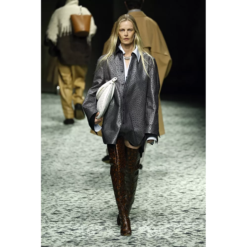 Η συλλογή Bottega Veneta για τη σεζόν Φθινόπωρο – Χειμώνας 2023 παρουσιάστηκε στα κεντρικά του οίκου στην Piazza San Fedele και όλοι όσοι έδωσαν το παρών δεν παρέλειψαν να αναφερθούν στα μπρούντζινα ρωμαϊκά αγάλματα δρομέων (του 1 αιώνα μ.Χ), όπως και στο μπρούτζινο γλυπτό "Unique Forms of Continuity in Space" του Umberto Boccioni (1913) που δανείστηκε ο οίκος από μουσεία και τοποθέτησε στο runway- προσφέροντας, βεβαίως, στους καλεσμένους του show τη δυνατότητα να τα παρατηρήσουν και θαυμάσουν από κοντά πριν την έναρξη της πασαρέλας. [ Σημ.: η φουτουριστική μορφή του γλυπτού του Boccioni, που απεικονίζει μία εν κινήσει φιγούρα είχε δανείσει την έμπνευση για τις ριζοσπαστικές σιλουέτες που μιμούνται την κίνηση τη συλλογή με την οποία ο Blazy έκανε το ντεμπούτο του στον οίκο.]